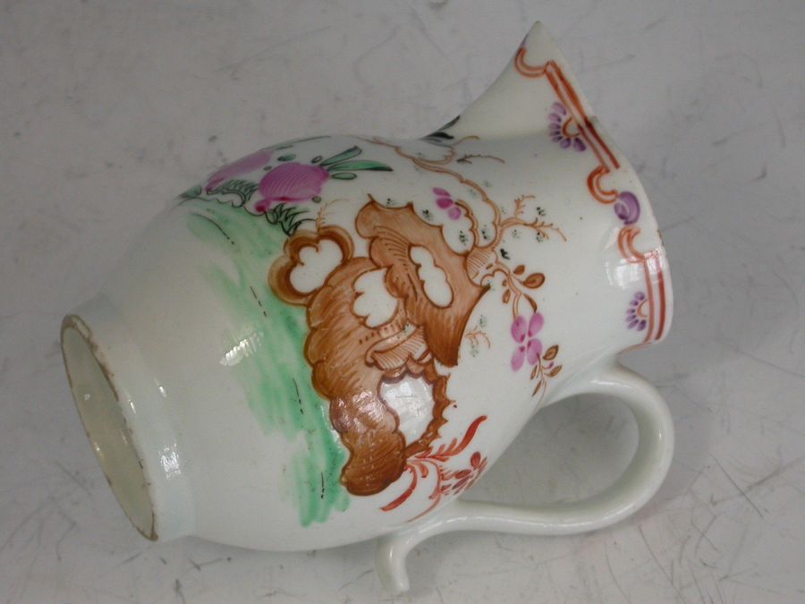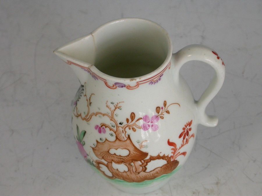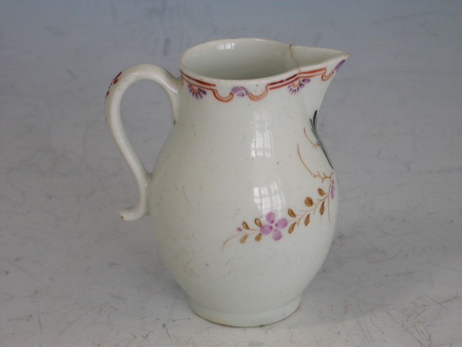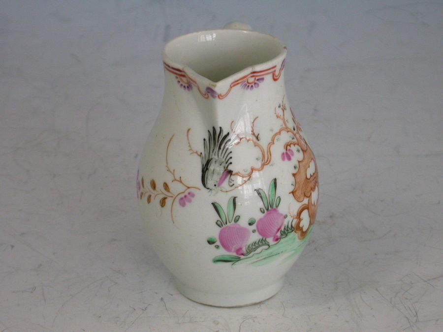 A fine Lowestoft Sparrow Beak Jug with solid loop handle, painted in polychrome enamels with a Redgrave variant depicting a bird in branches issuing from a knarled tree and two plants on grassland, within a double line iron red border.