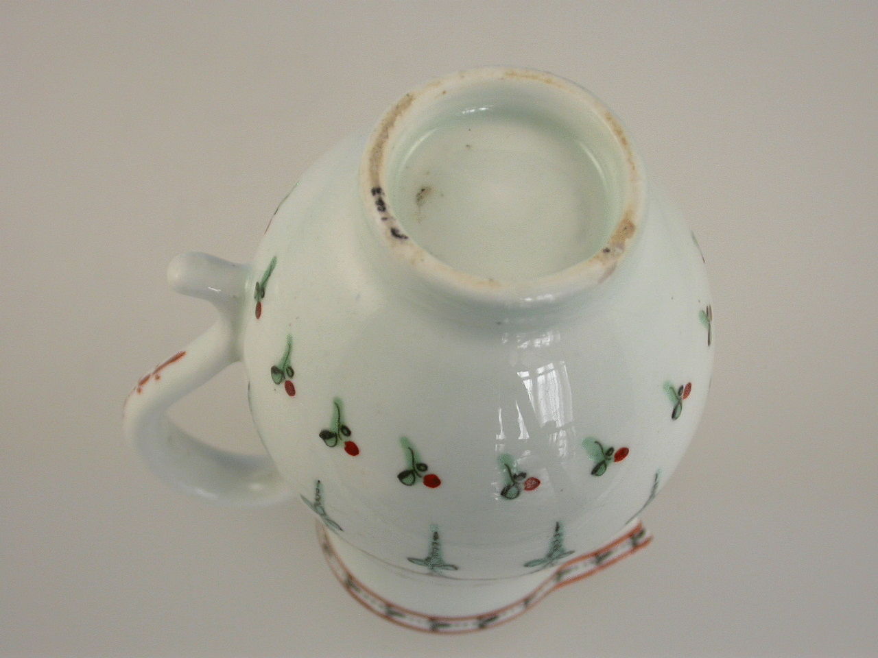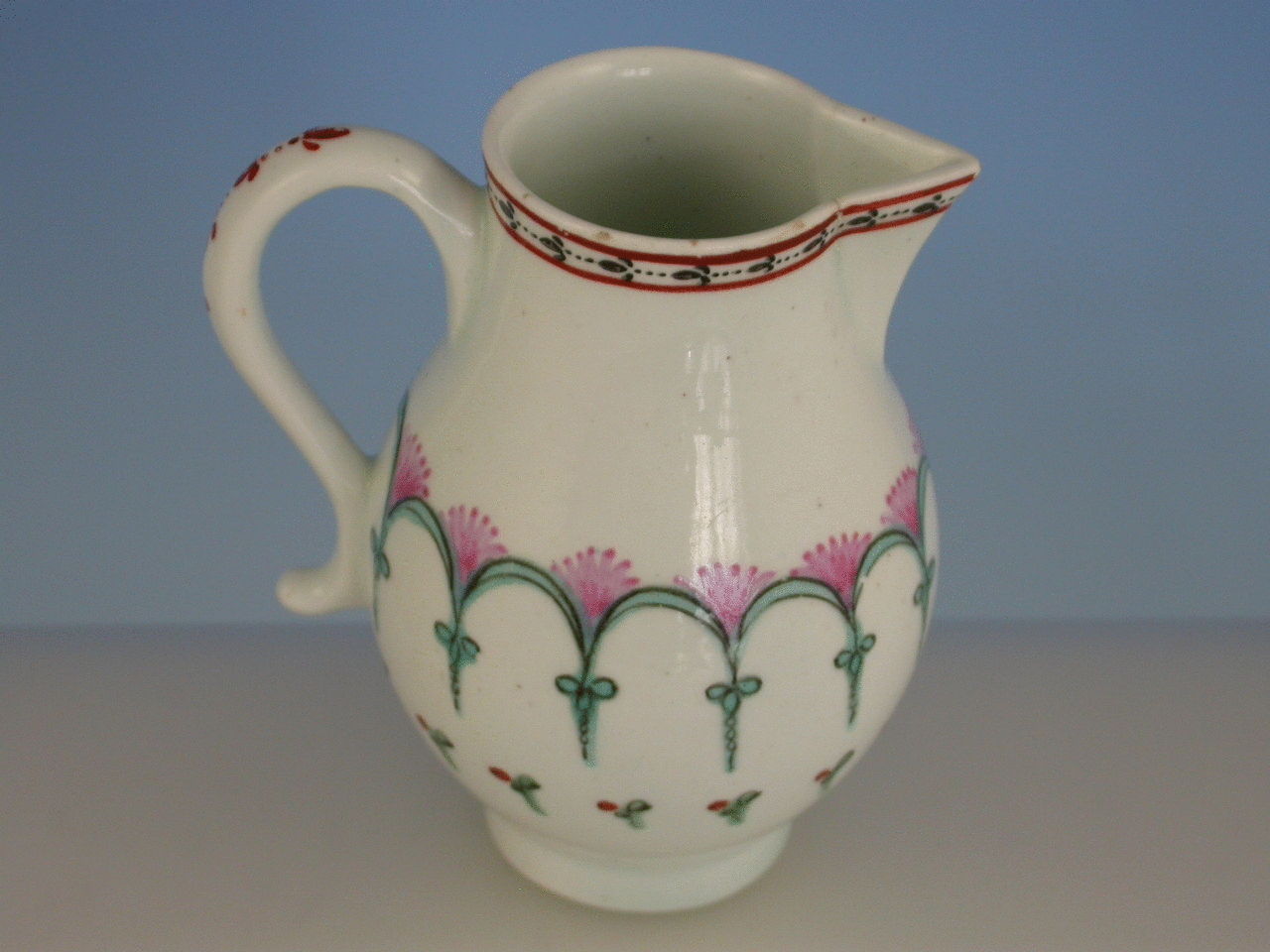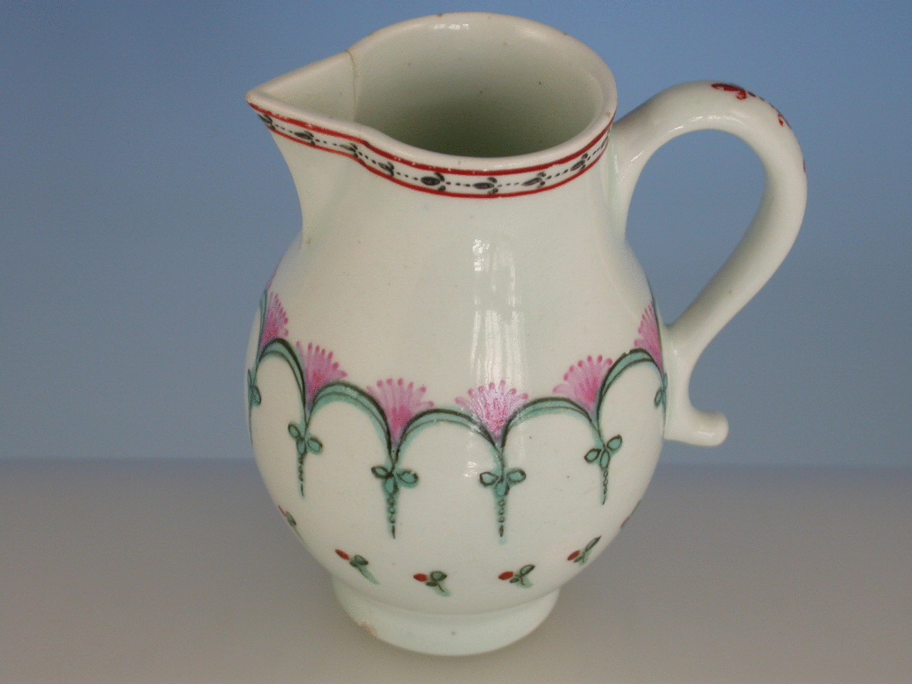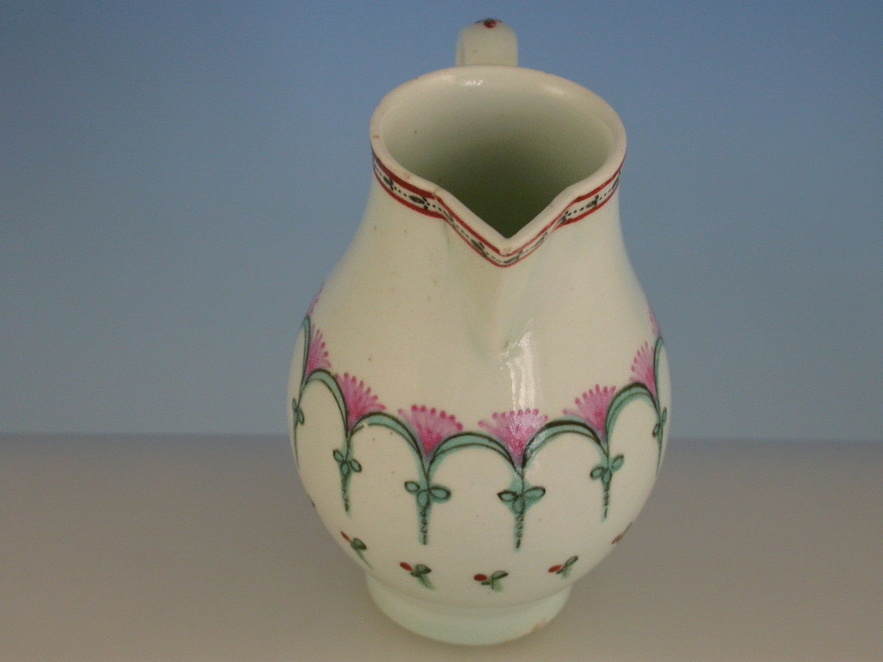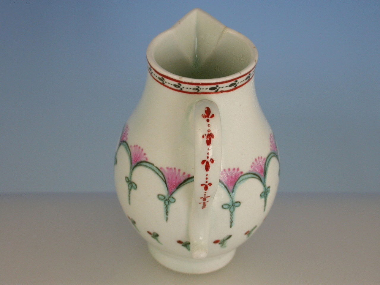 A Lowestoft Sparrowbeak Jug painted with a formal design of pink and green arches. Solid loop handle.