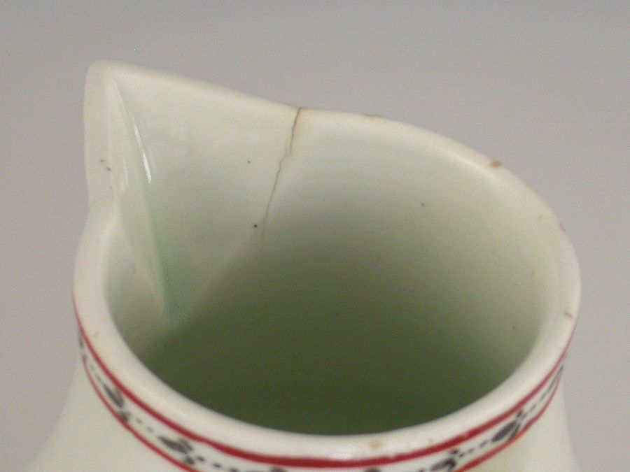 Firing crack and associated glaze crack to side of spout, firing flaws to foot rim.
