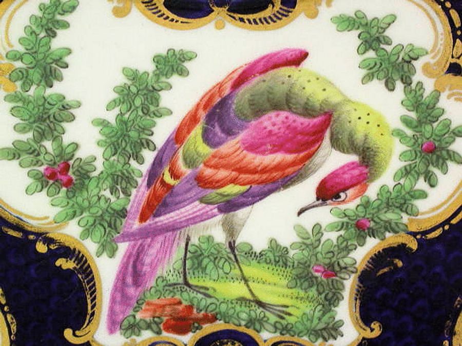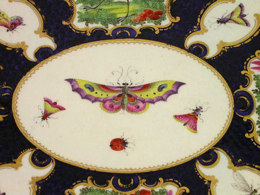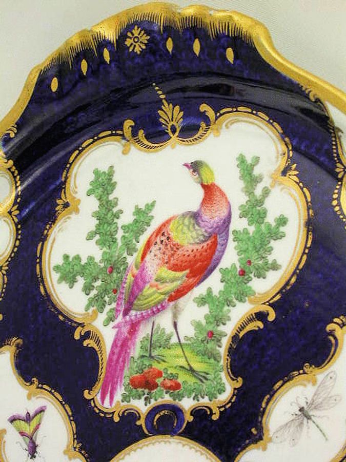 A very fine Martin Barr Worcester Tray of shaped oval form with thumb nail handles, painted in the scrolled and mirror shaped reserves with Exotic birds and insects, all on a scale blue ground, gilt line rims.