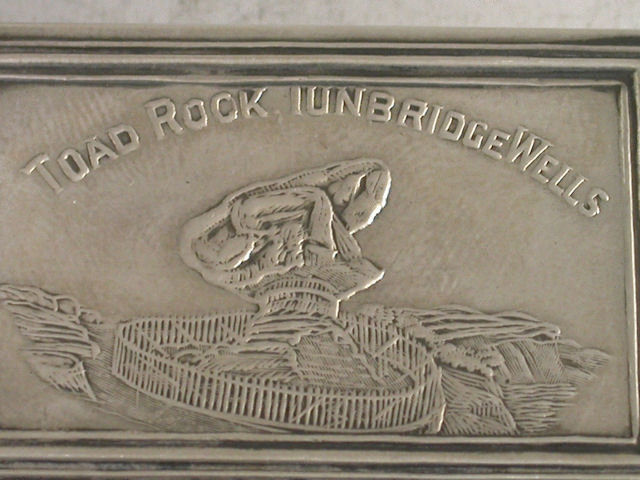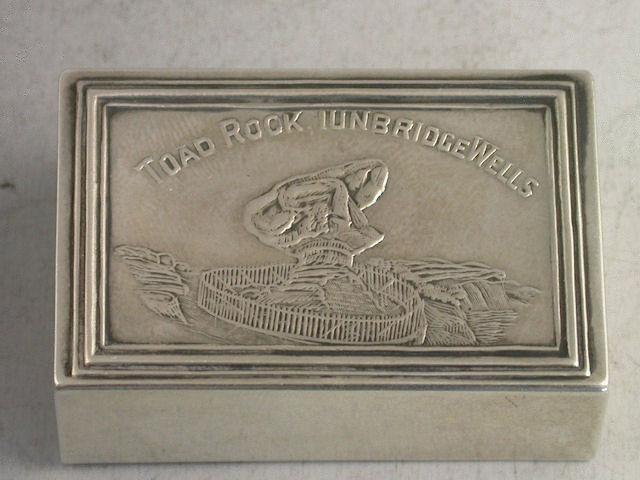 A rare early Edwardian silver “Castle Top” Matchbox Cover of plain sprung rectangular form, the cover with stamped and raised view depicting Toad Rock, Tunbridge Wells, with reeded picture frame border.