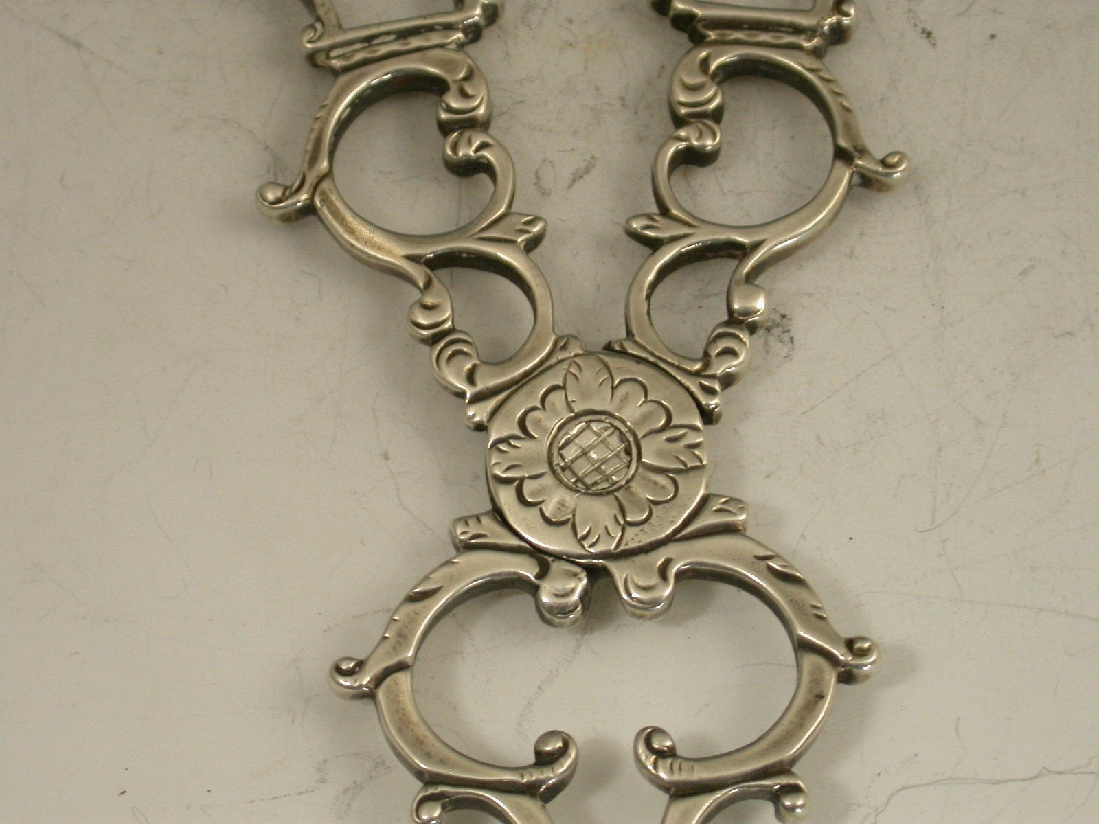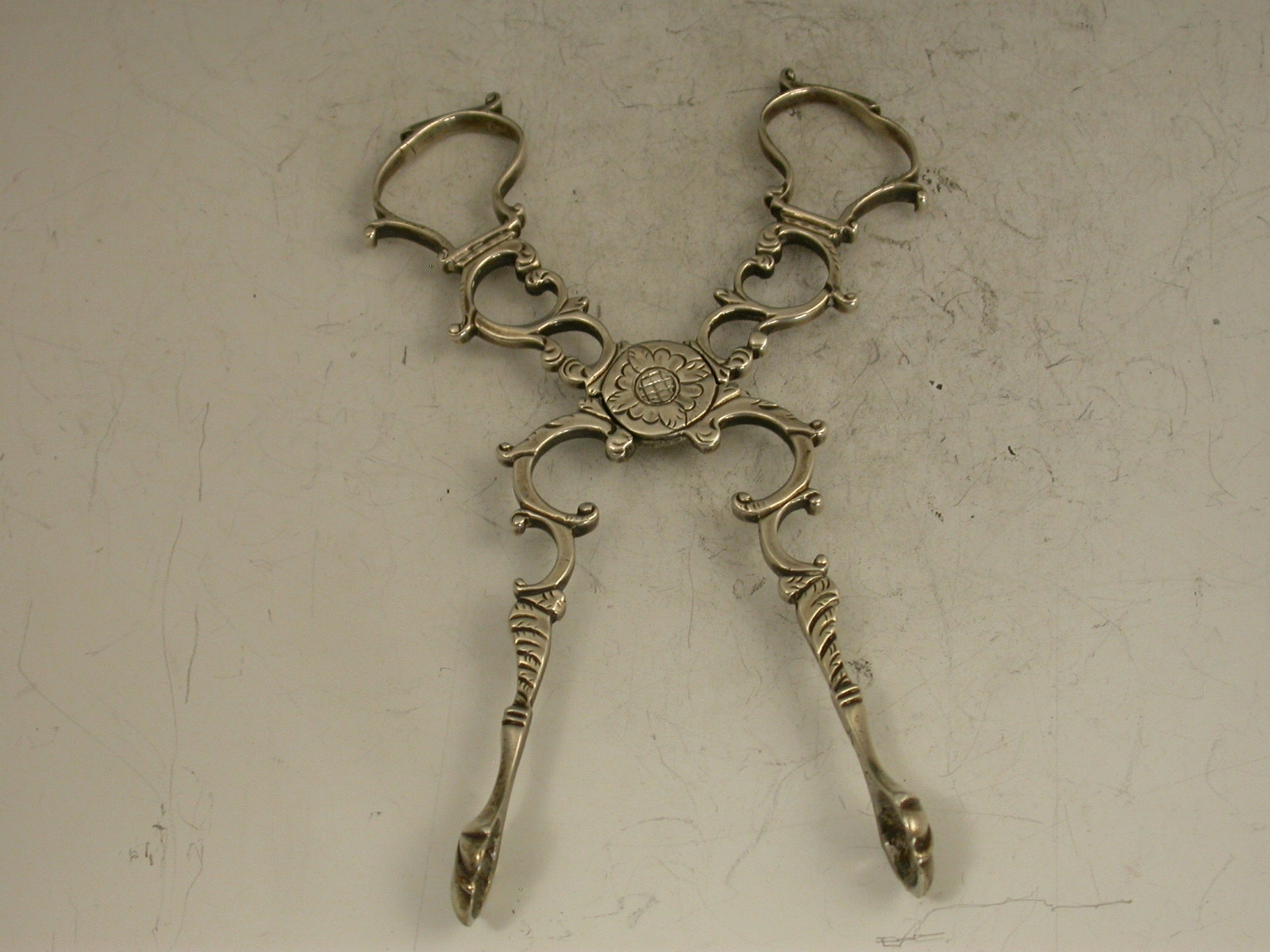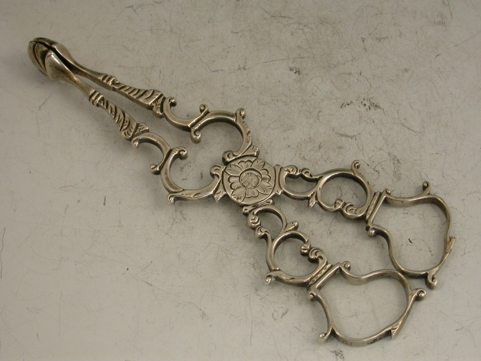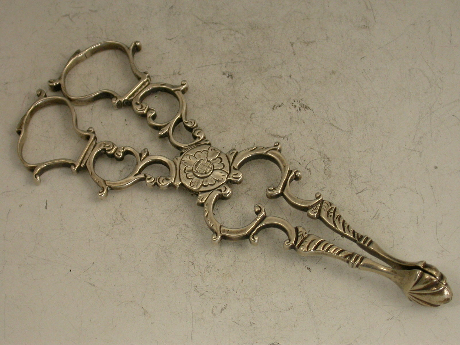 A good pair of mid 18th century Irish silver Sugar Nips of rococo scroll form with shaped finger rings and flower engraved hinge.
