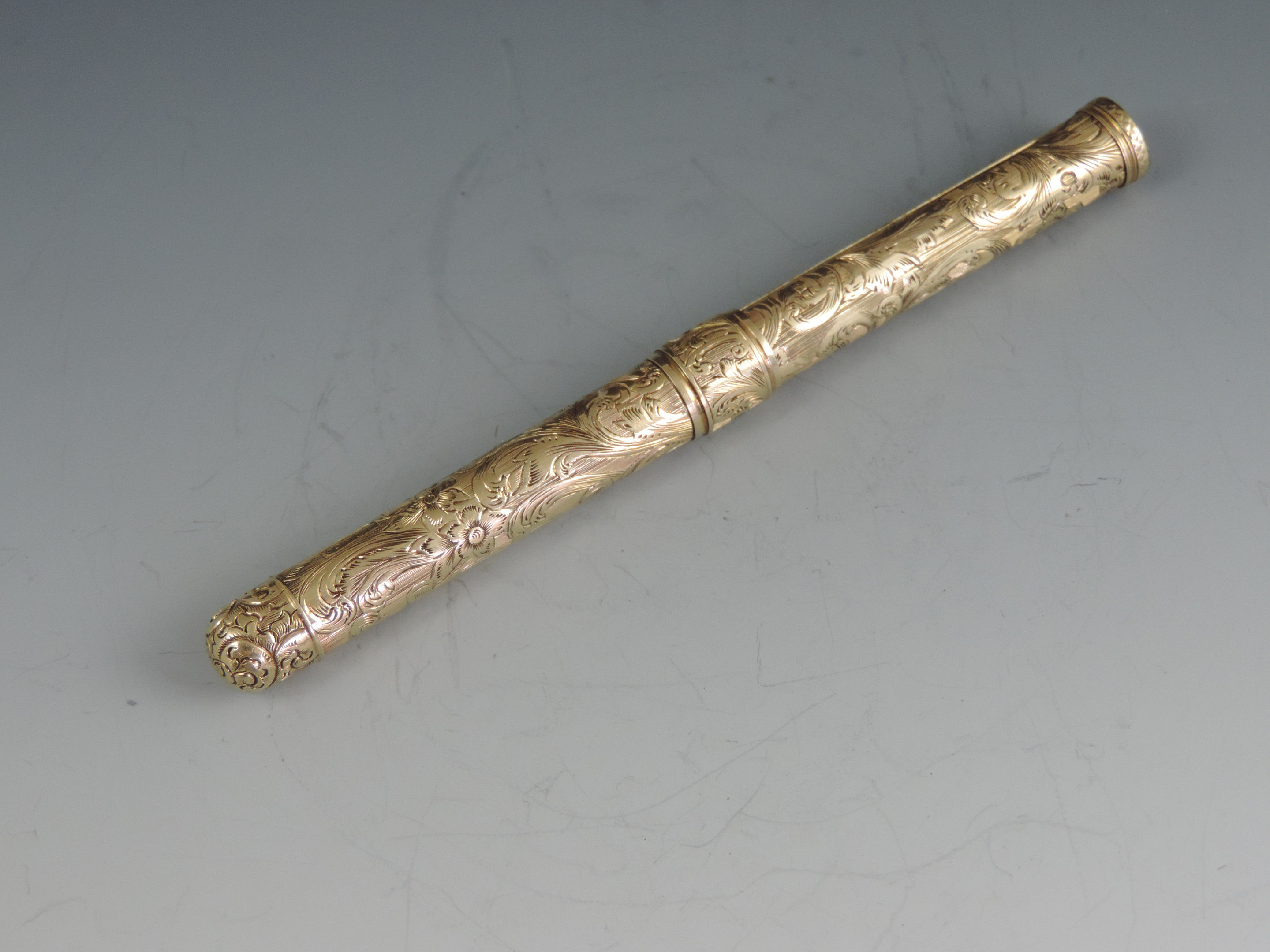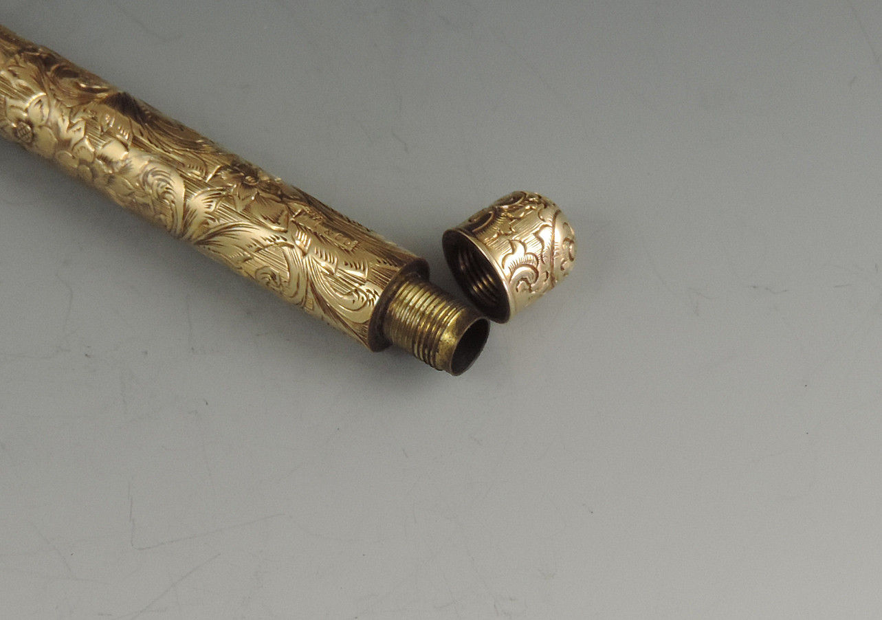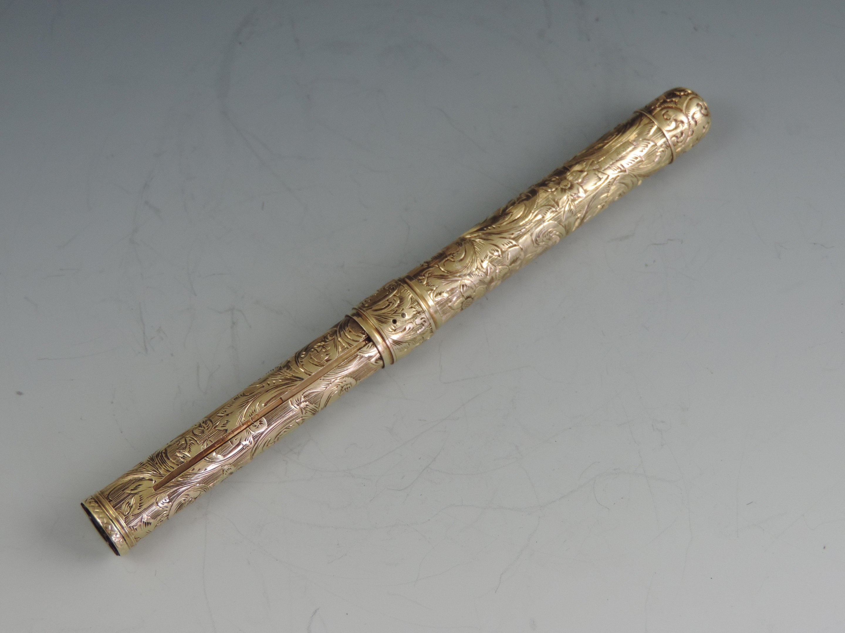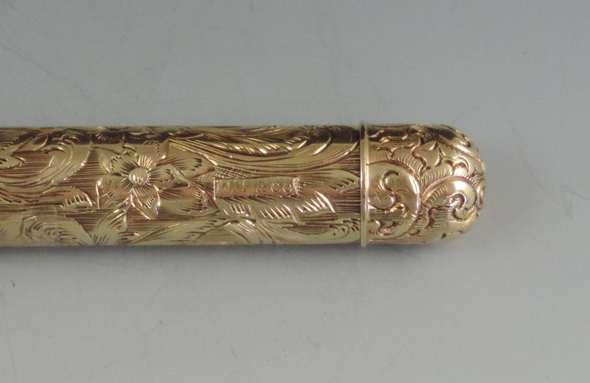 An exceptionally fine quality mid 19th century American 14 carat gold combination Sliding Gold Pen and Propelling Pencil with integral telescopic extending mechanism to the shaft. The cylindrical body superbly hand chased with foliate scroll work, the end cap unscrewing to reveal a lead reservoir. The Pen holder complete with John Foley of New York No 5½ gold nib.