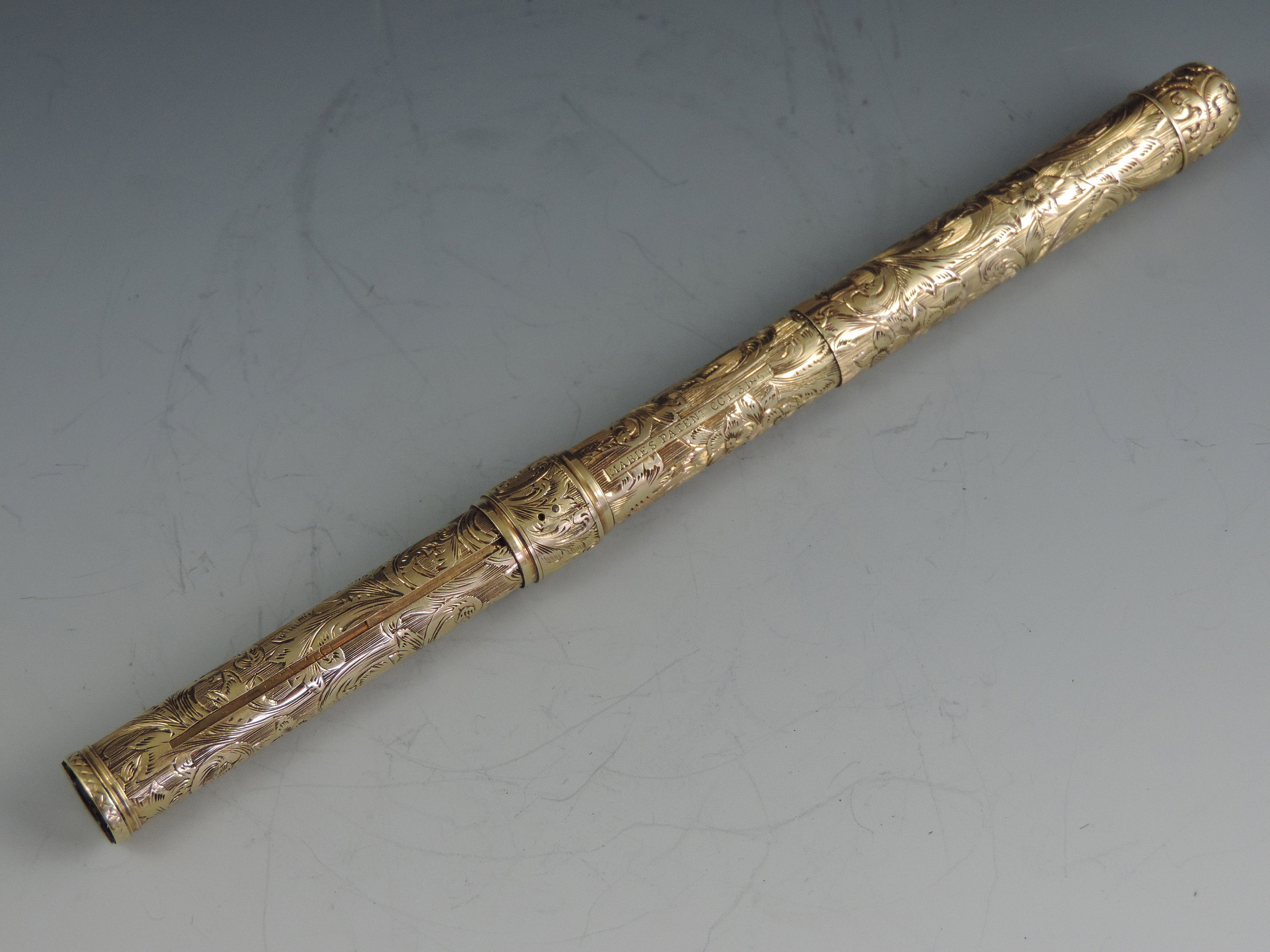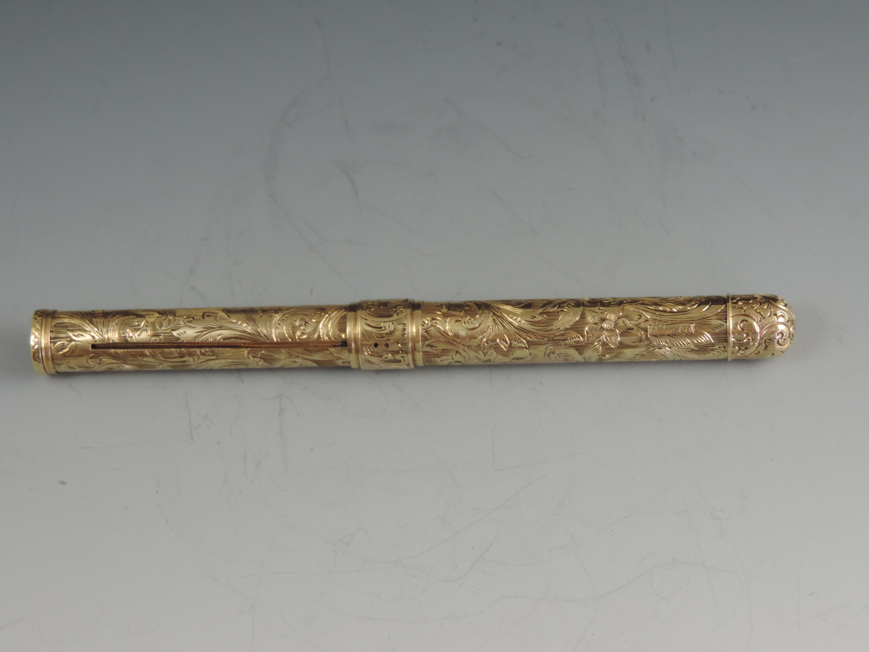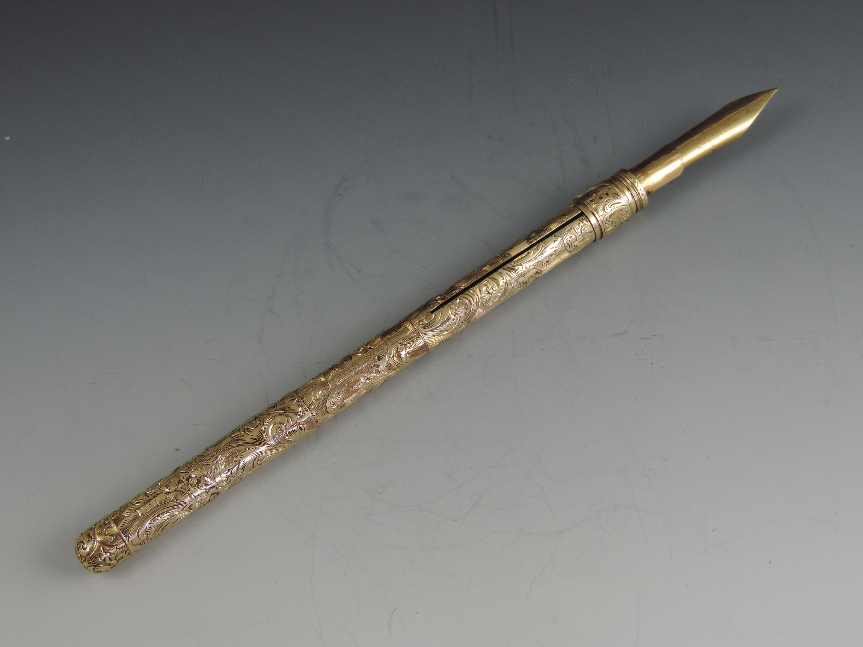 An exceptionally fine quality mid 19th century American 14 carat gold combination Sliding Gold Pen and Propelling Pencil with integral telescopic extending mechanism to the shaft. The cylindrical body superbly hand chased with foliate scroll work, the end cap unscrewing to reveal a lead reservoir. The Pen holder complete with John Foley of New York No 5½ gold nib.