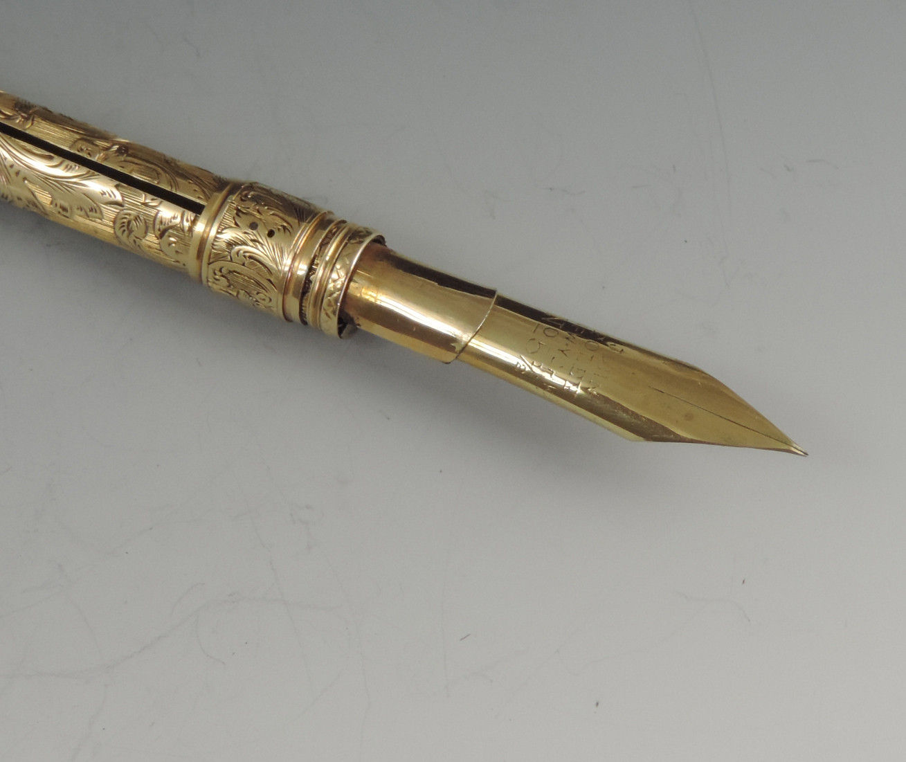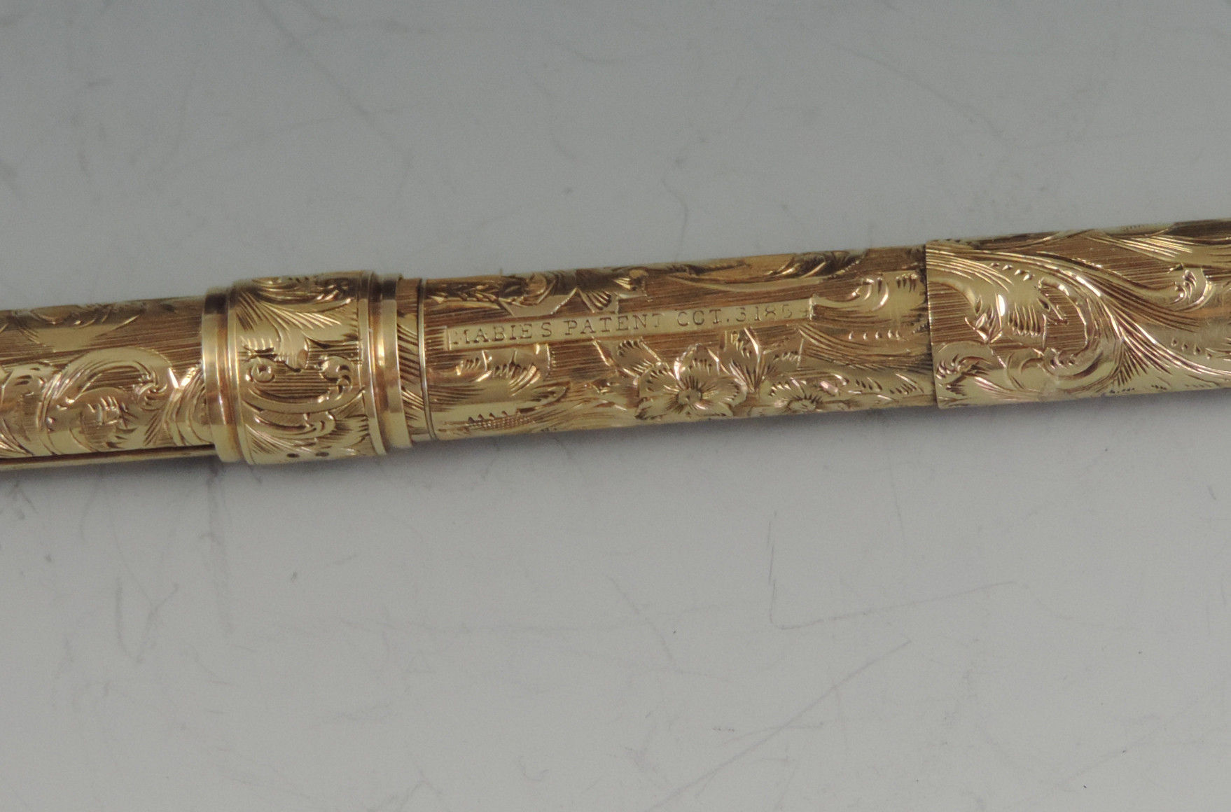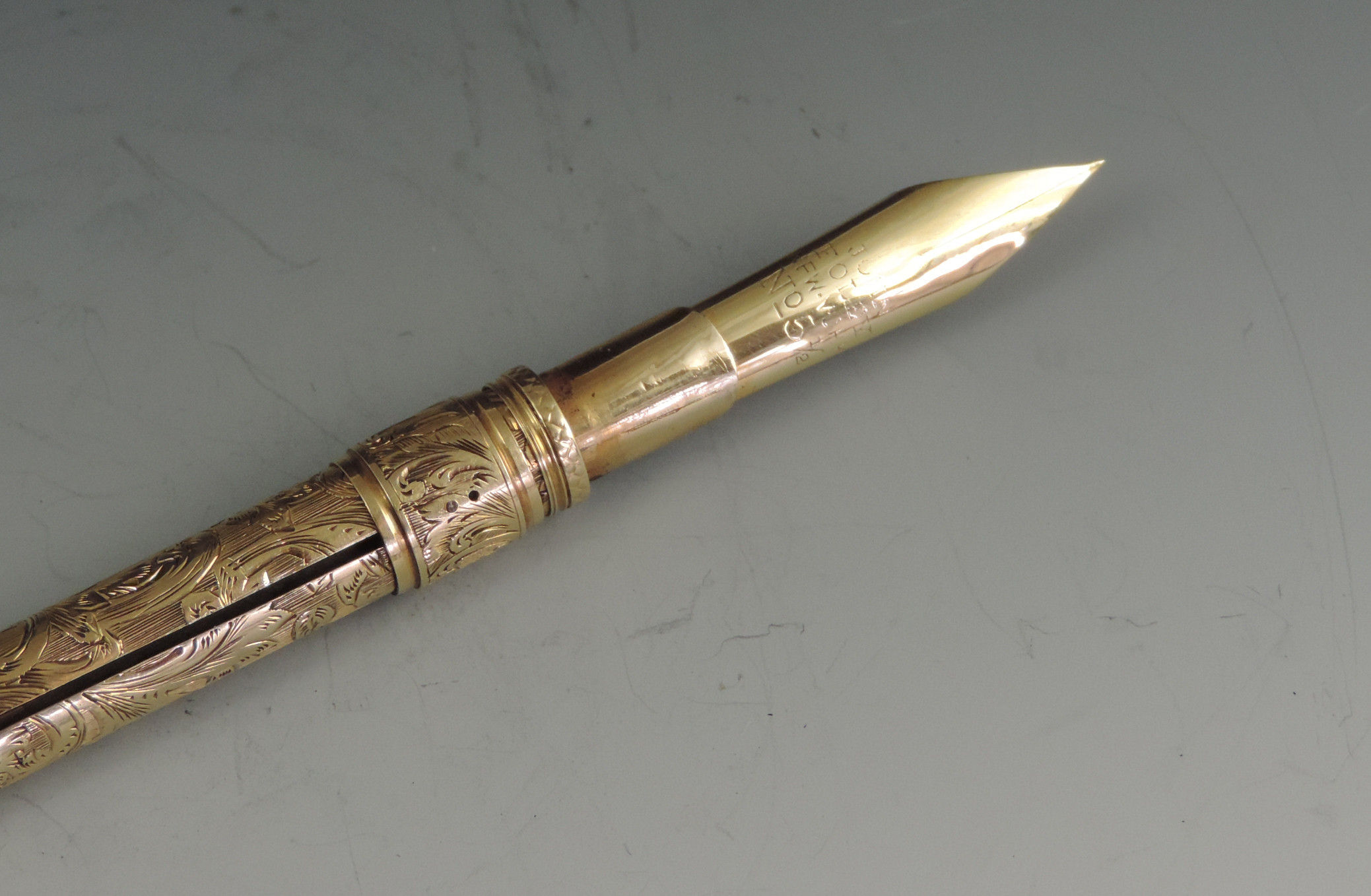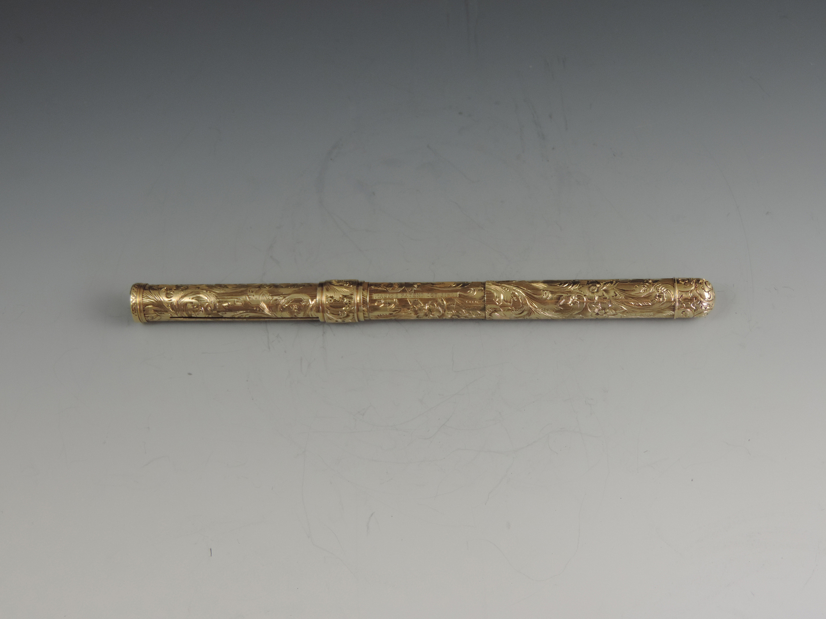 An exceptionally fine quality mid 19th century American 14 carat gold combination Sliding Gold Pen and Propelling Pencil with integral telescopic extending mechanism to the shaft. The cylindrical body superbly hand chased with foliate scroll work, the end cap unscrewing to reveal a lead reservoir. The Pen holder complete with John Foley of New York No 5½ gold nib.