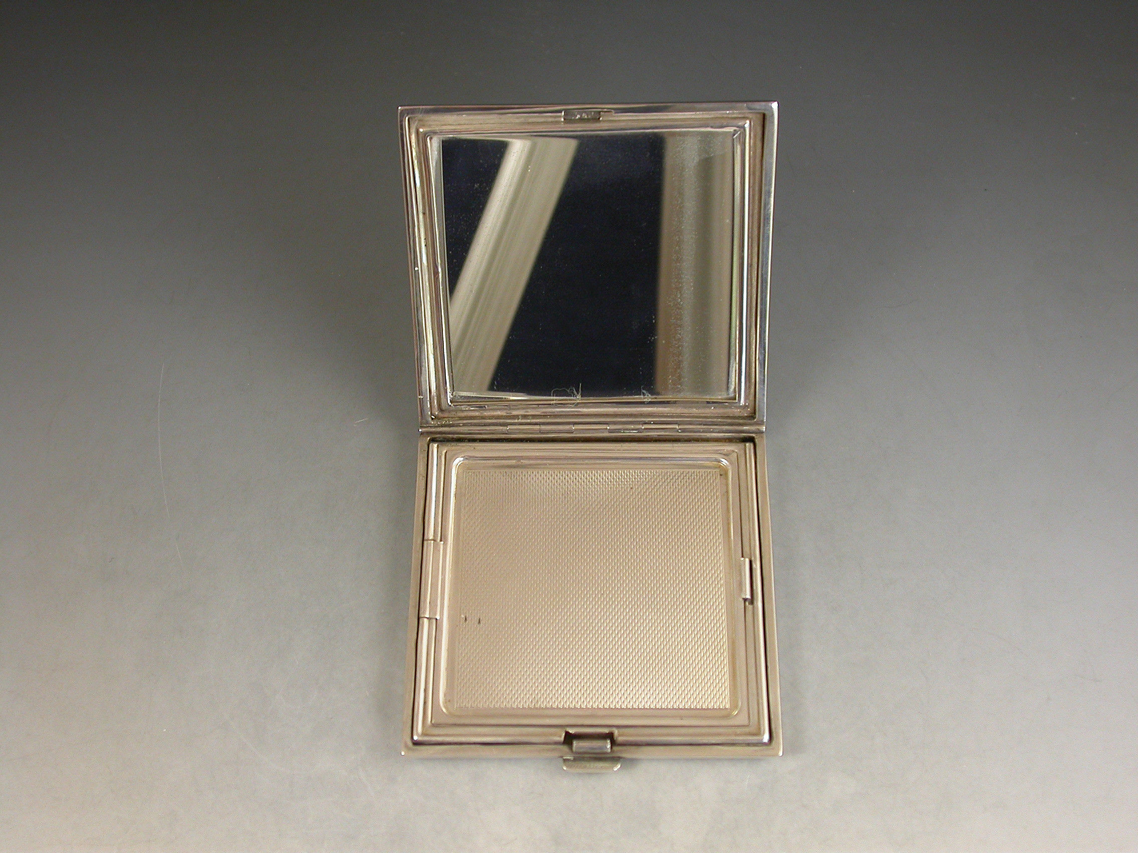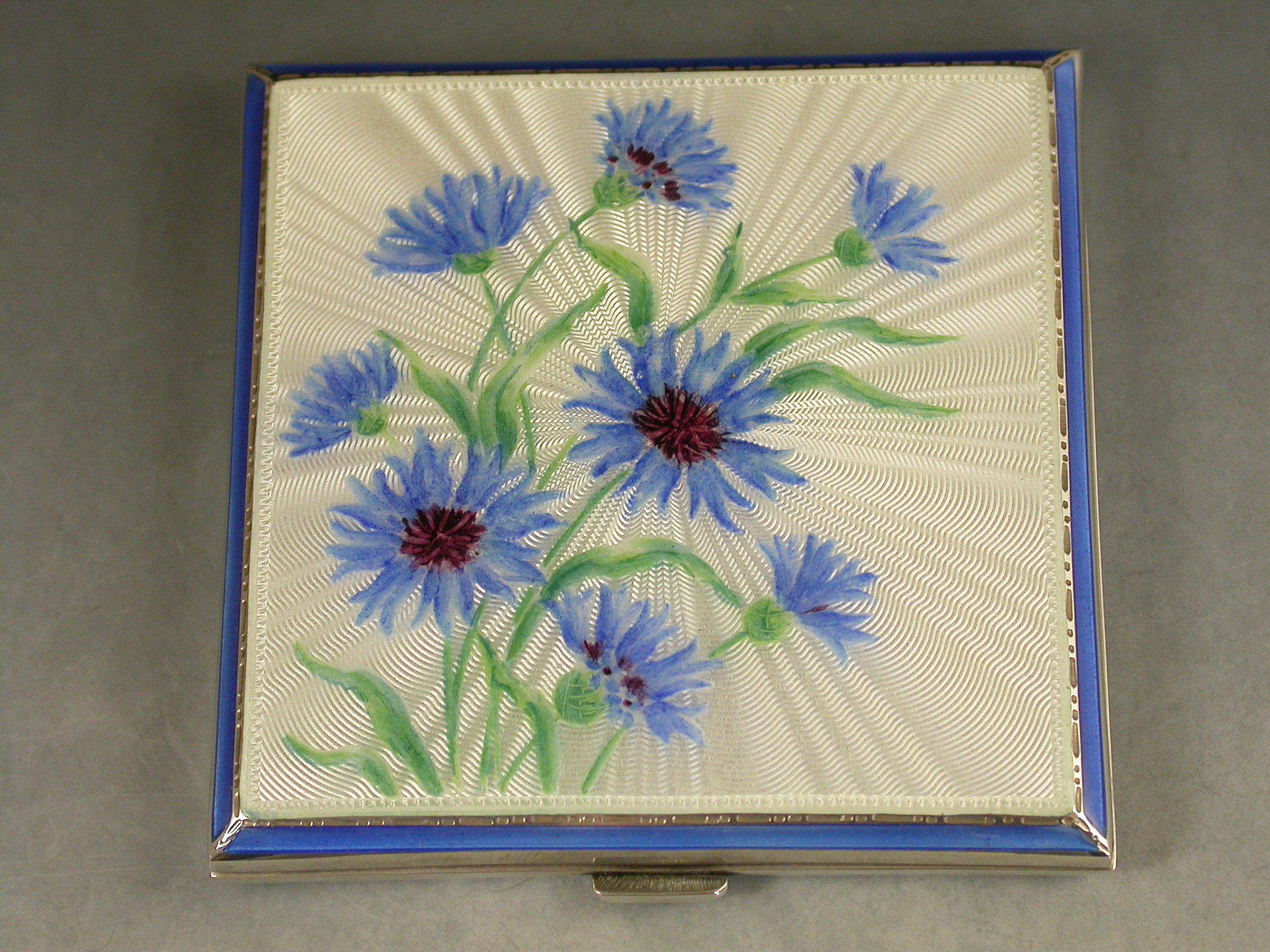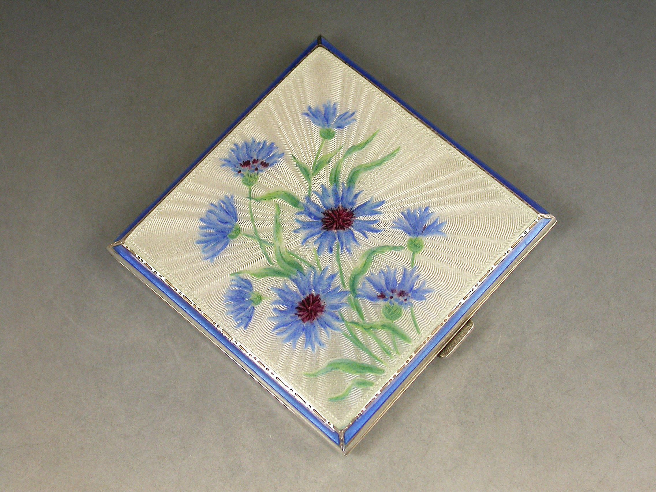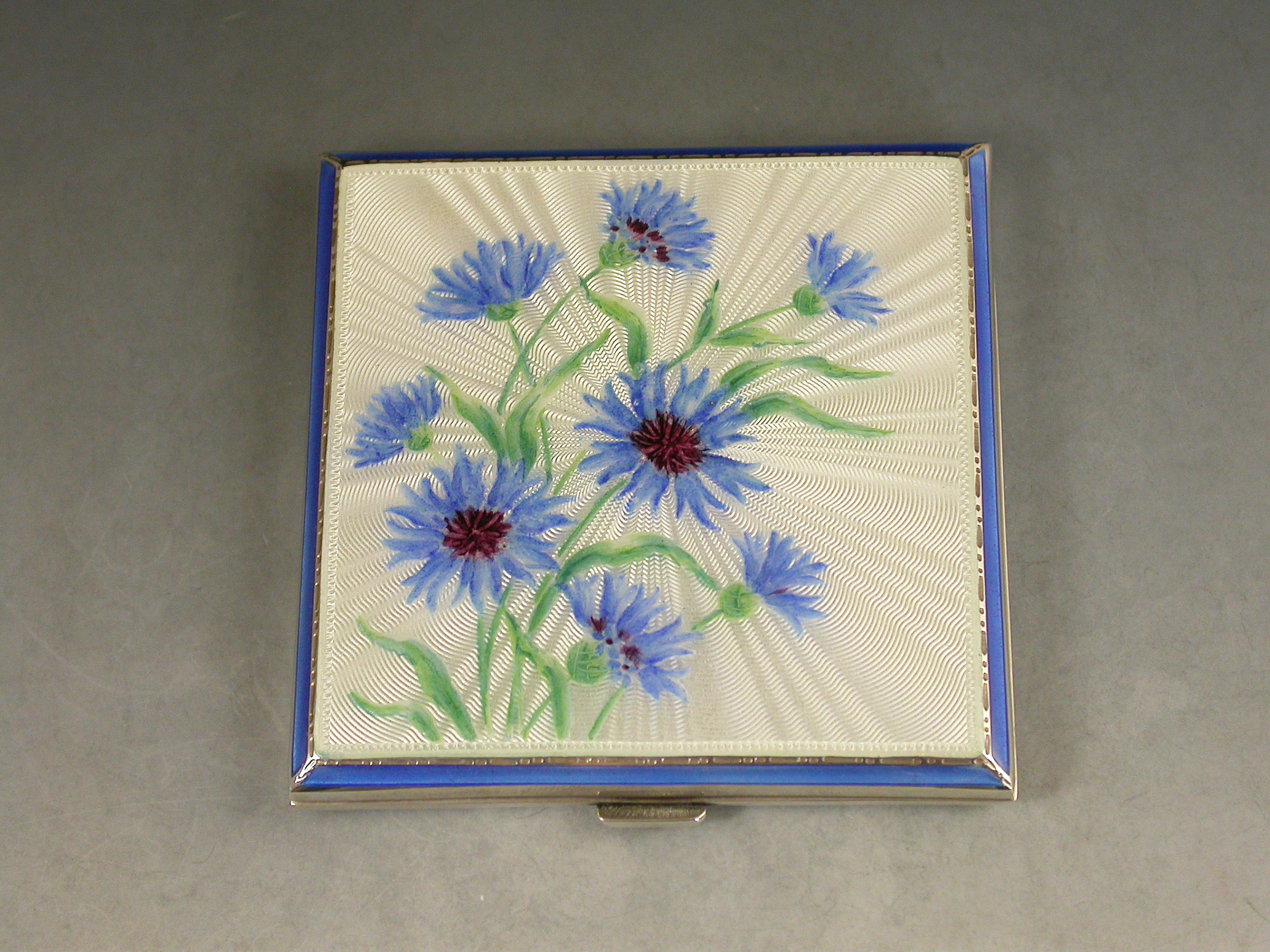 A good quality mid 20th century silver and sky blue guilloche enamelled Compact of square form, depicting cornflowers on a rayed white background. The silver interior with mirror and powder compartment.