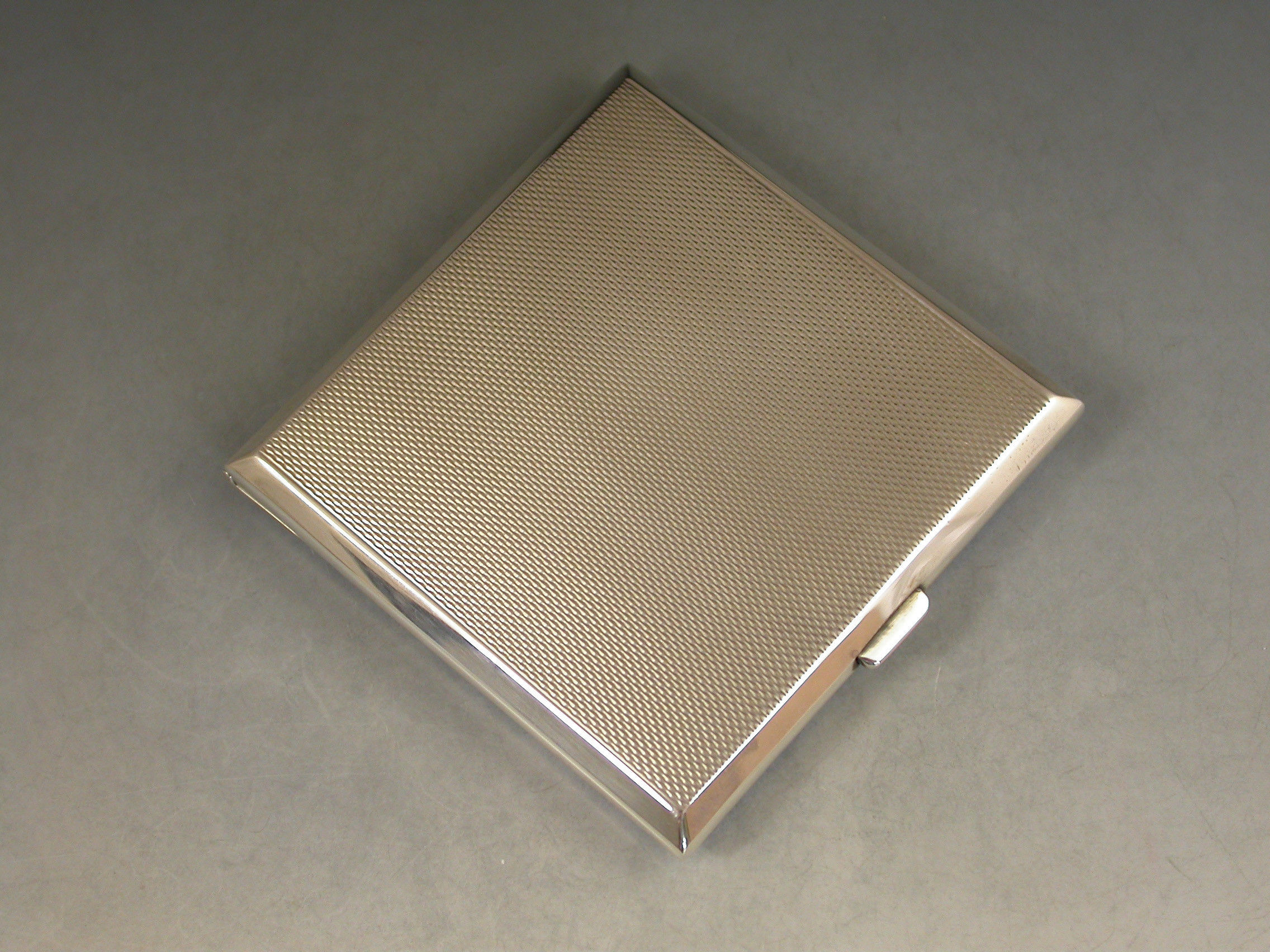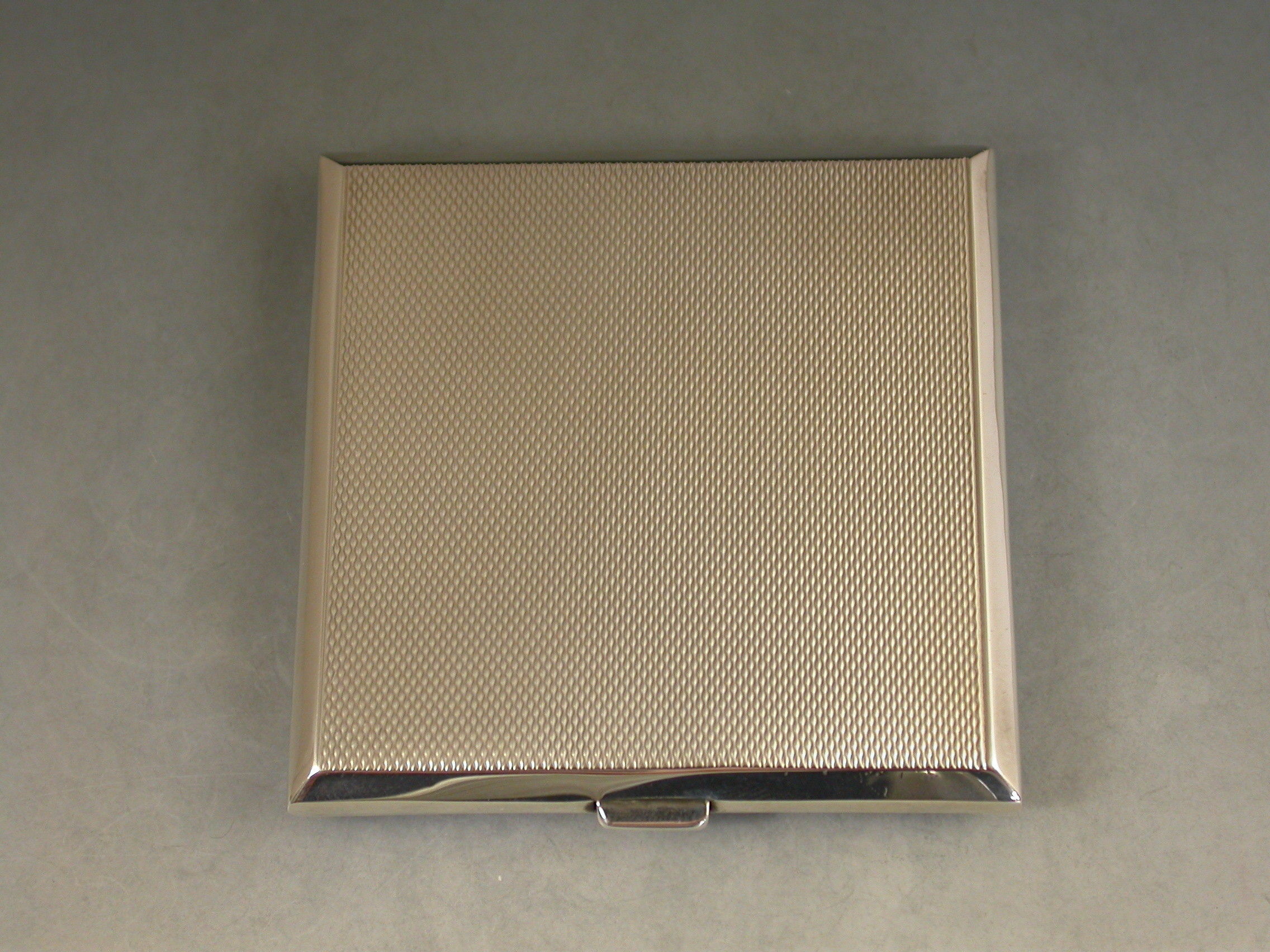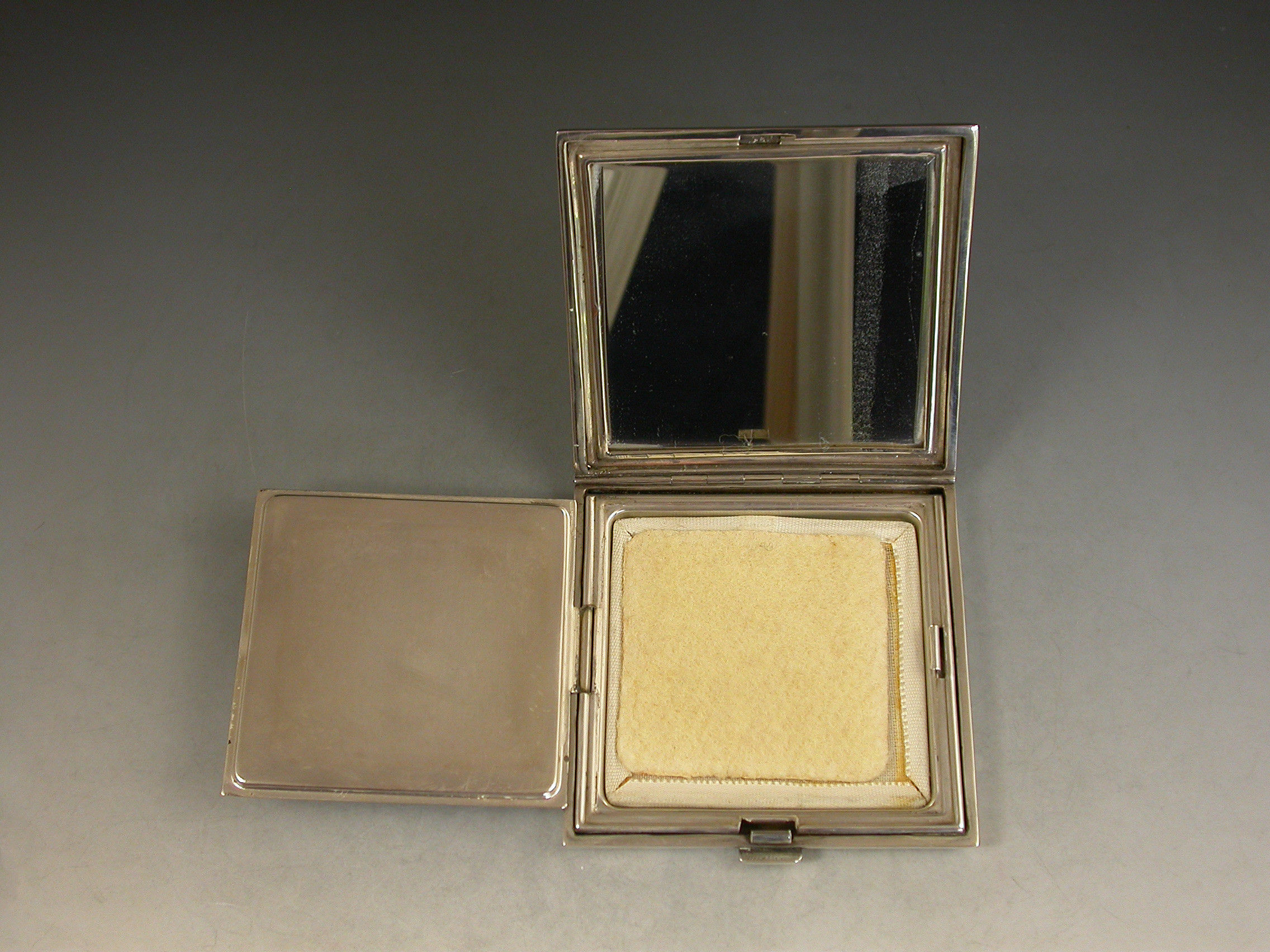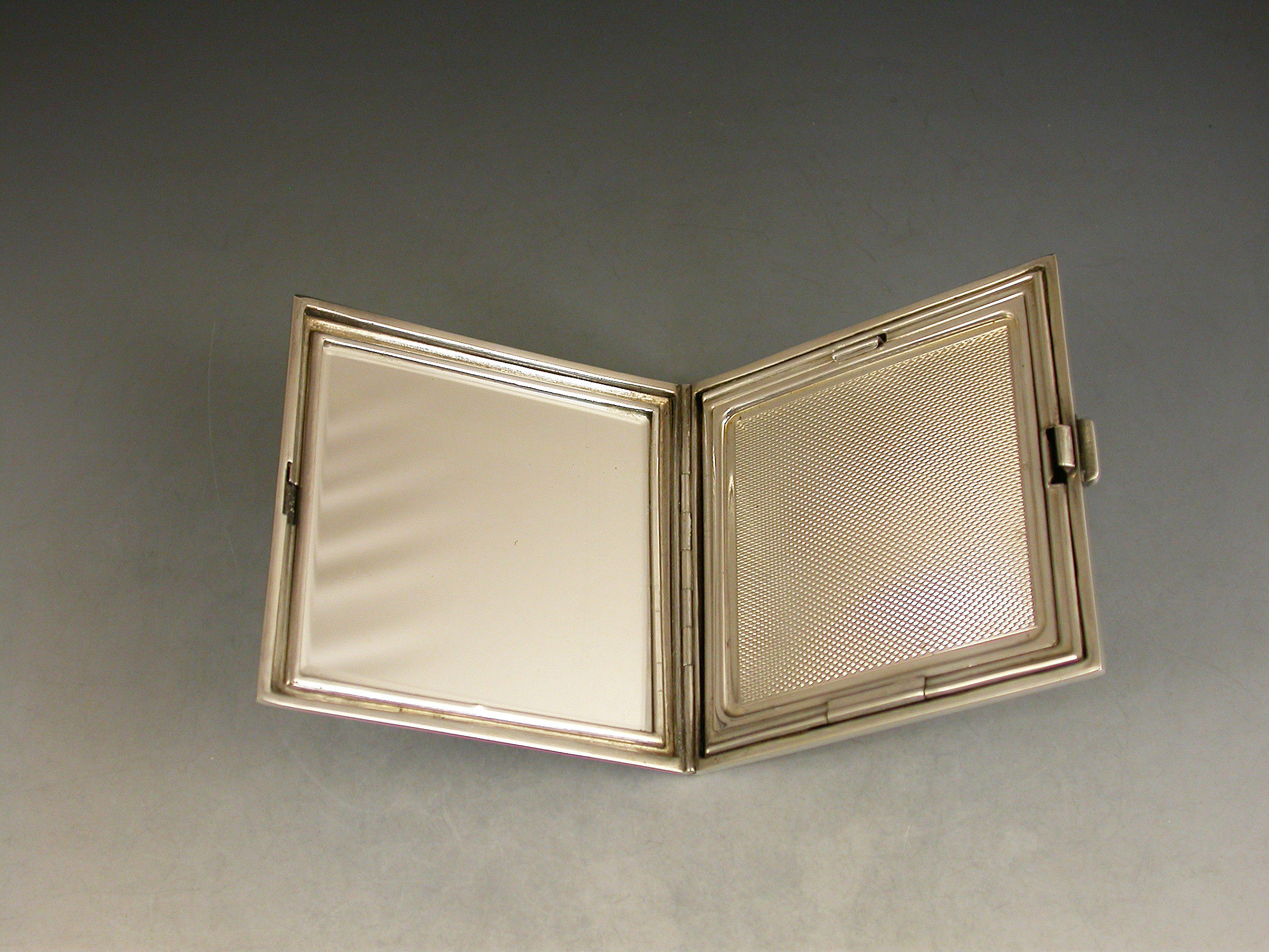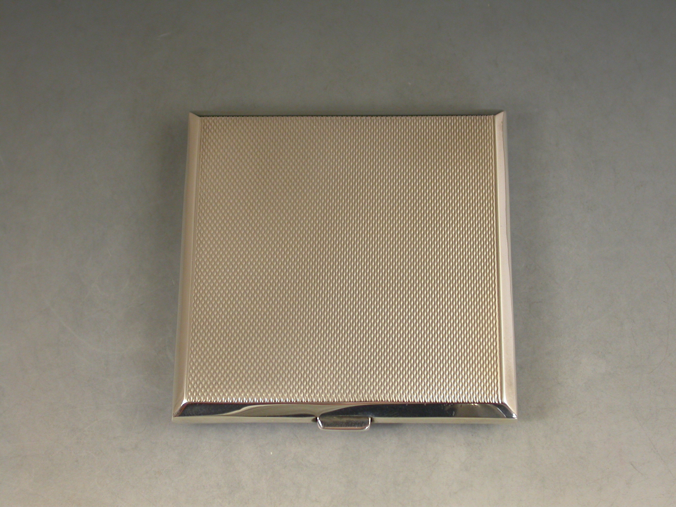 A good quality mid 20th century silver and sky blue guilloche enamelled Compact of square form, depicting cornflowers on a rayed white background. The silver interior with mirror and powder compartment.