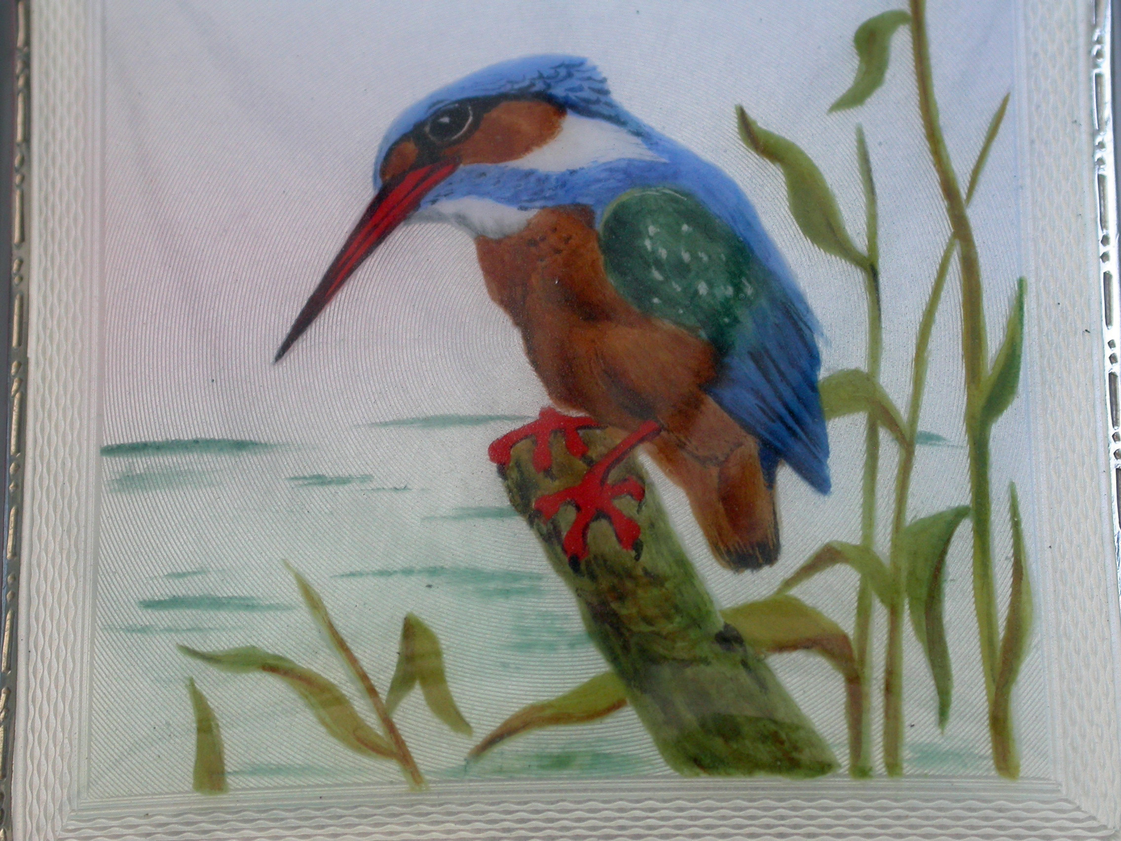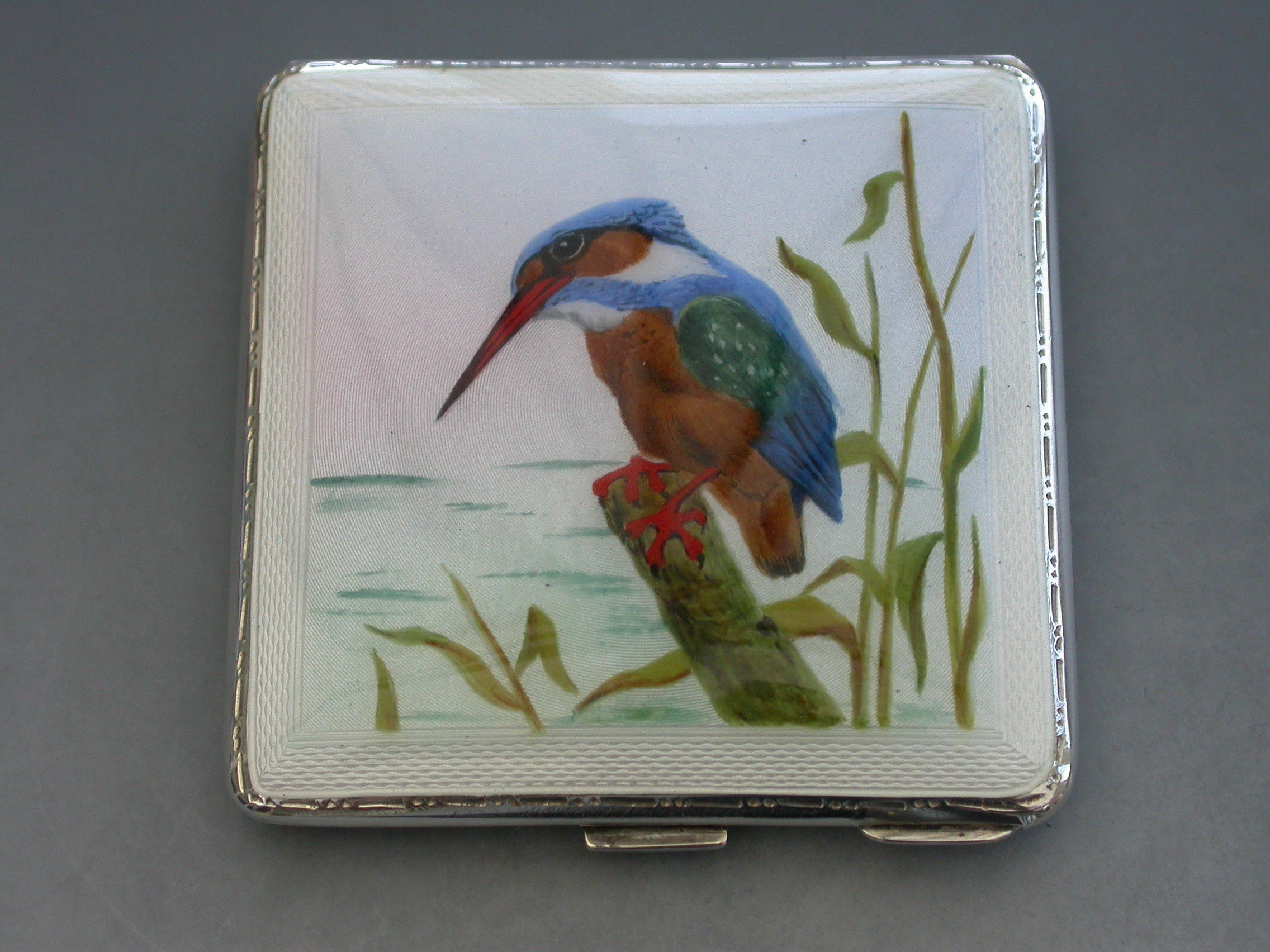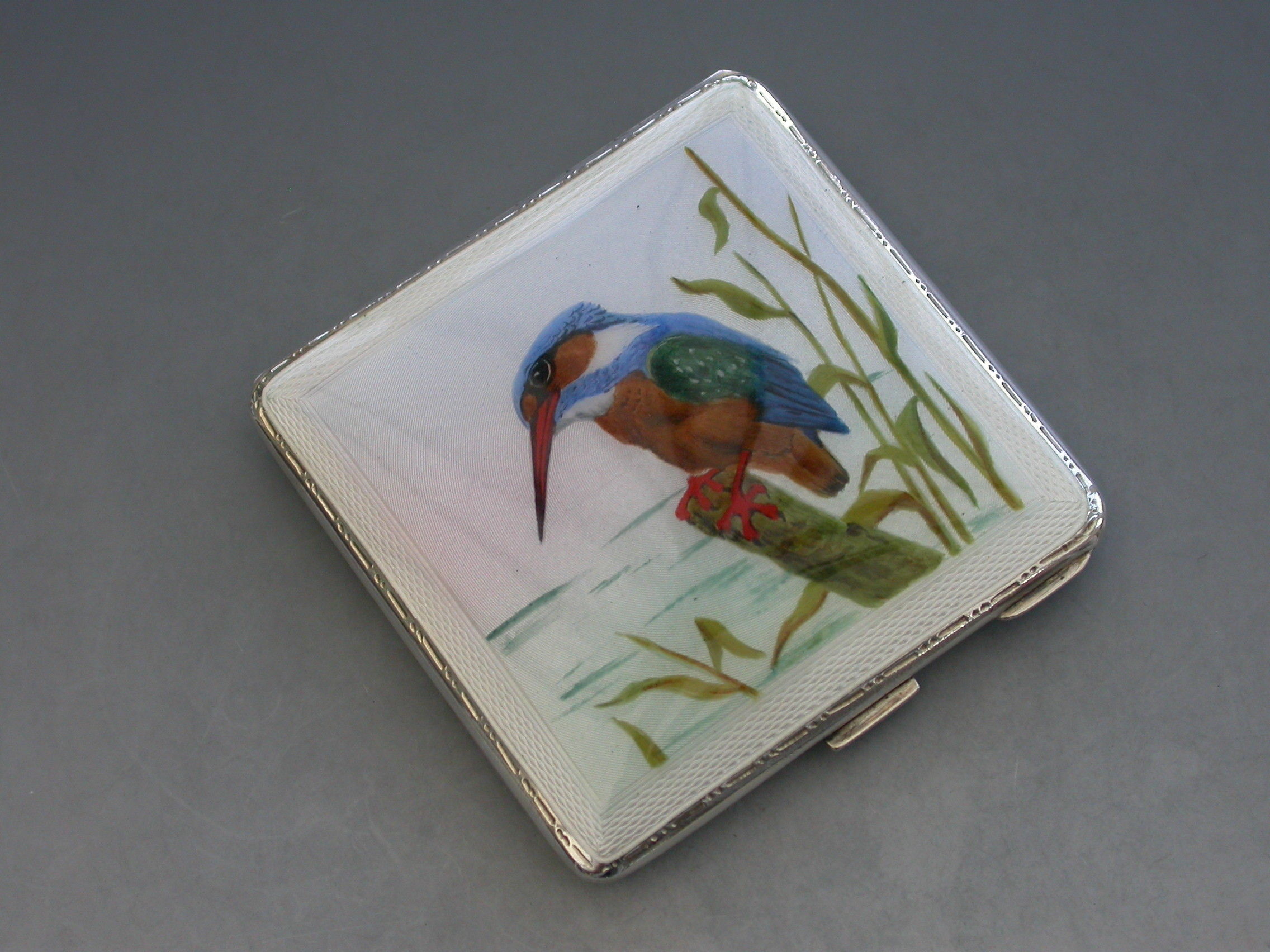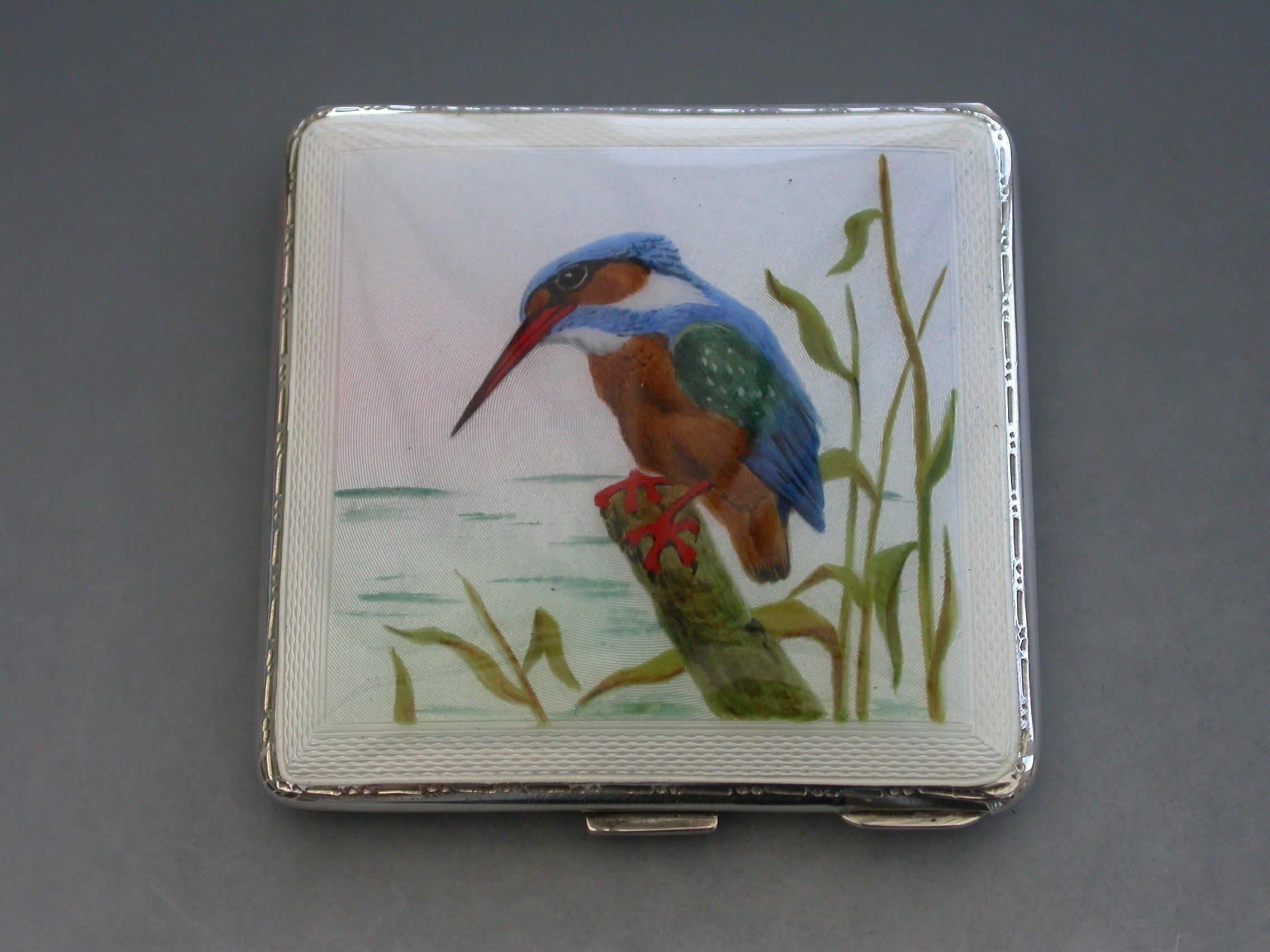 A good quality mid 20th century silver and enamel Compact of square form, the cover with finely painted enamel Kingfisher. Engine turned base and interior mirror and powder compartment.