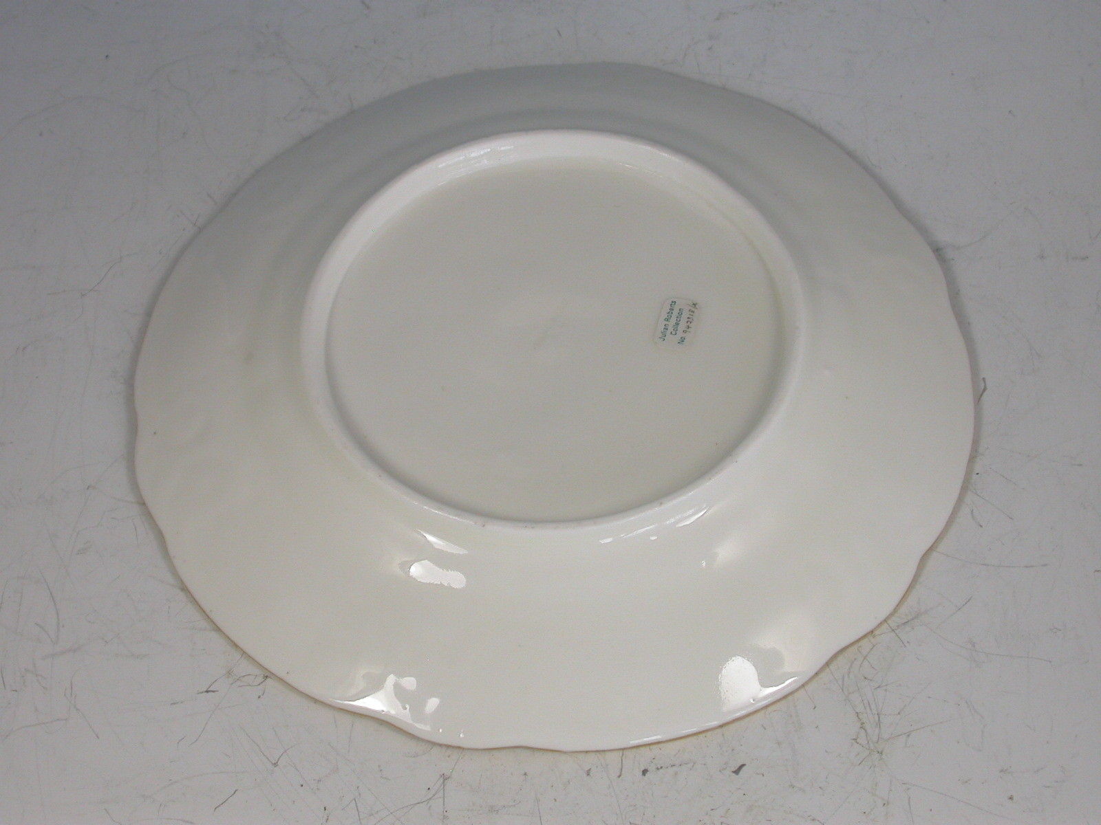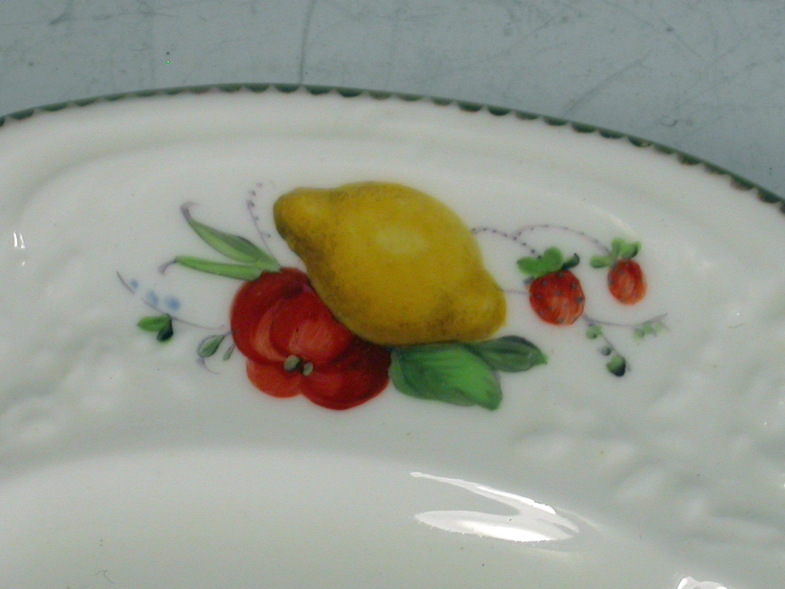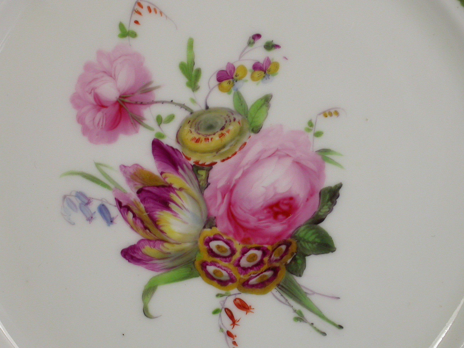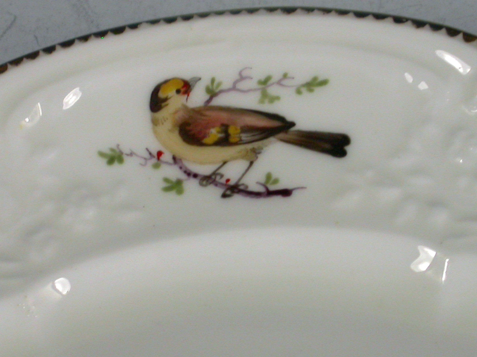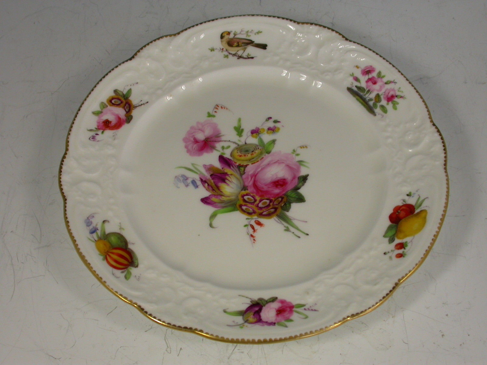 A very fine Nantgarw Dessert Plate of small size and of 'Brace Service' type, with a crisply moulded ""C"" scroll border, painted in London in the Bradley workshop with a central bouquet of flowers, including a variegated tulip within a border of a single Goldfinch, fruit and flowers.