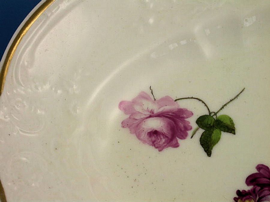 A good Nantgarw lozenge shaped Dish with a moulded border, painted in the centre with a bouquet of English flowers within smaller sprays of flowers, gilt line rims.