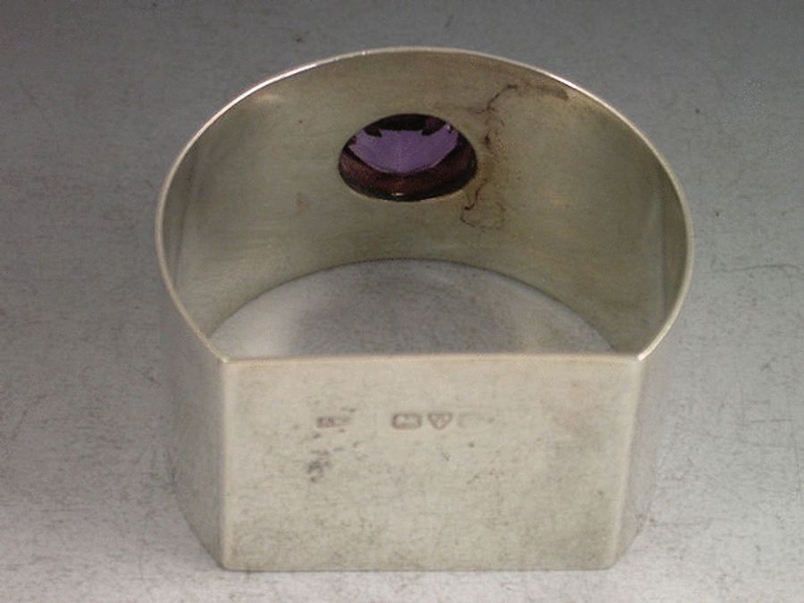 An Edwardian silver Napkin Ring of plain saddle shape, set with a fine facetted amethyst Cairngorm stone. Engraved – “Vera”.
