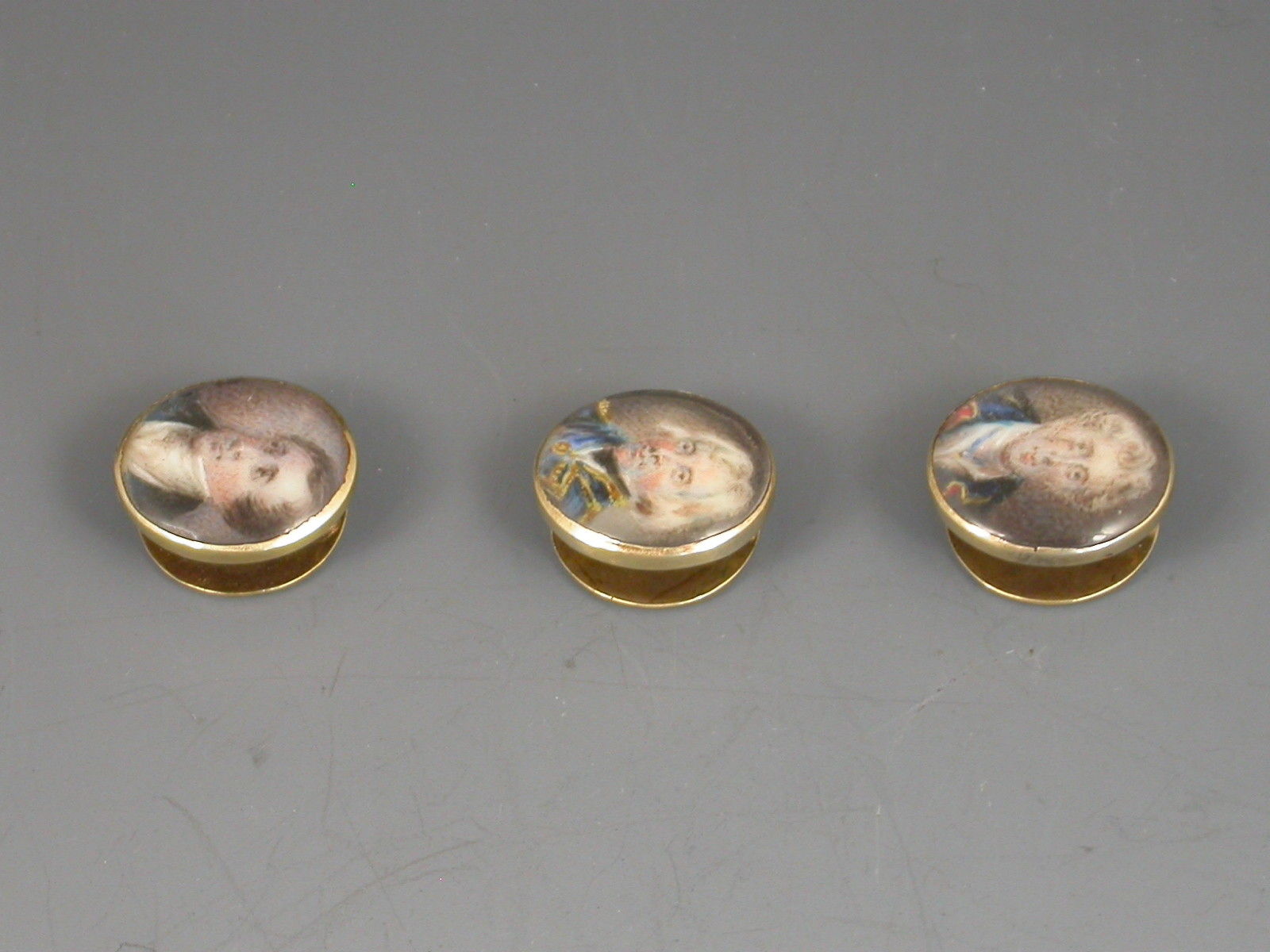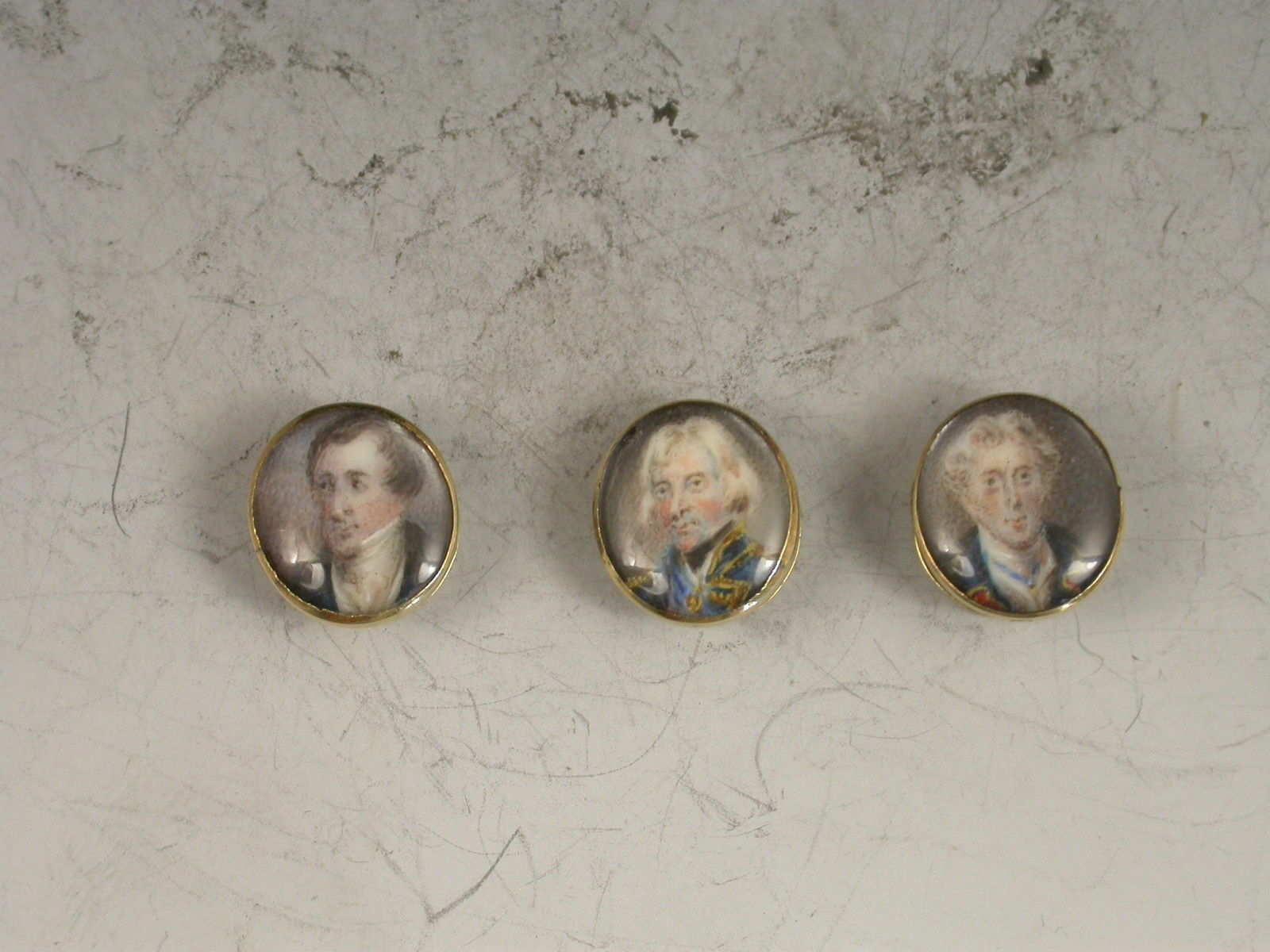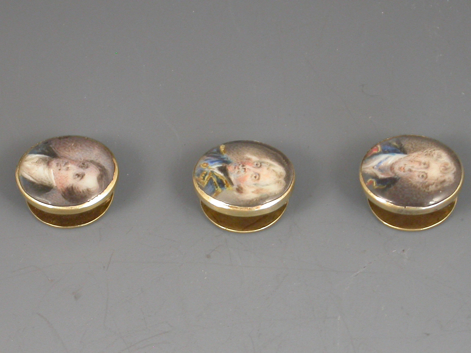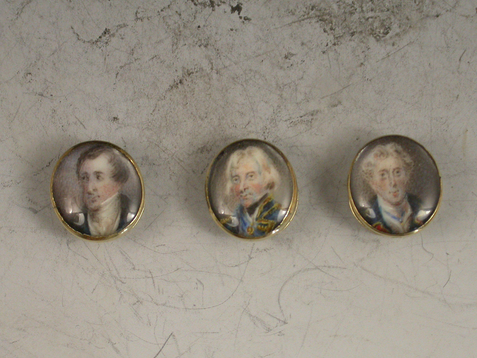 An unusual set of three early 19th century gold Studs each one inset with a miniature painting of a gentleman (under glass), one depicting Viscount Horatio Nelson, the other two unidentified, possibly Captains Duff and Cooke who also died at the Battle of Trafalgar in 1805.