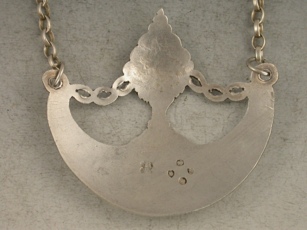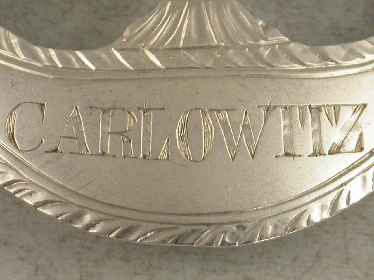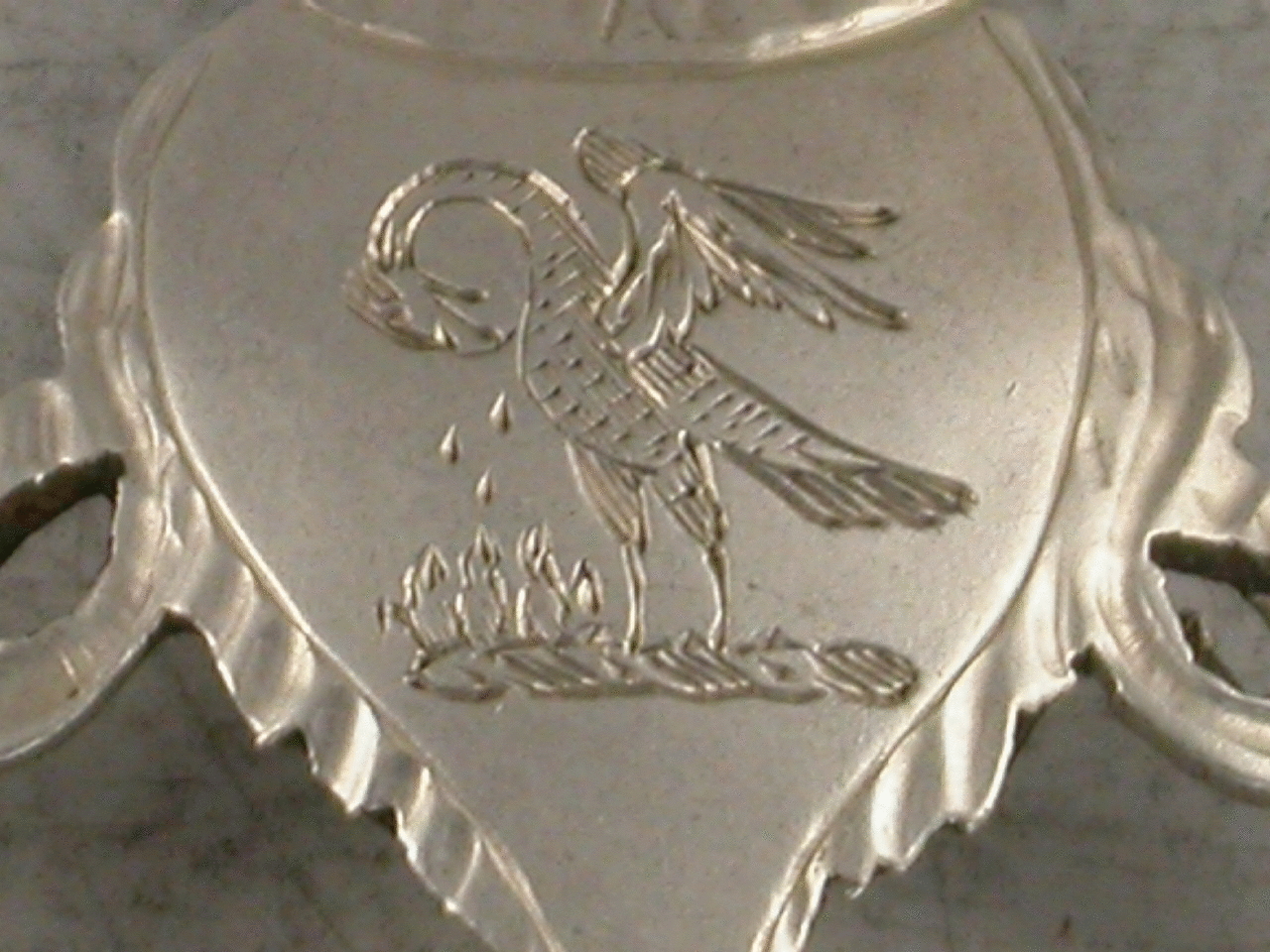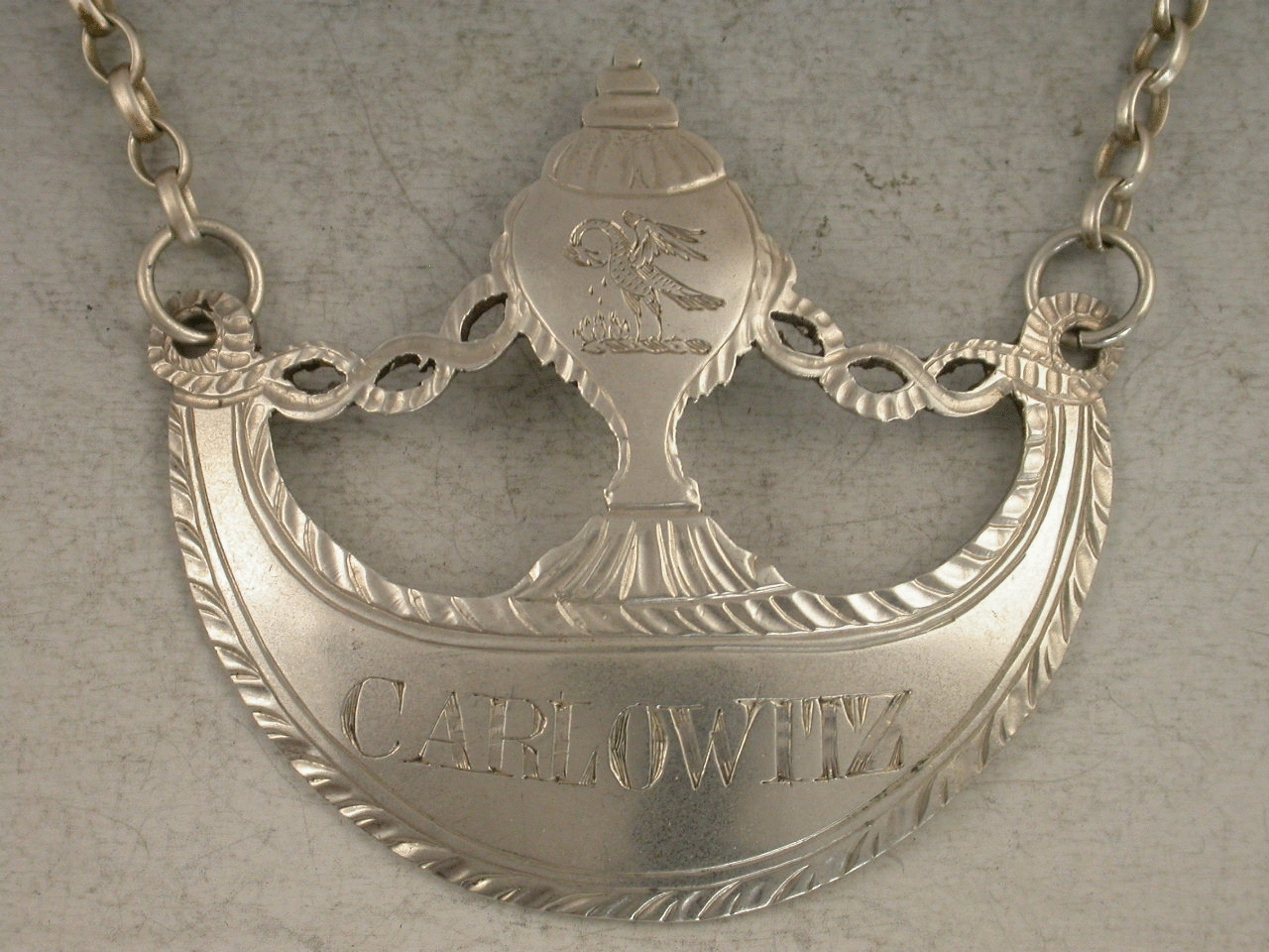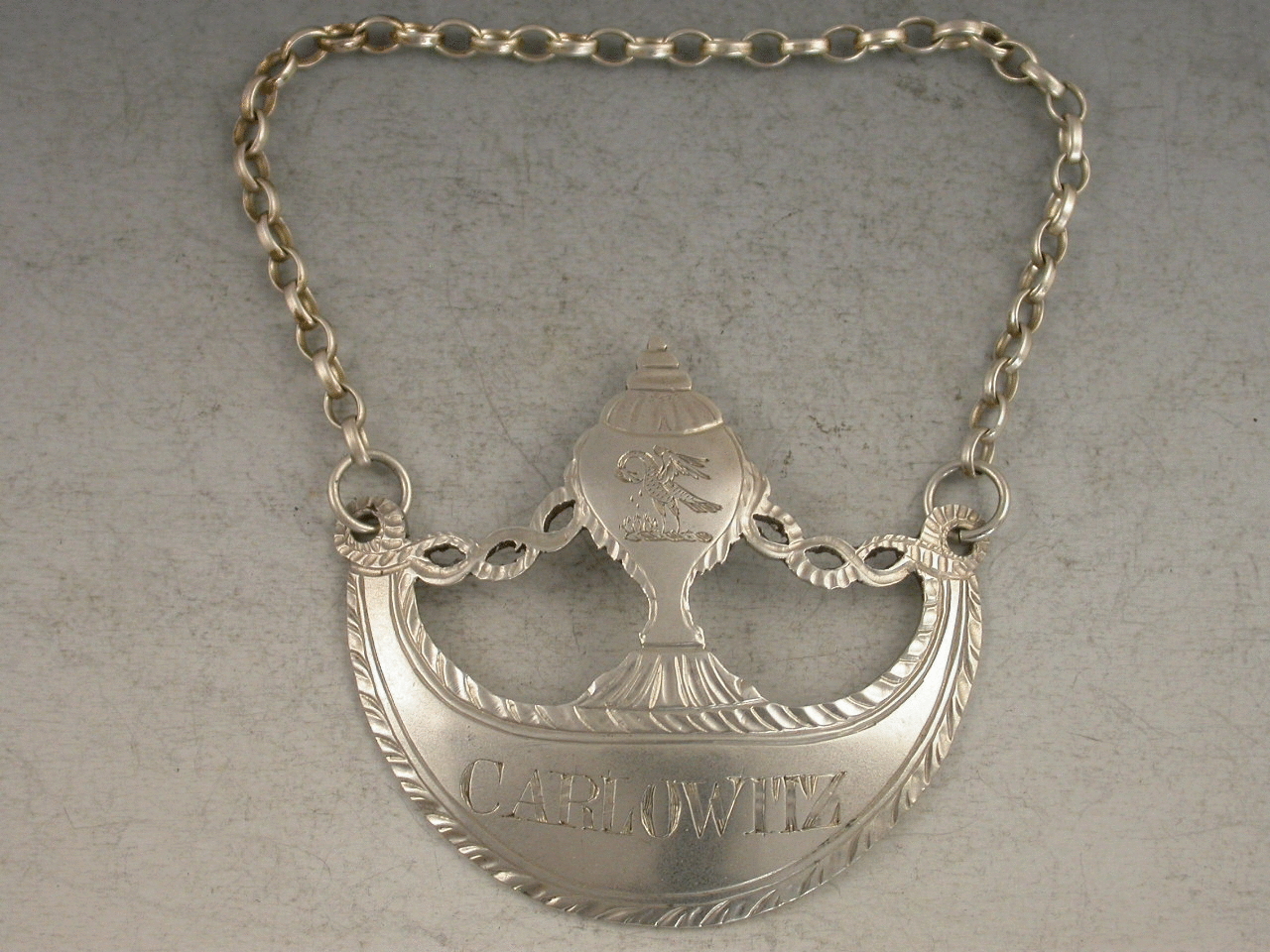 A very fine Victorian silver wine Label in the Neo-Classical style, of crescent form with urn surmount supported by pierced festoons, with bright cut engraved decoration. Incised for Carlowitz (A Hungarian wine). The urn surmount engraved with a crest depicting a Pelican in its Piety.