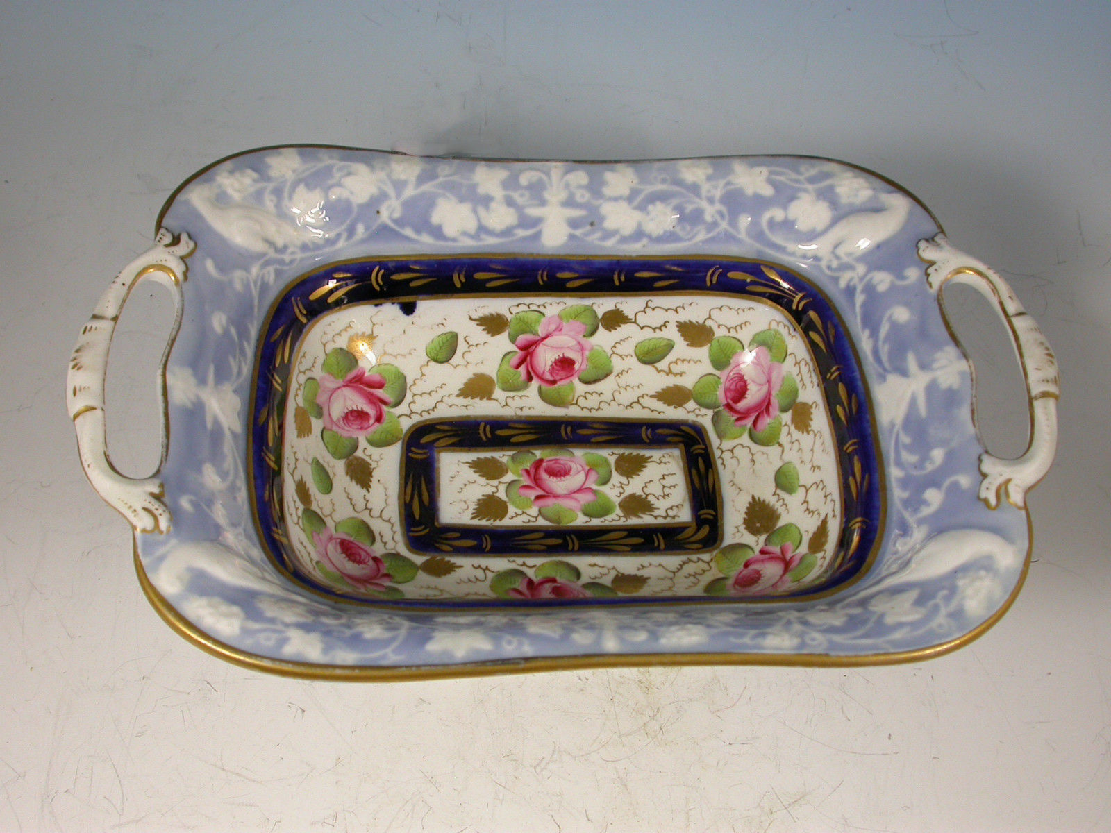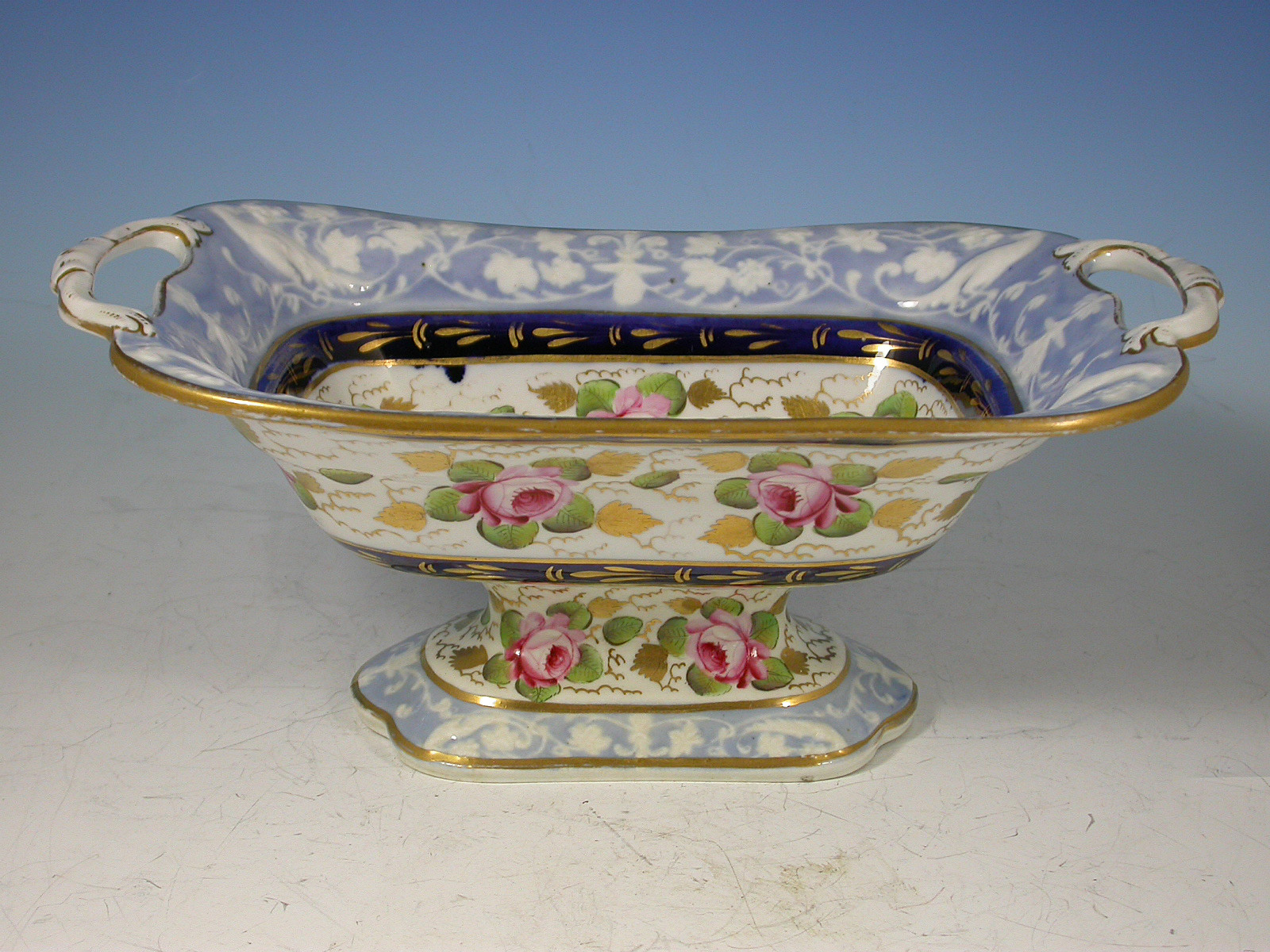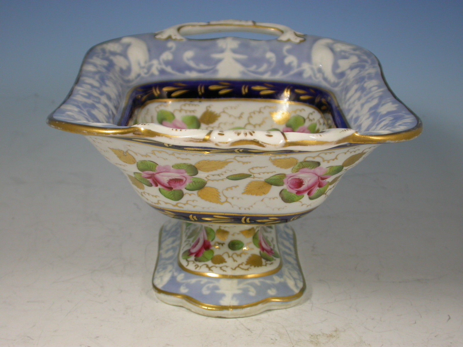 A fine New Hall Bone China Fruit Comport of deep rectangular form with gilt enriched moulded handles, on shaped rectangular foot, hand painted with panels of individual rose heads with gilt enriched cobalt blue reserves. The relief moulded border of exotic birds and trailing leaf and foliate sprays on a sky blue background, all within gilt line rims.
