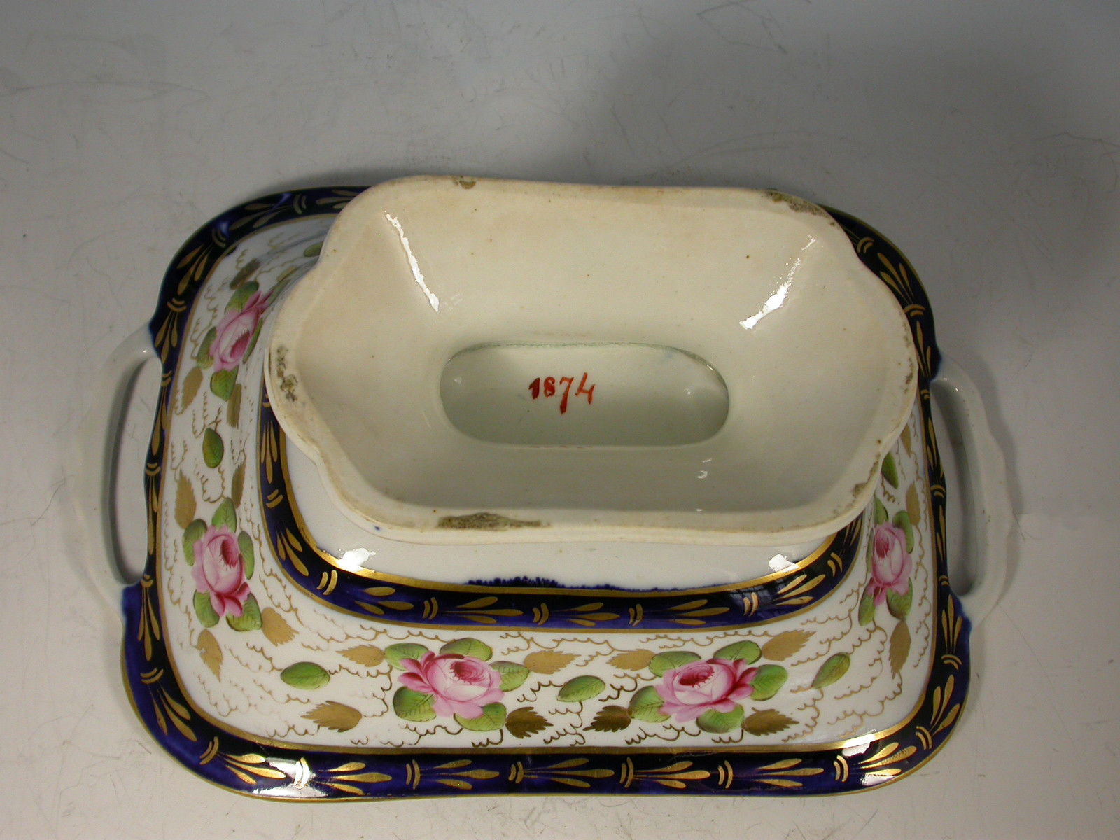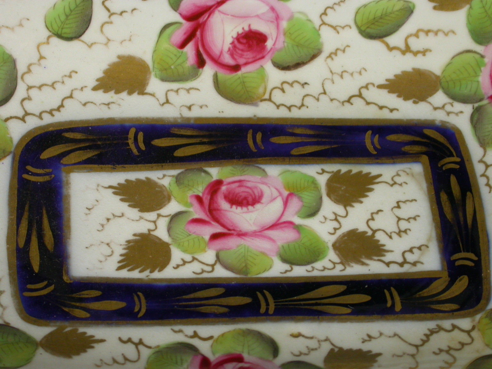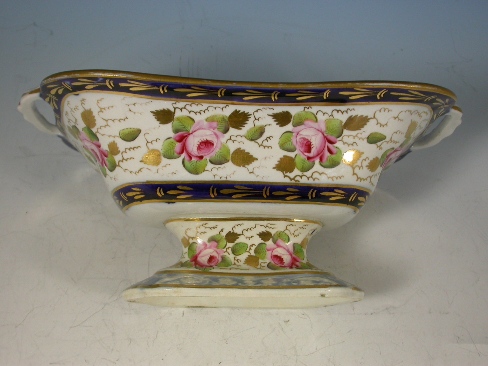 A fine New Hall Bone China Fruit Comport of deep rectangular form with gilt enriched moulded handles, on shaped rectangular foot, hand painted with panels of individual rose heads with gilt enriched cobalt blue reserves. The relief moulded border of exotic birds and trailing leaf and foliate sprays on a sky blue background, all within gilt line rims.