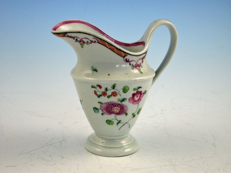 A fine New Hall pedestal footed Cream Jug with divided beak handle, painted with floral sprays, c 1790.