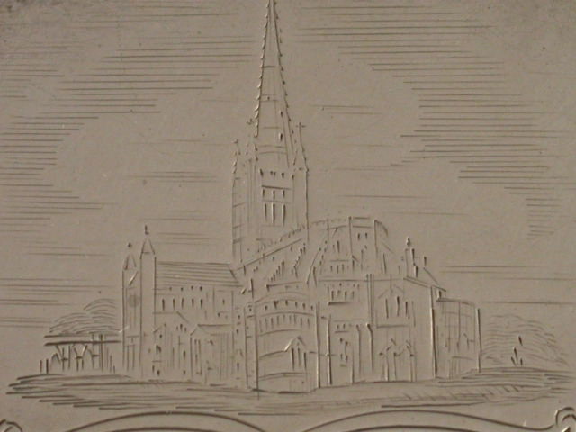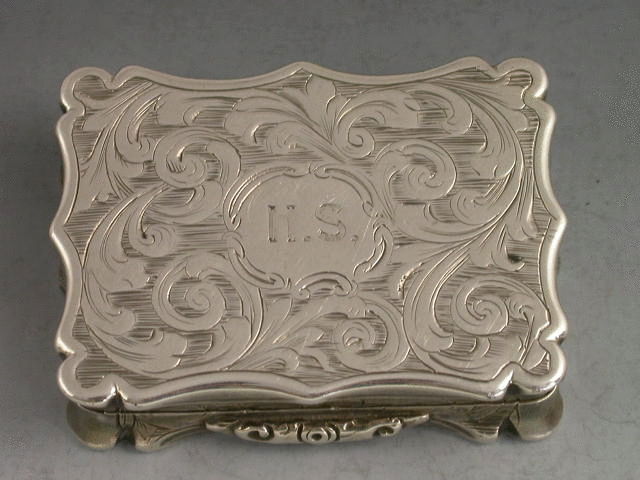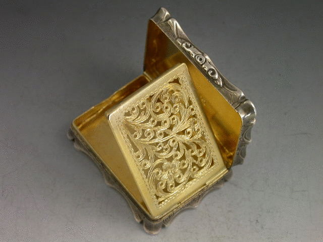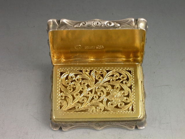 A very rare Victorian silver Vinaigrette of shaped rectangular form, the lid engraved with a scene depicting Norwich Cathedral, silver gilt interior with intricately pierced foliate scroll grille. The base with scrolled decoration and engraved with initials H.S in a shaped cartouche.