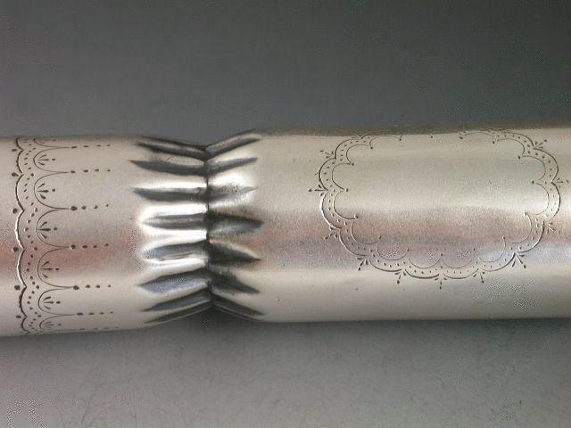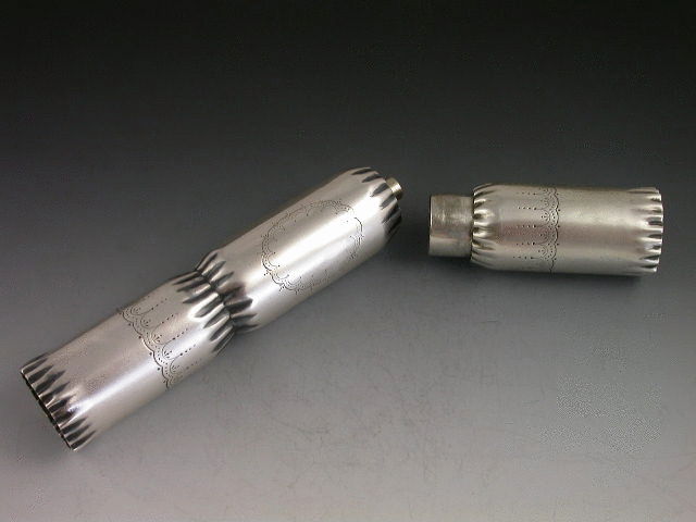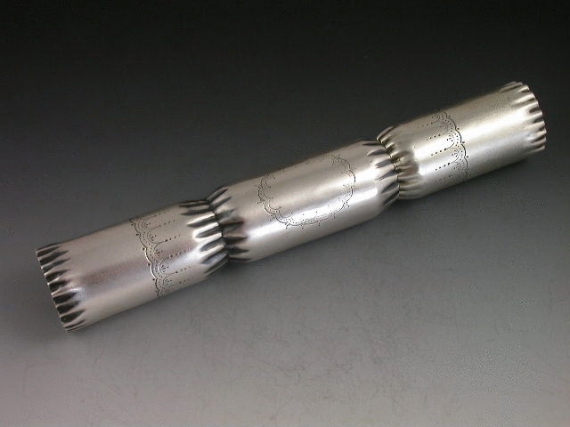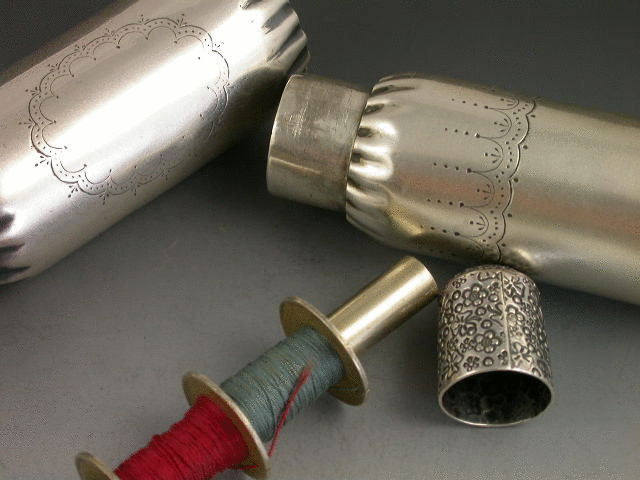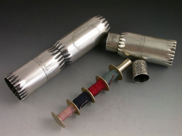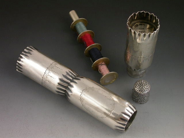 A rare George V Novelty silver Sewing Compendium in the form of a Christmas Cracker which pulls apart to reveal the interior silver gilt thread spool and thimble.