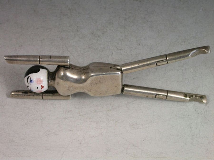 A rare pair of George V Novelty silver articulated Sugar Nips formed as a “Dutch Doll” with finely enamelled head, the internal spring mechanism closing the legs when the arms are squeezed together.