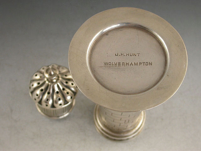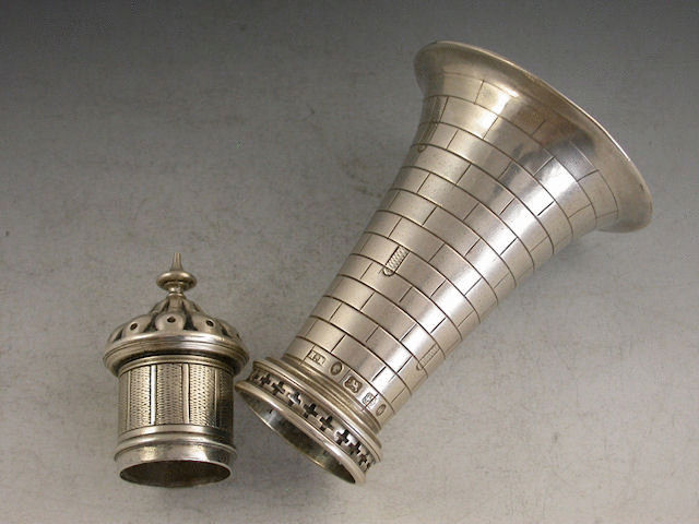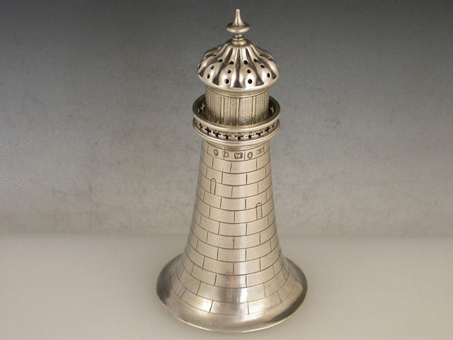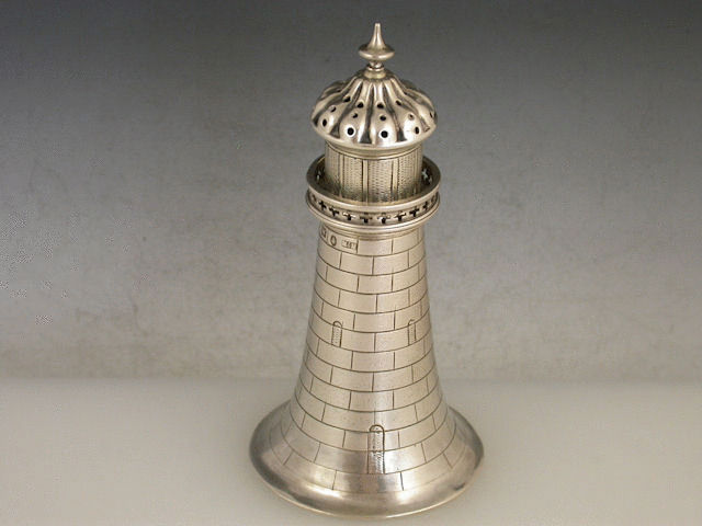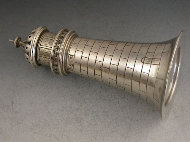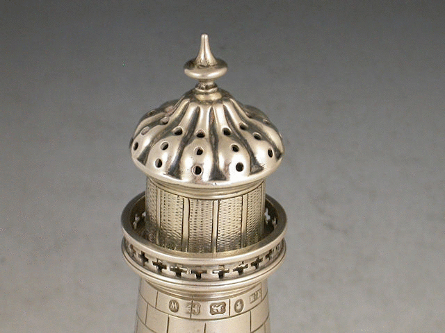 A rare Victorian novelty silver Pepper Castor modelled in the form of a Lighthouse, realistically engraved depicting the brickwork, windows and glass panels.