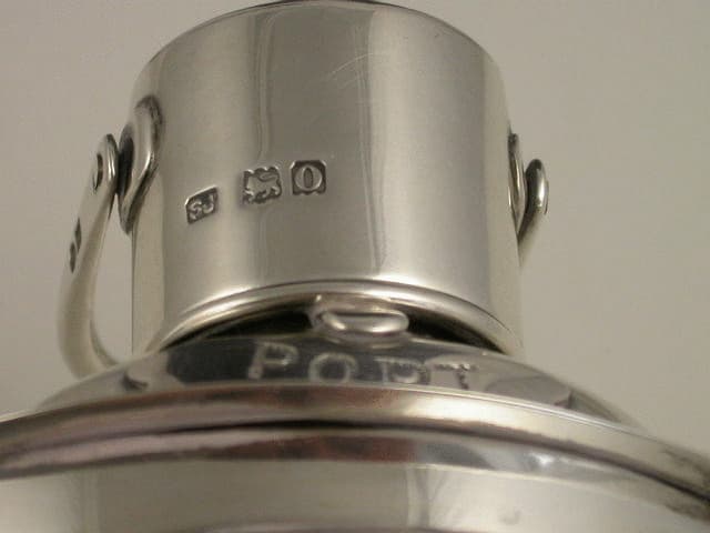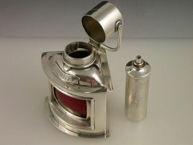 A rare Edwardian Novelty silver Table Lighter in the form of a Ships Port Lantern, the triangular shaped panelled body with red glass liner, hinged flip-top lid opening to reveal the fuel reservoir and wick holder. Shaped plaque engraved “PORT”.