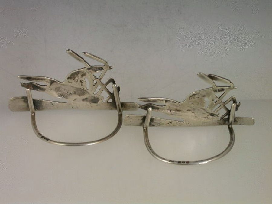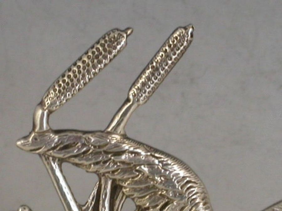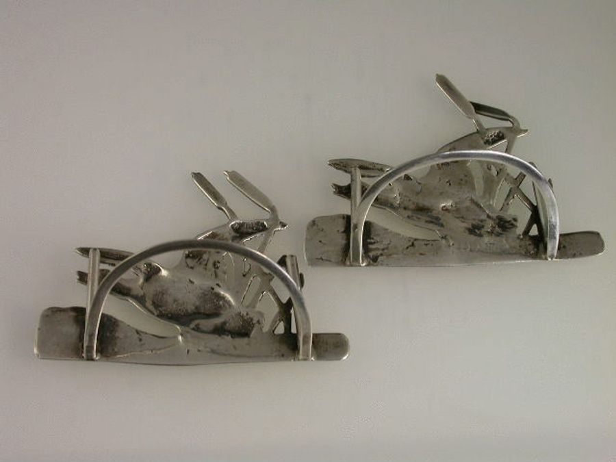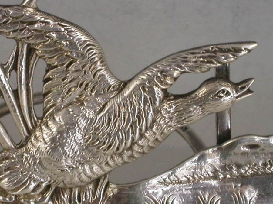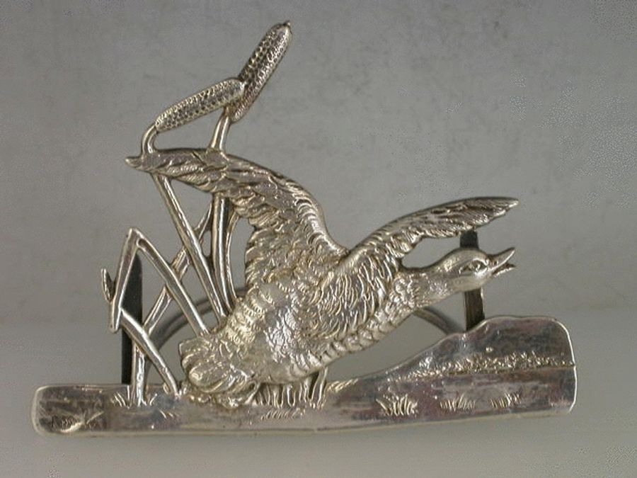 A good pair of Edwardian novelty cast silver Menu Holders formed as Ducks taking flight amongst bulrushes.