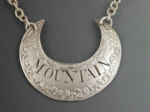 A rare 18th century Old Sheffield Plate Wine Label of crescent form with stamped entwined flowers to the border on a matt background, incised and niello filled for MOUNTAIN.