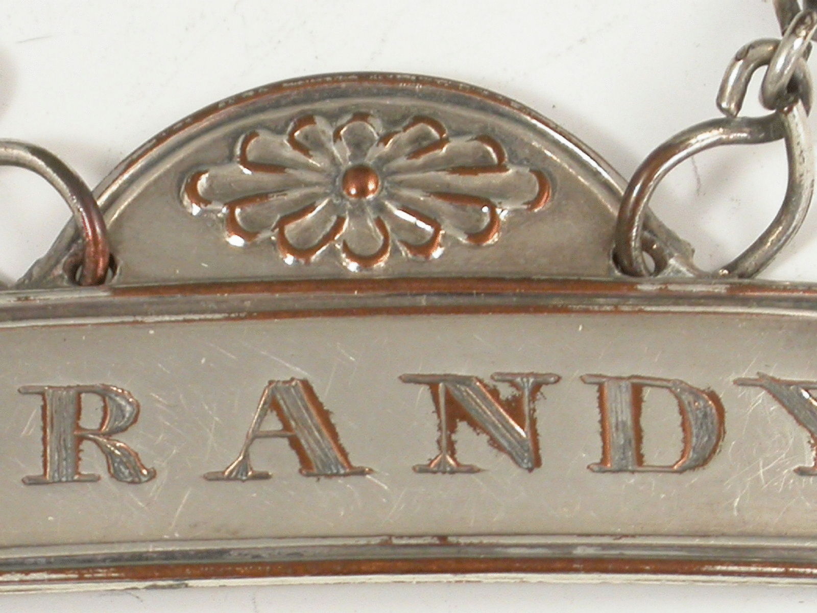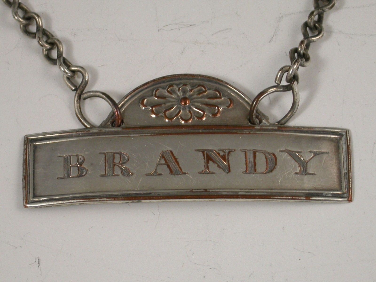 A fine 18th century Old Sheffield Plate Wine Label in the neo-classical style of reeded narrow rectangular form with dome stamped with fluted flower head device, incised for Brandy. Complete with original suspension chain with distinctive figure of eight links.