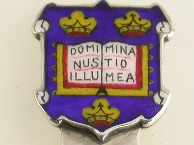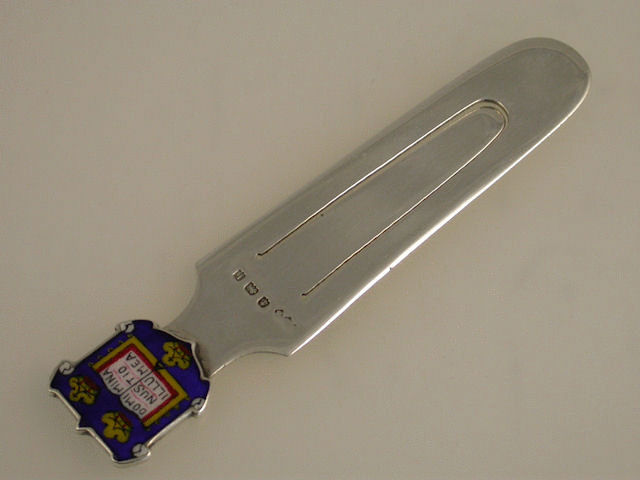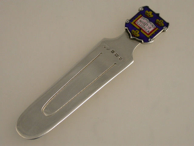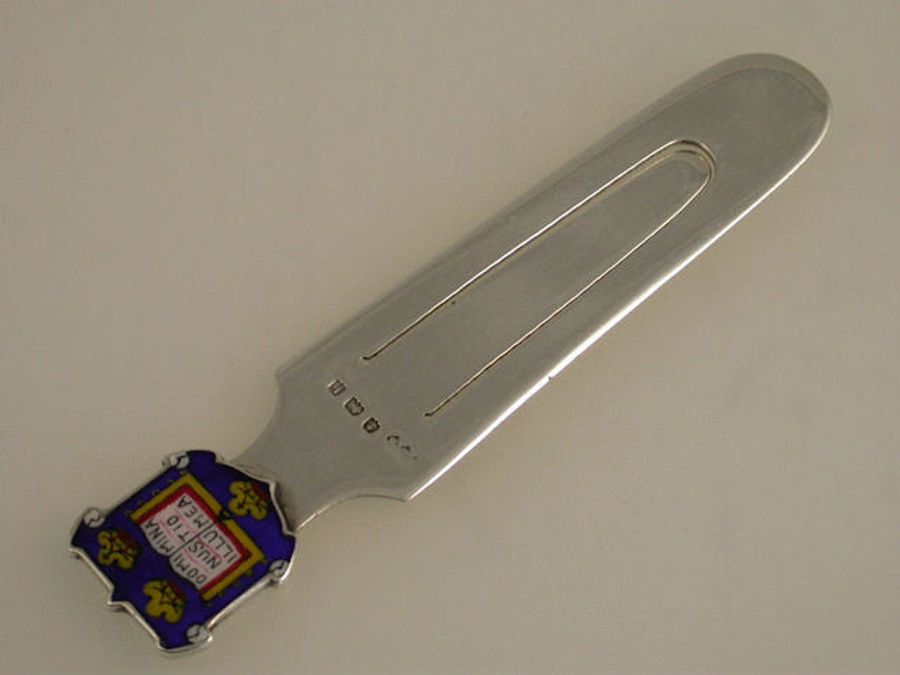 A good Edwardian silver Bookmark, the enamel terminal formed as the Coat of Arms of Oxford University, depicting an open book between three Crowns with the words Dominus Illuminatio Mea, meaning “The Lord is my light” on a royal blue shield.