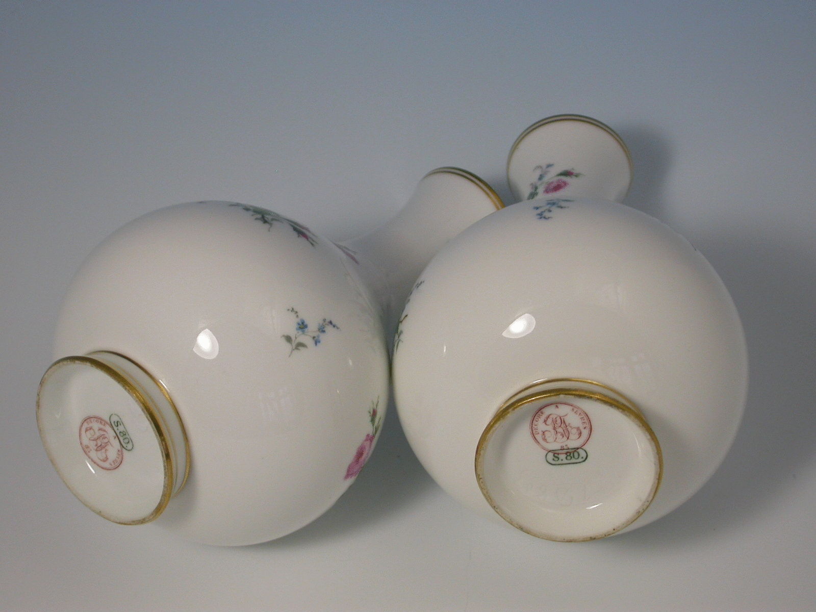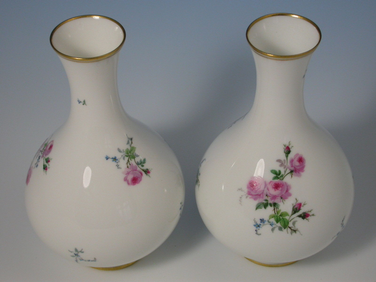 A pair of late 19th century Sevres Bottle Vases finely painted with sprays of pink roses and blue flowers.