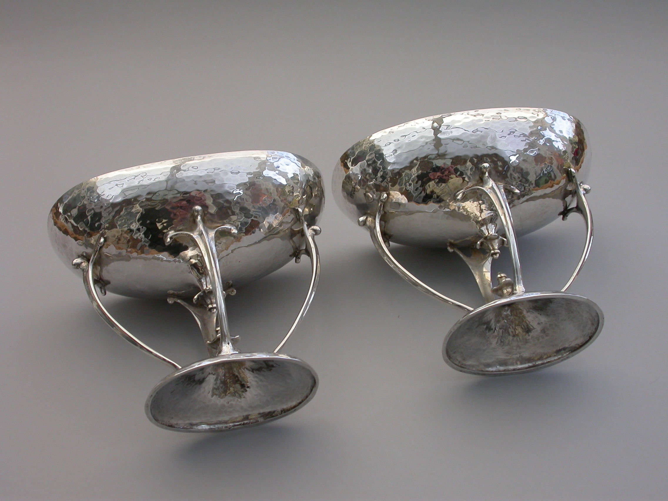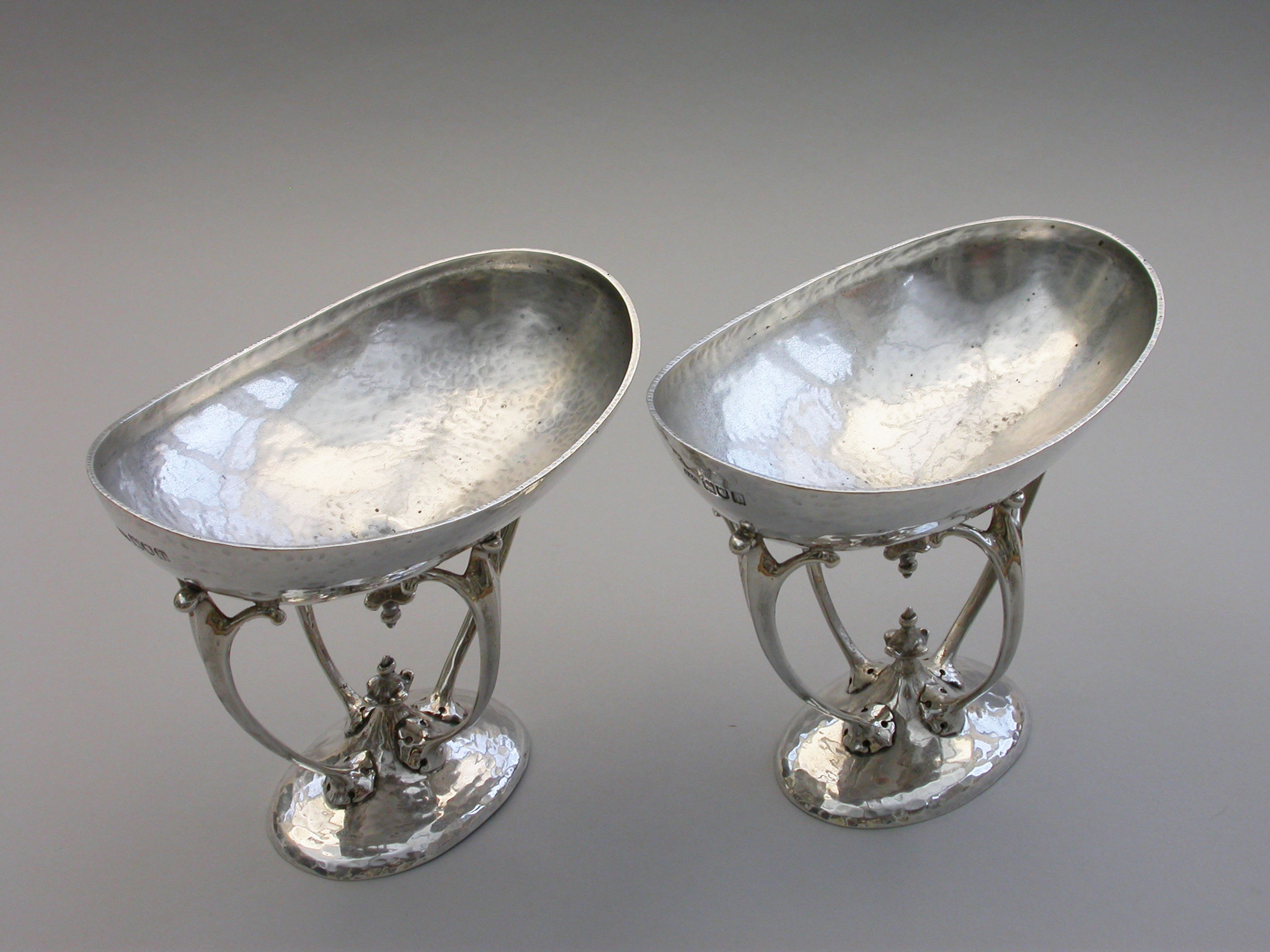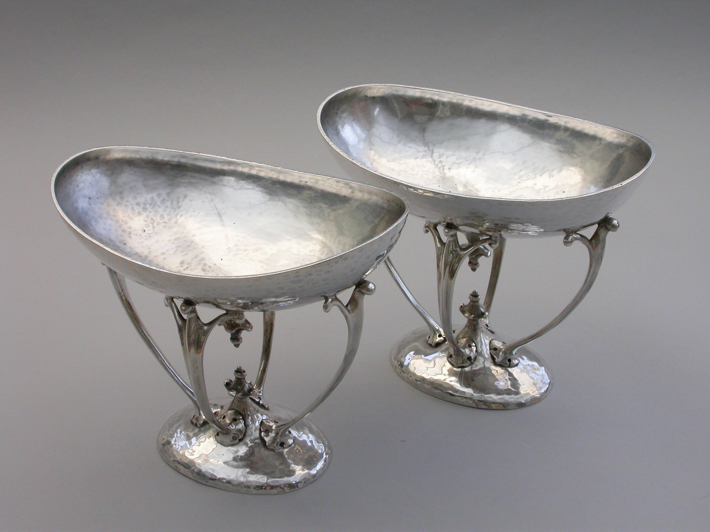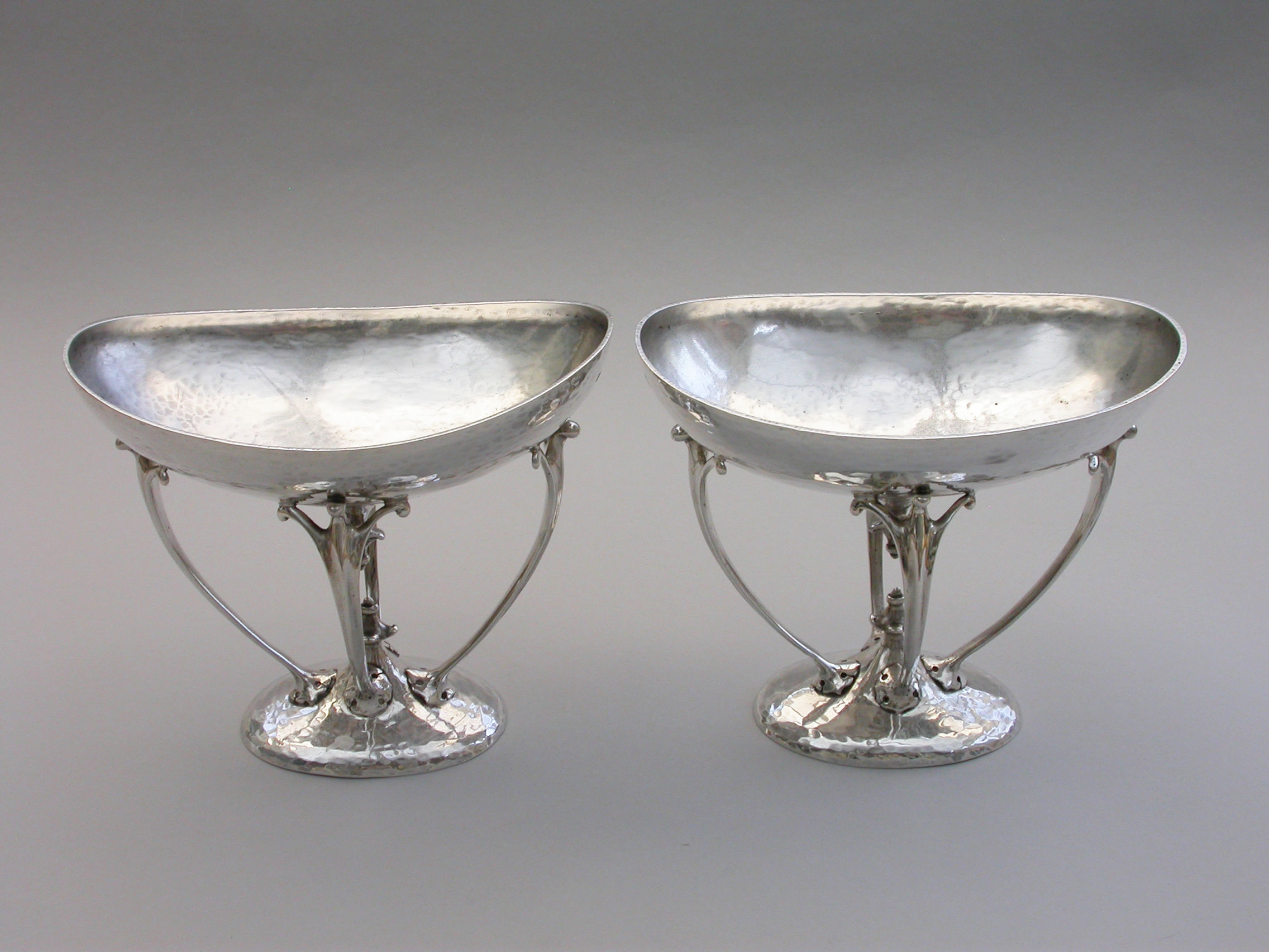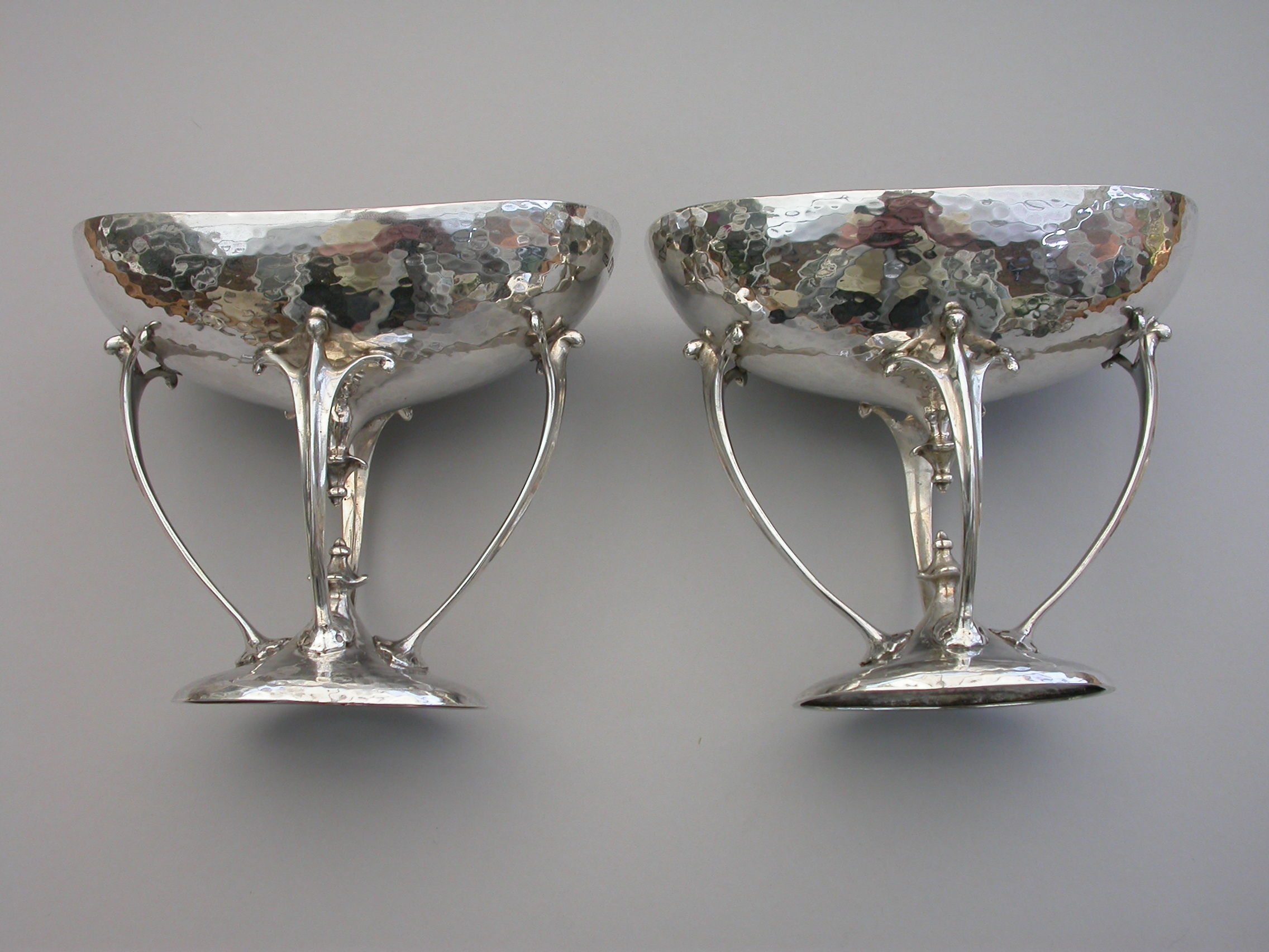 A good quality pair of Edwardian silver Bowls made in the Arts and Crafts style with a hammered finish, the oval bowls supported by four scrolled legs.