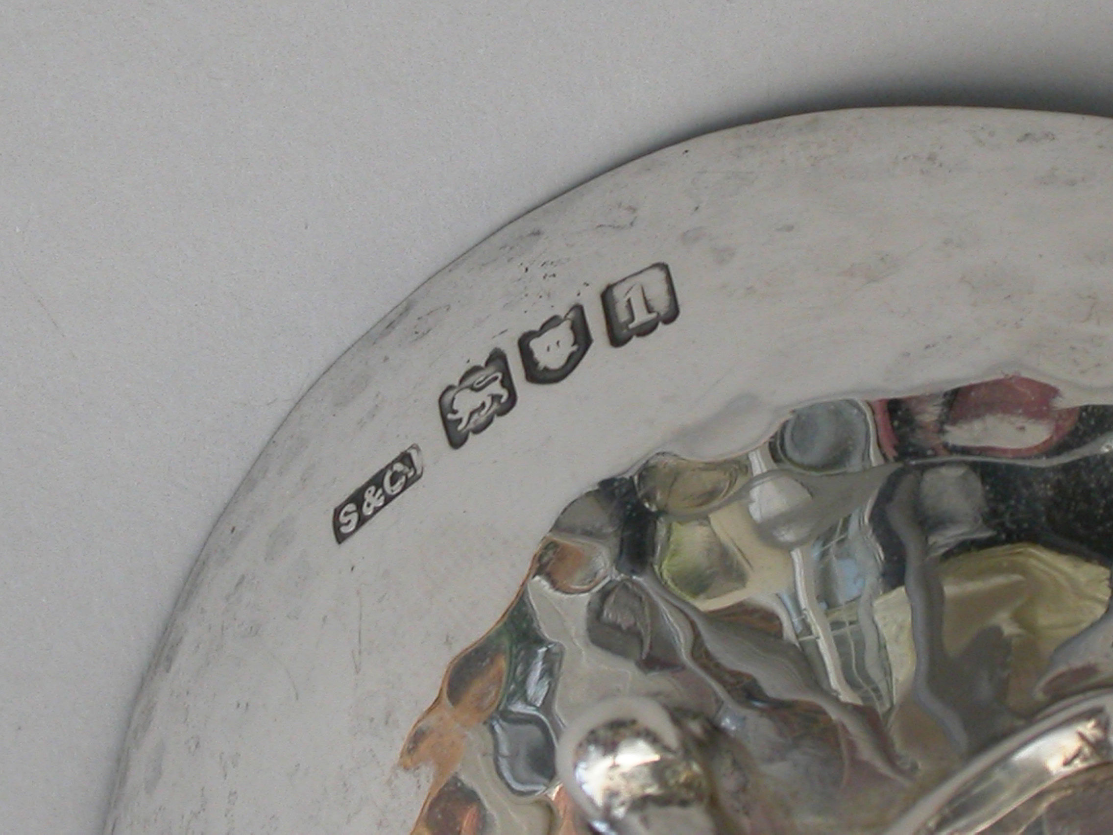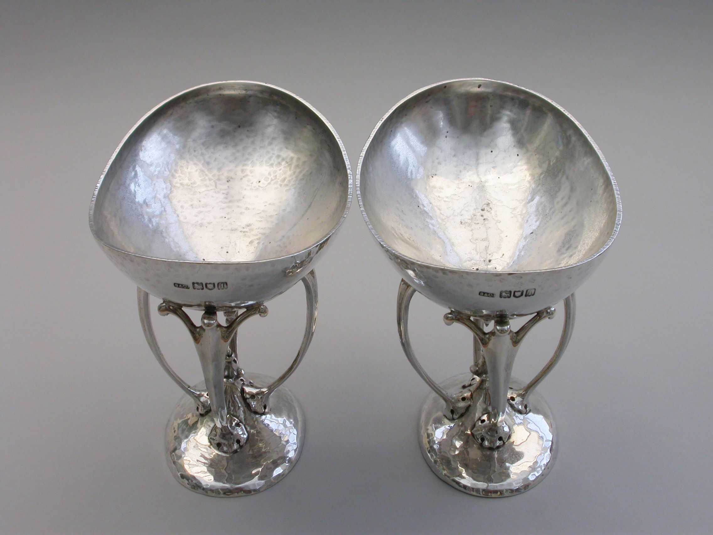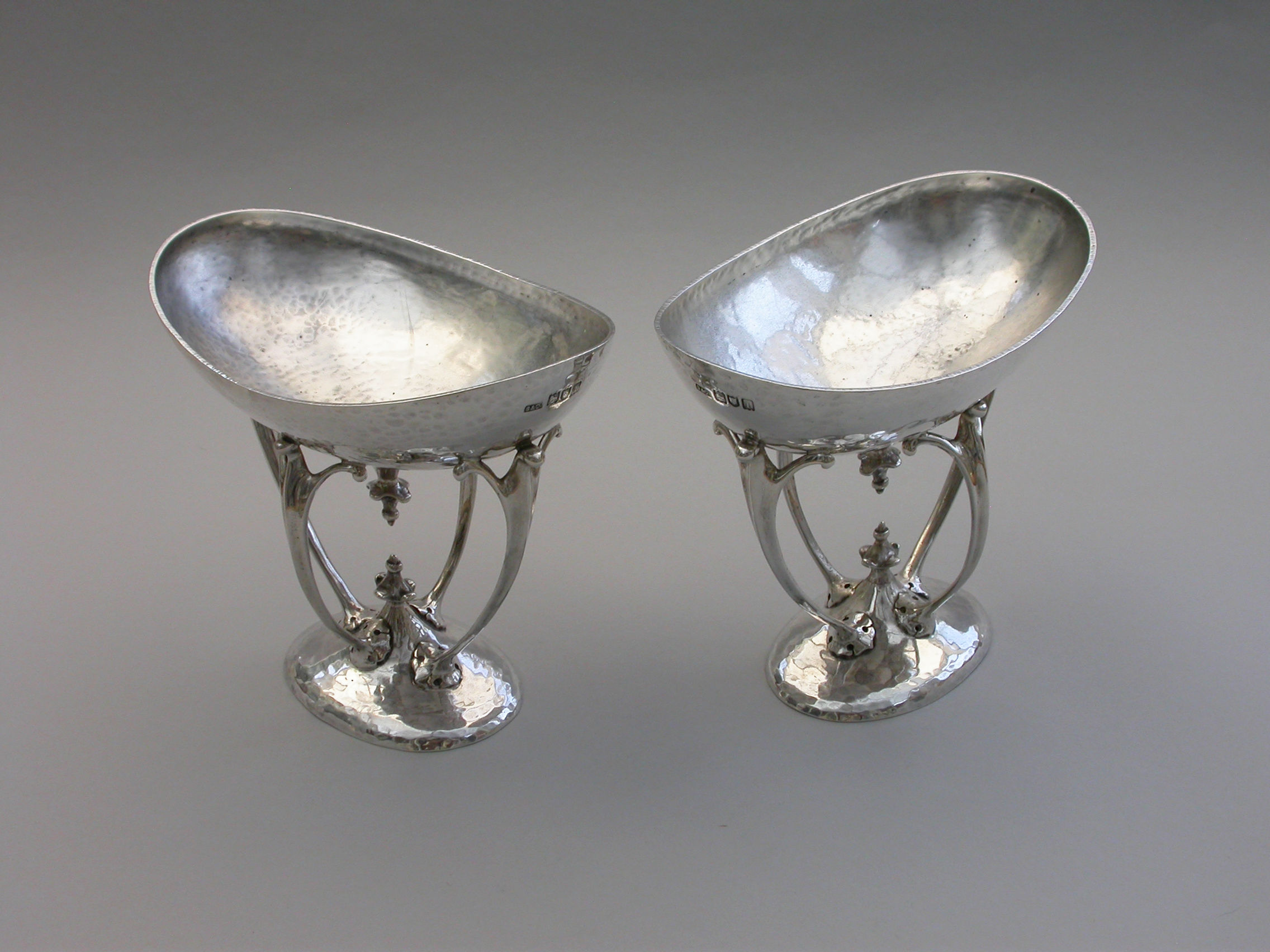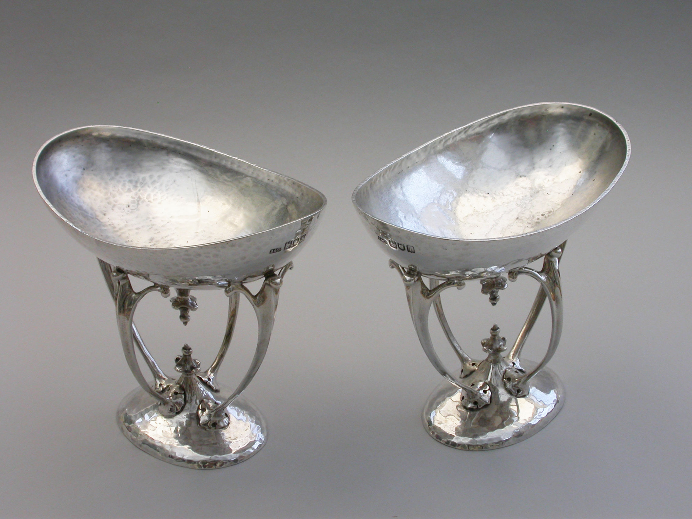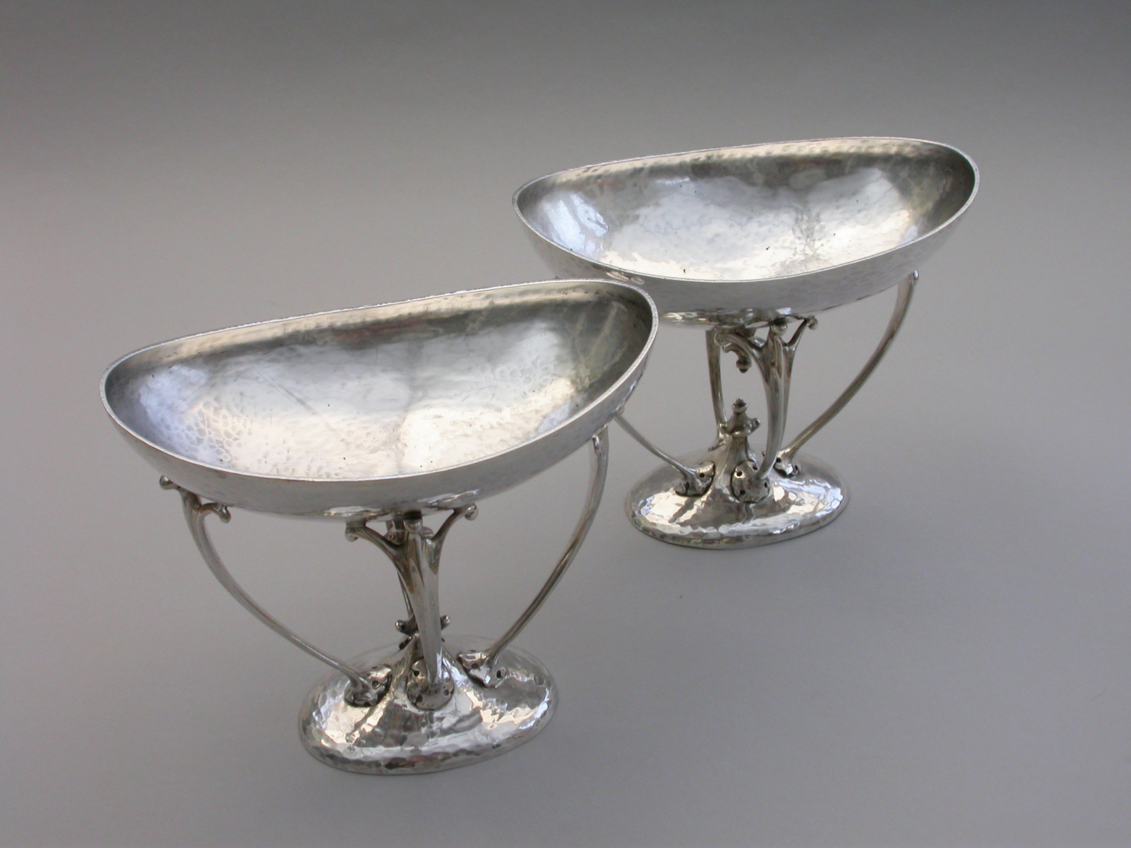 A good quality pair of Edwardian silver Bowls made in the Arts and Crafts style with a hammered finish, the oval bowls supported by four scrolled legs.
