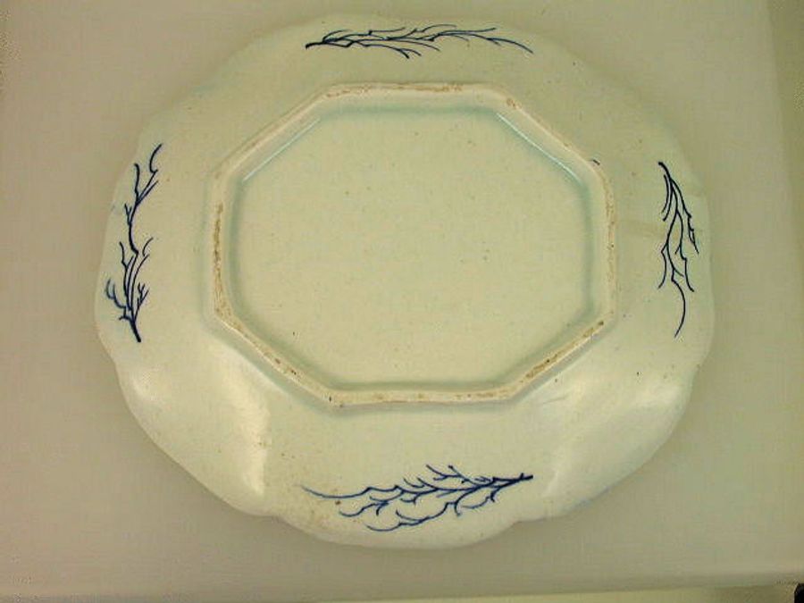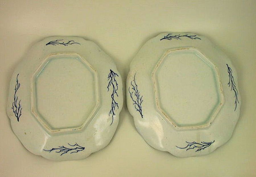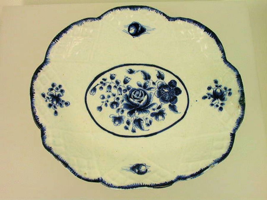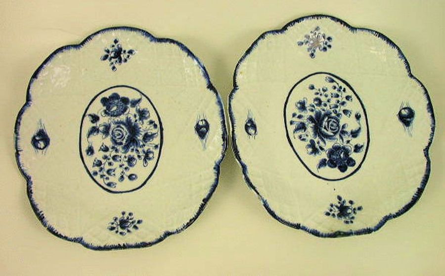 A good pair of Bow basket weave moulded Dishes of small size, painted in underglaze blue with a central oval reserve of flower sprays within a border of scattered foliate sprays and insects, blue line rims, the reverse with scattered sprigs.