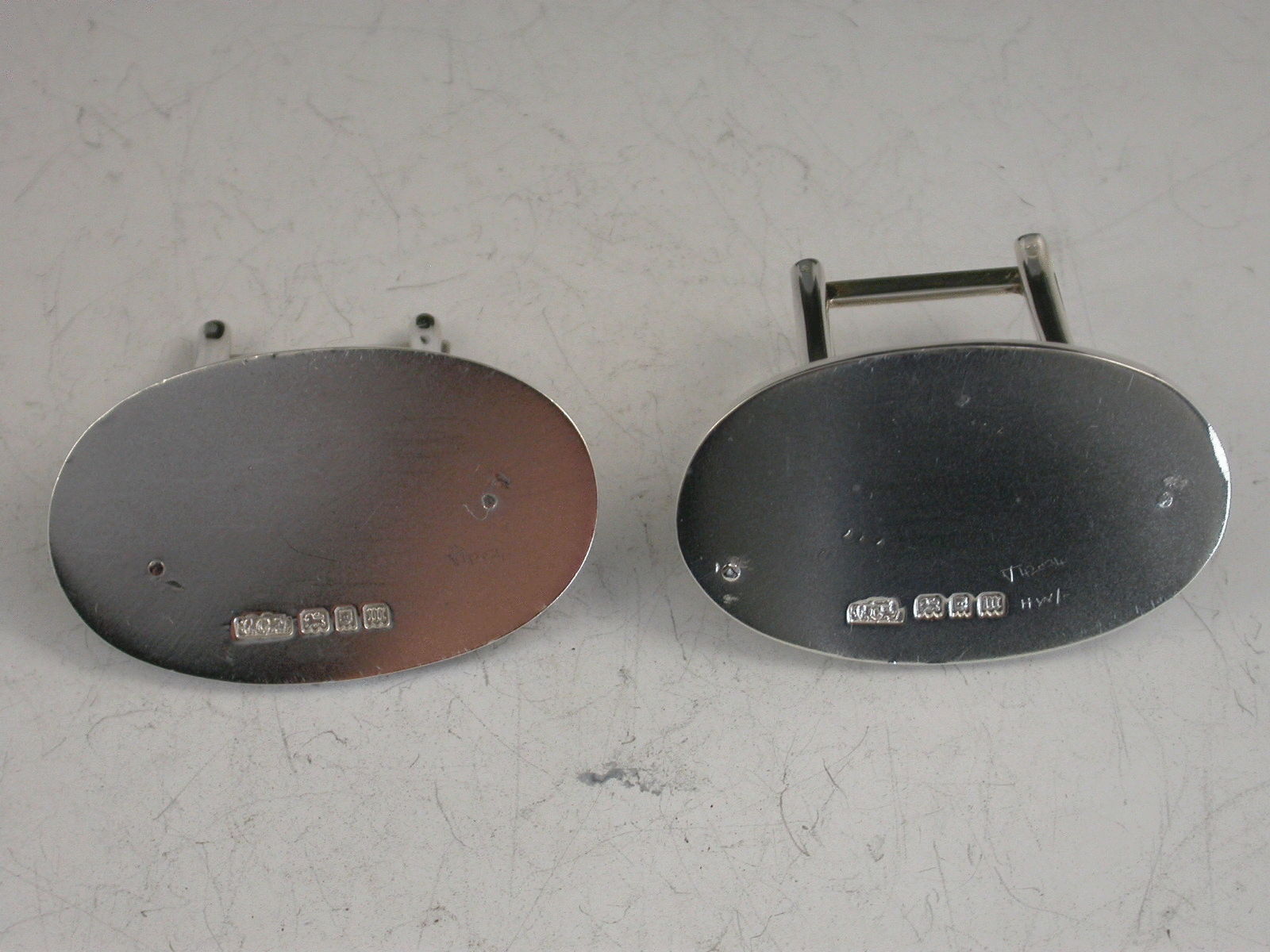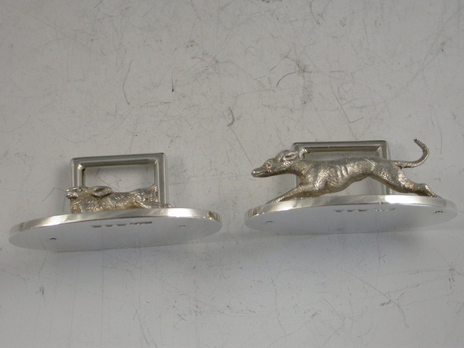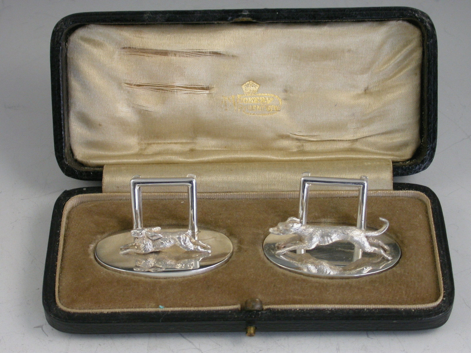 A fine pair of George V cased silver Menu Holders, the heavy cast figures depicting a hare and a hound, on plain oval bases. Complete with original silk and velvet lined leather case.