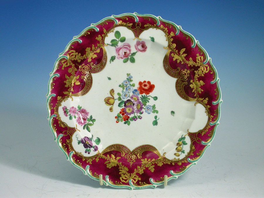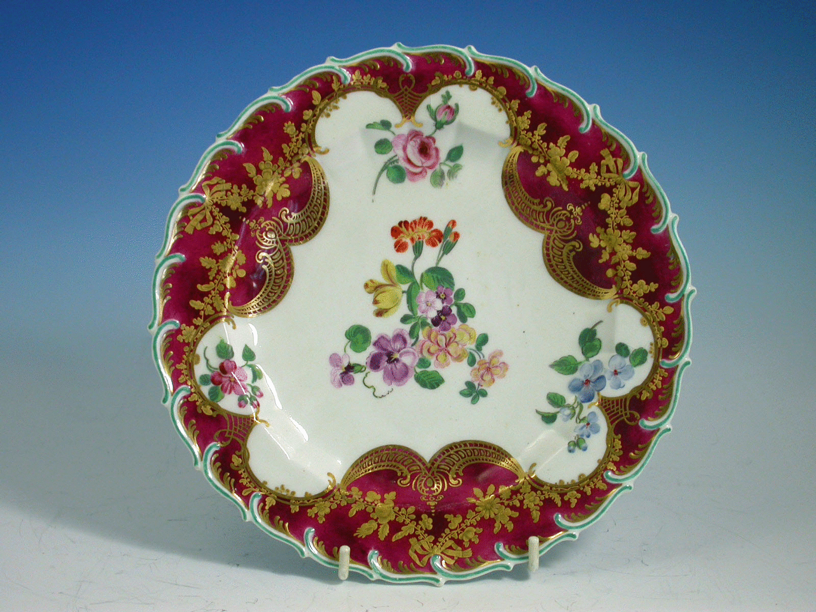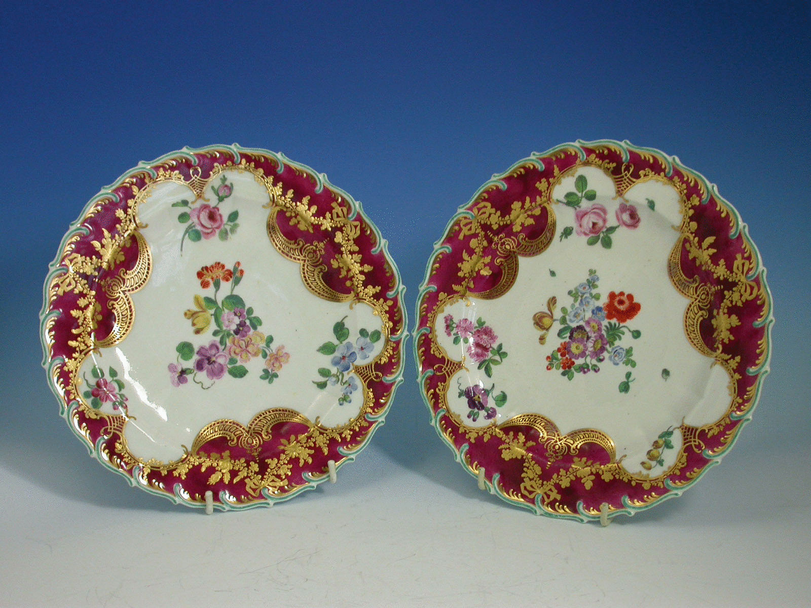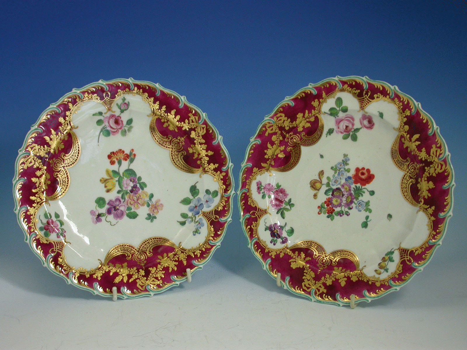 A very fine pair of Chelsea Gold Anchor Dessert Plates, finely painted with bouquets of English flowers within a claret ground border enriched with tooled gilt garlands, turquoise scrolled rims.