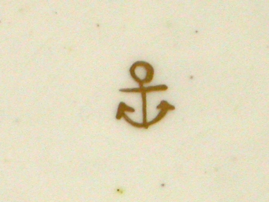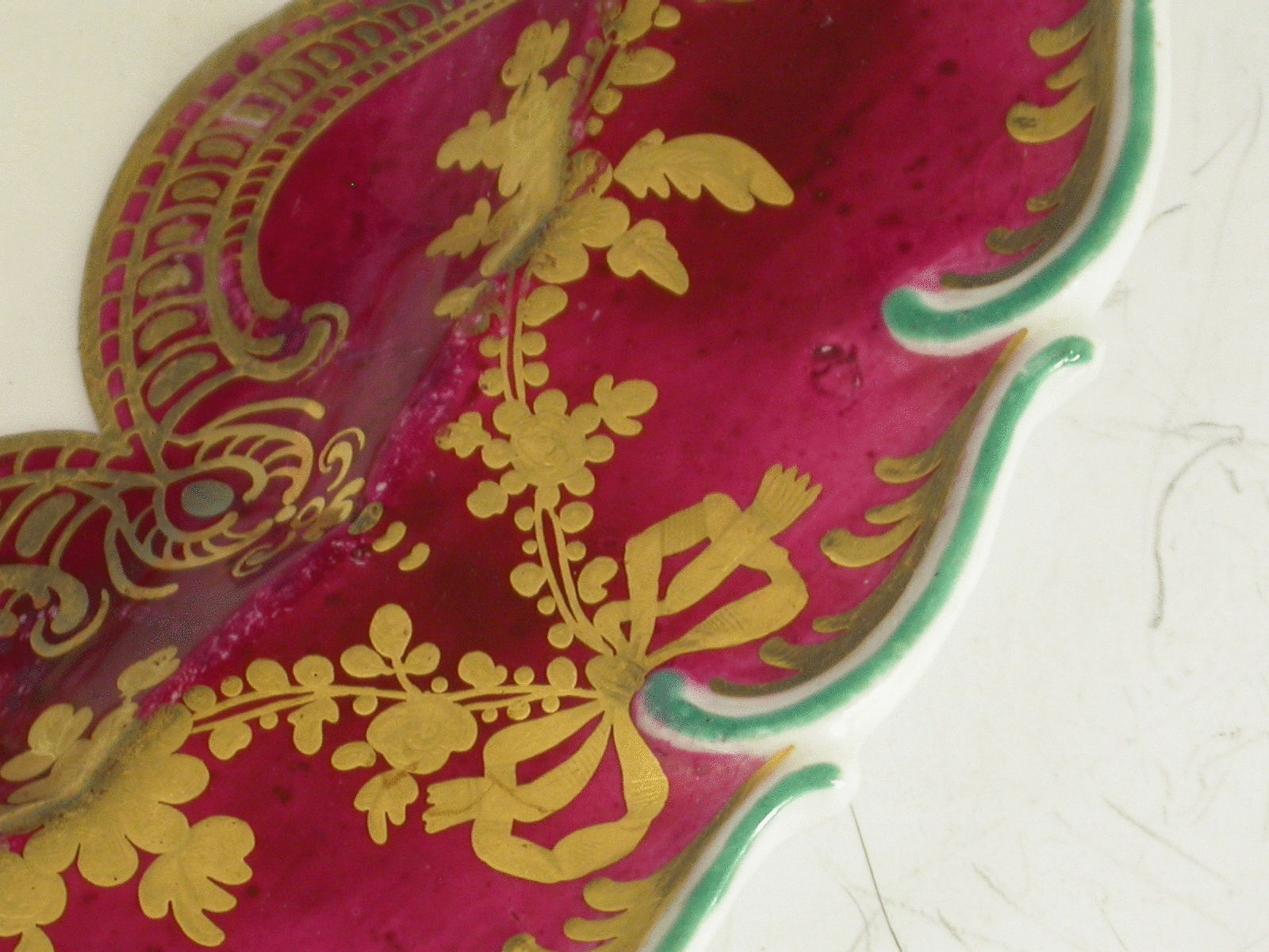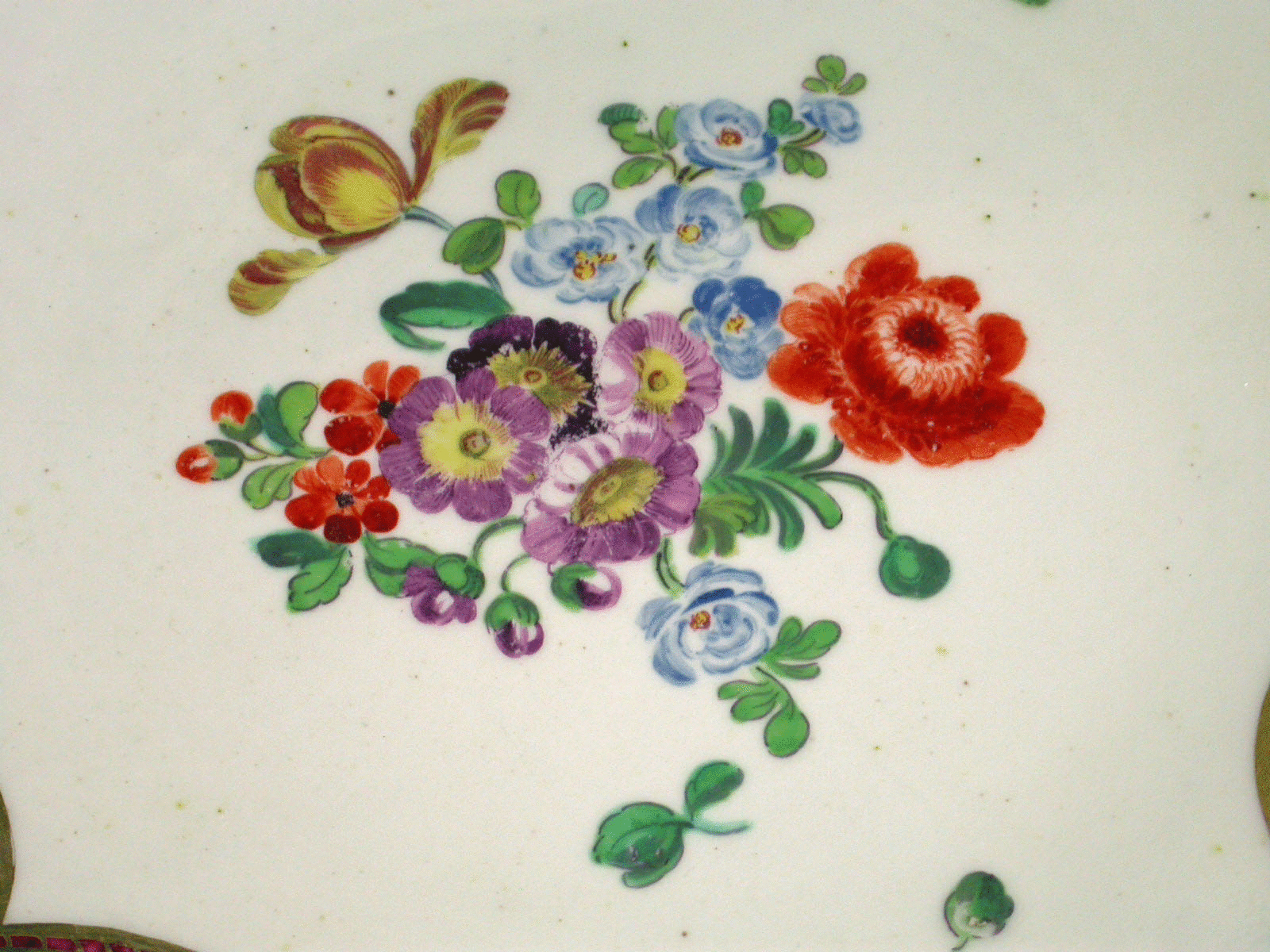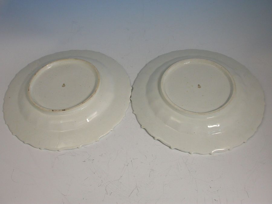 A very fine pair of Chelsea Gold Anchor Dessert Plates, finely painted with bouquets of English flowers within a claret ground border enriched with tooled gilt garlands, turquoise scrolled rims.