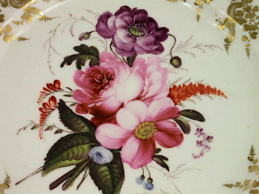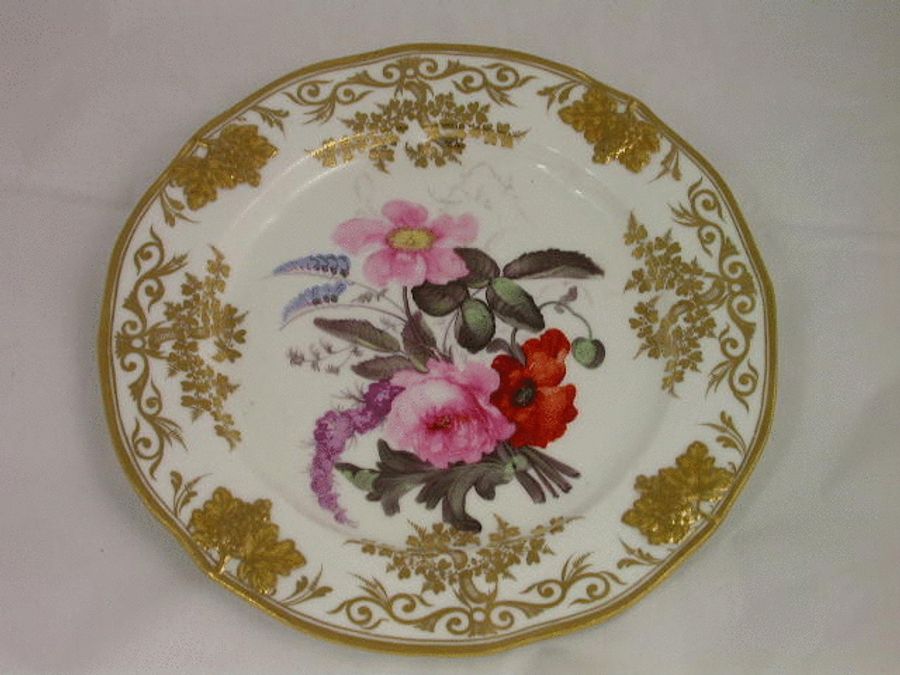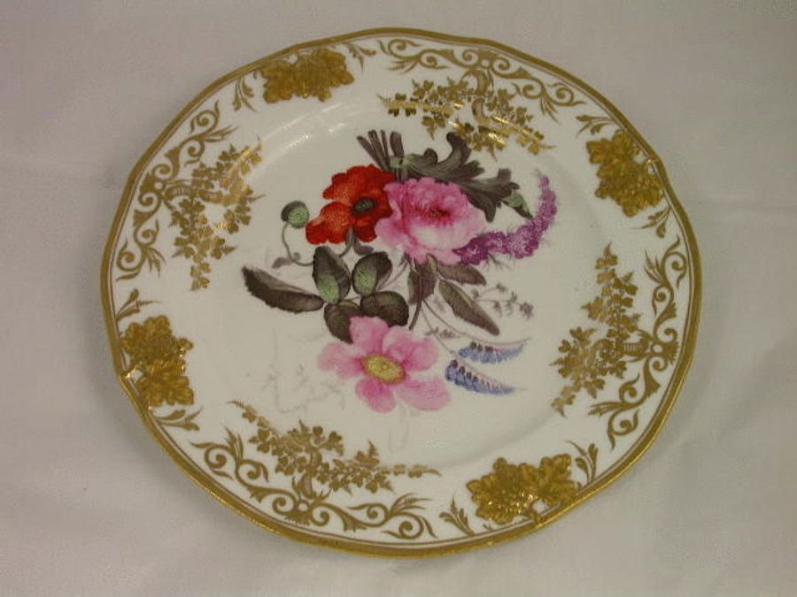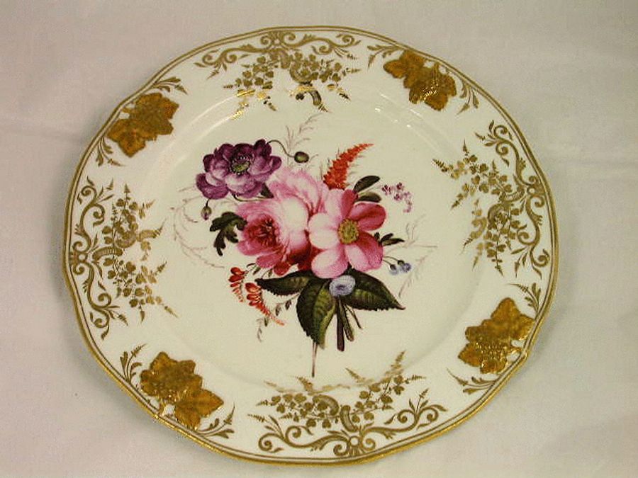 A fine and rare pair of Coalport Dessert Plates, painted with a bouquet of flowers within a relief moulded border of vine leaves and grapes.