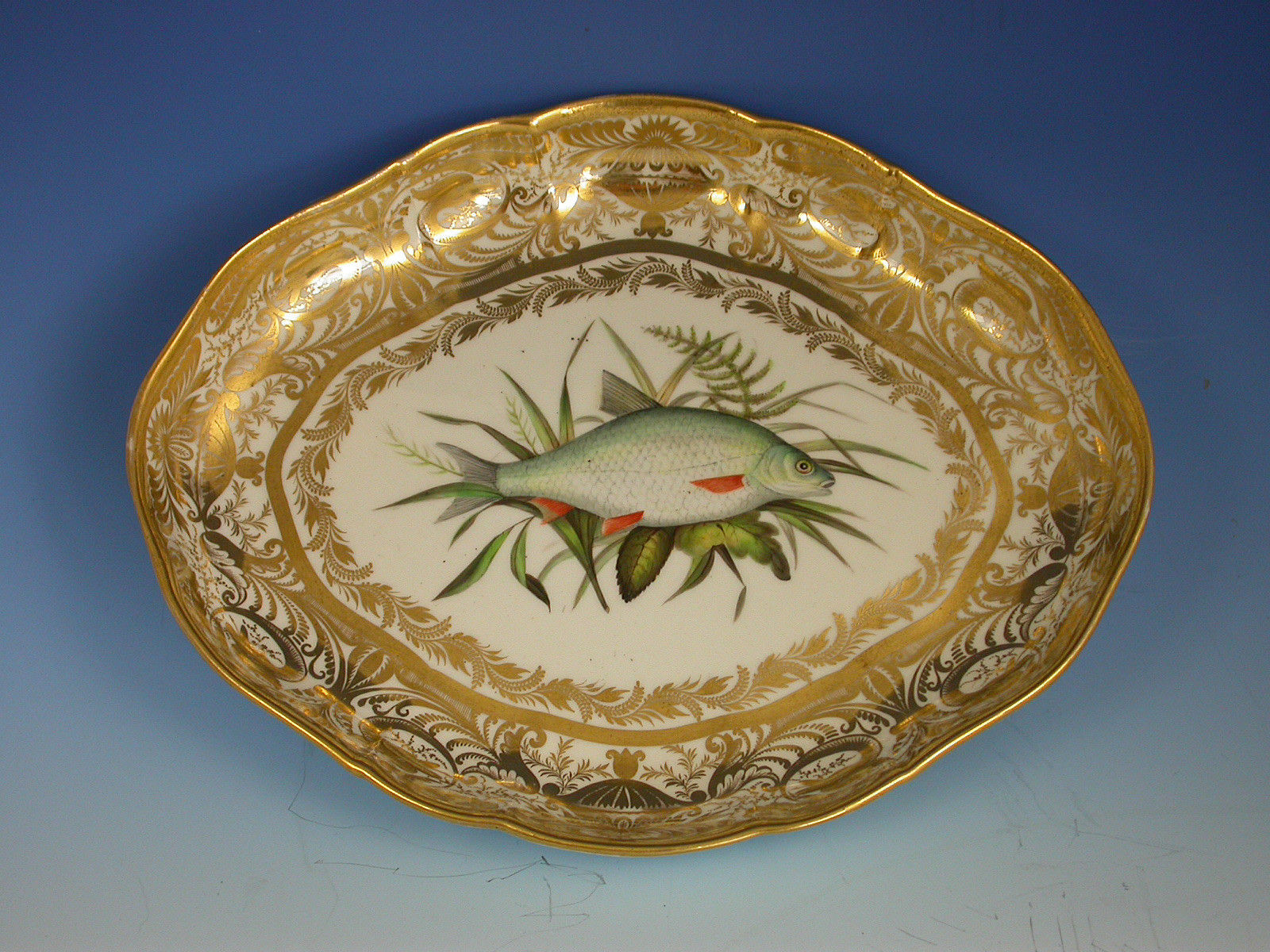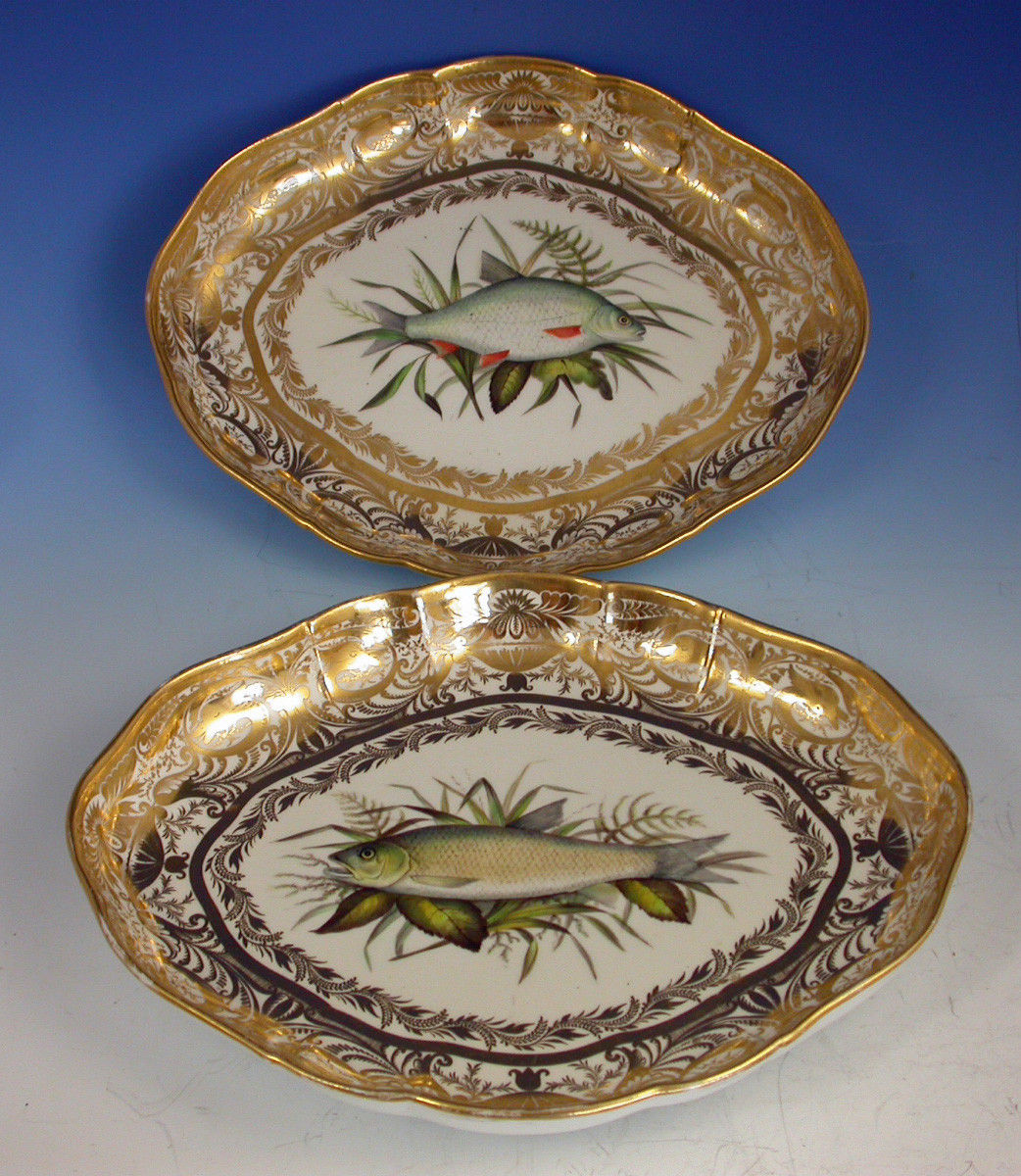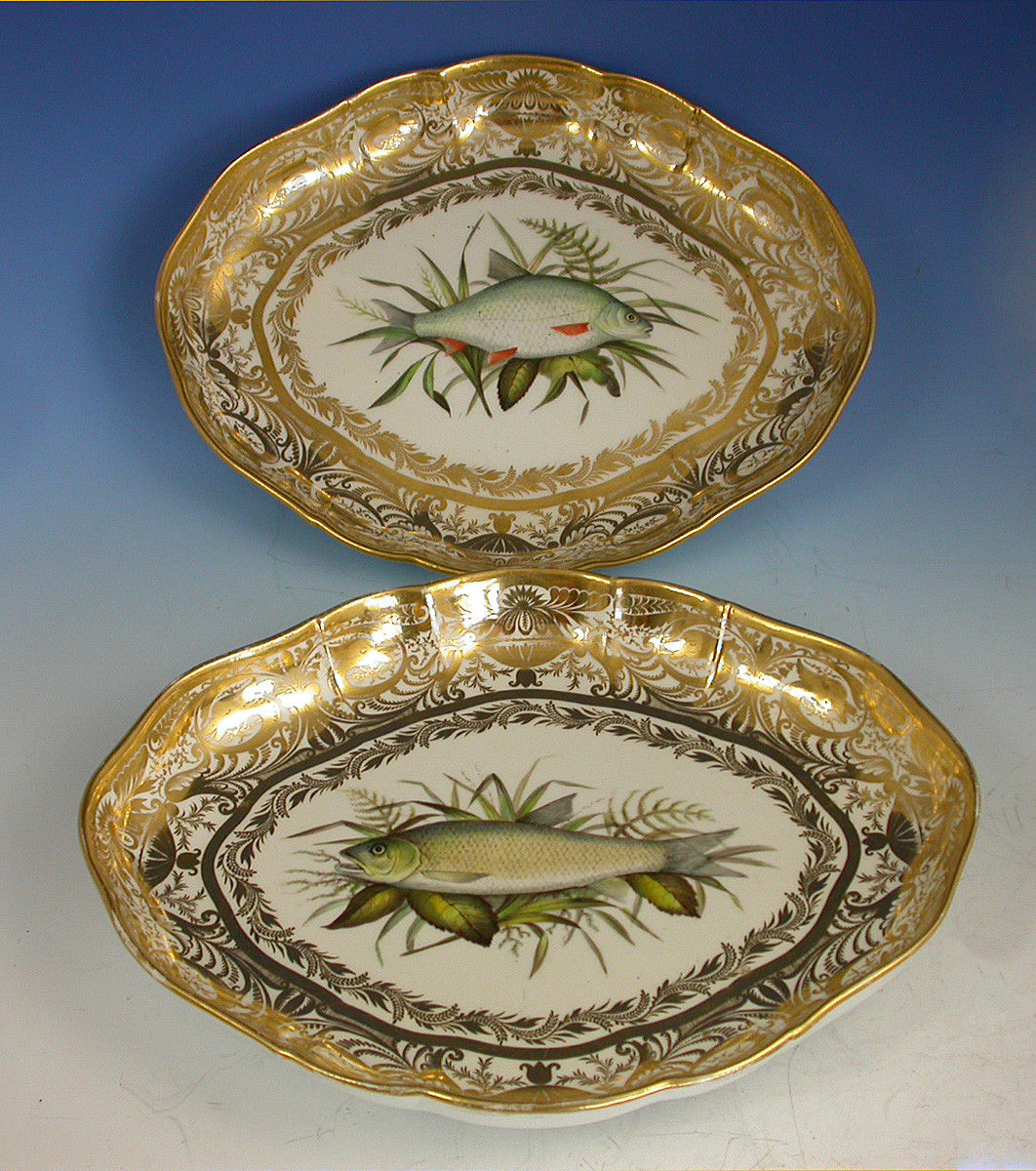 A very rare pair of early 19th century Derby ichthyological Dessert Dishes of lozenge form, painted in the central reserve with a Chub and a Roach within an elaborate gilded border.