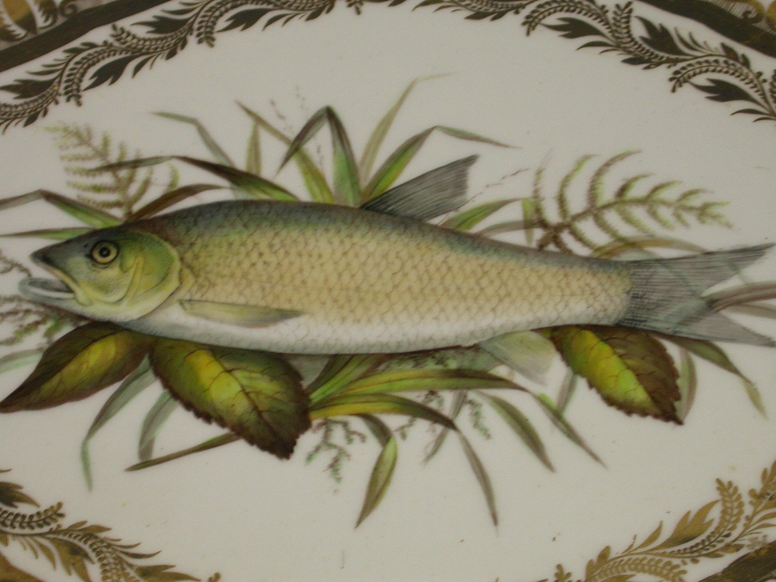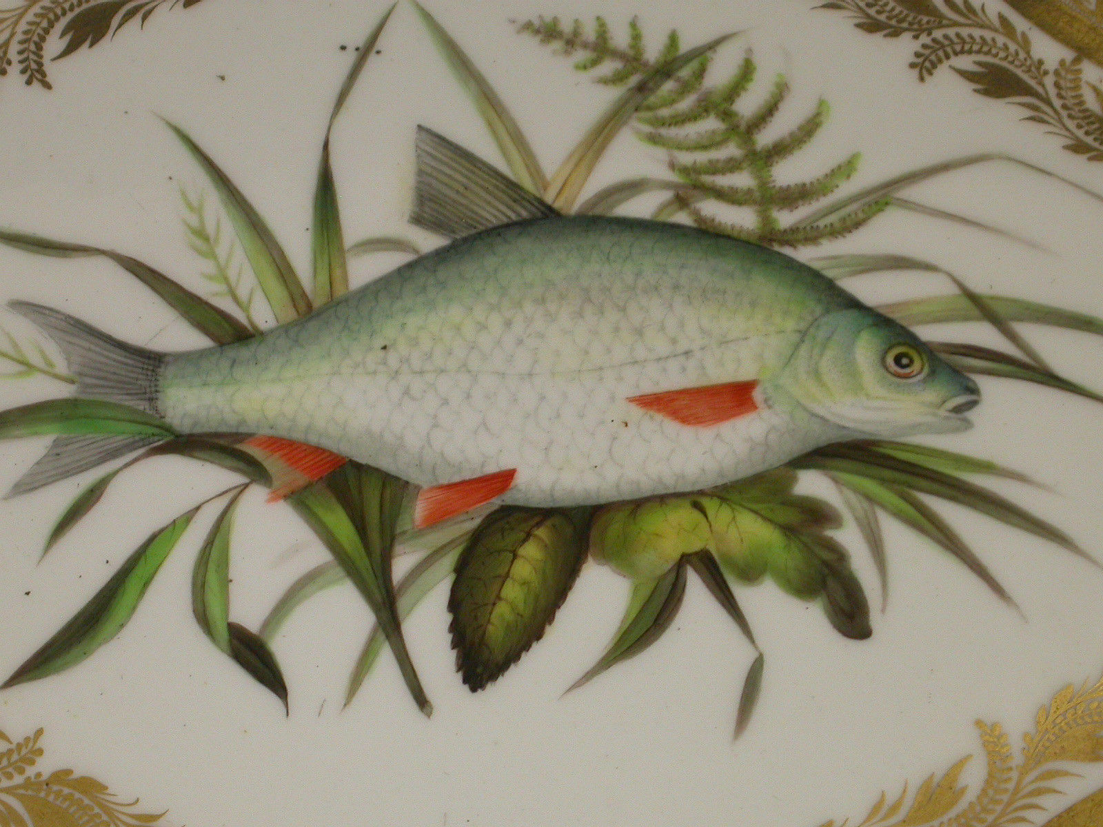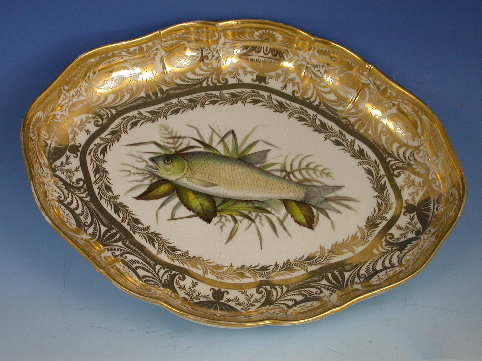 A very rare pair of early 19th century Derby ichthyological Dessert Dishes of lozenge form, painted in the central reserve with a Chub and a Roach within an elaborate gilded border.