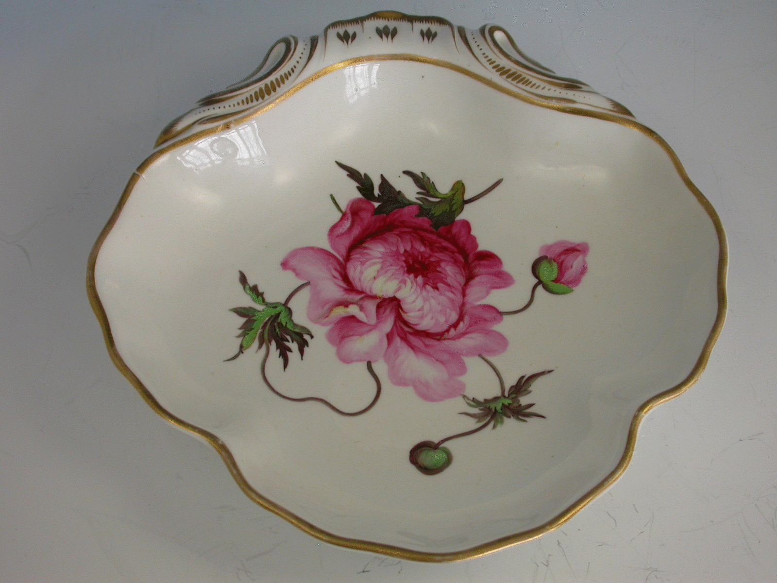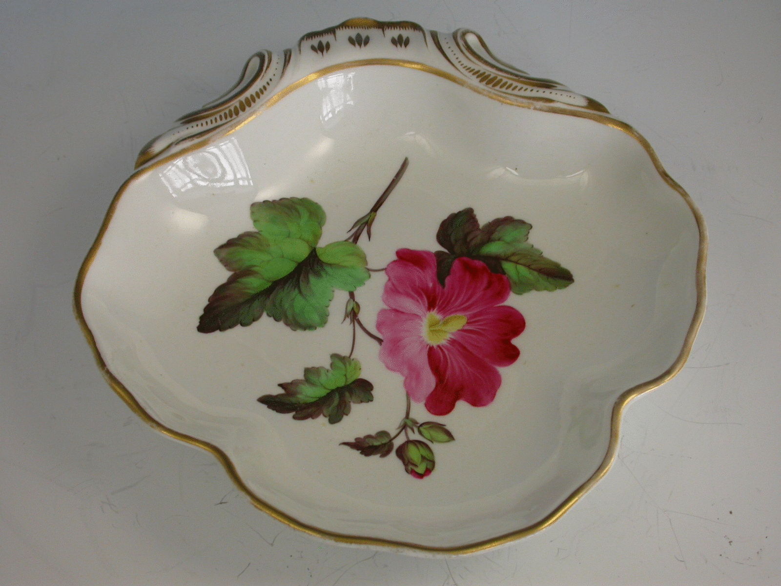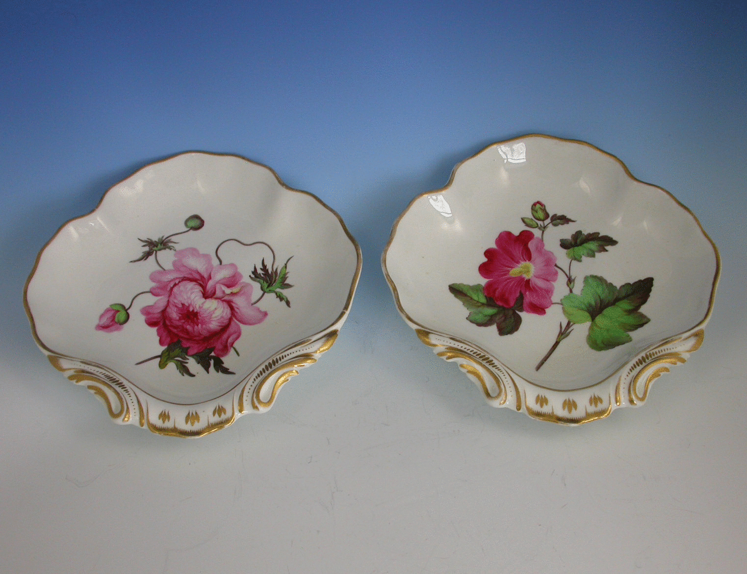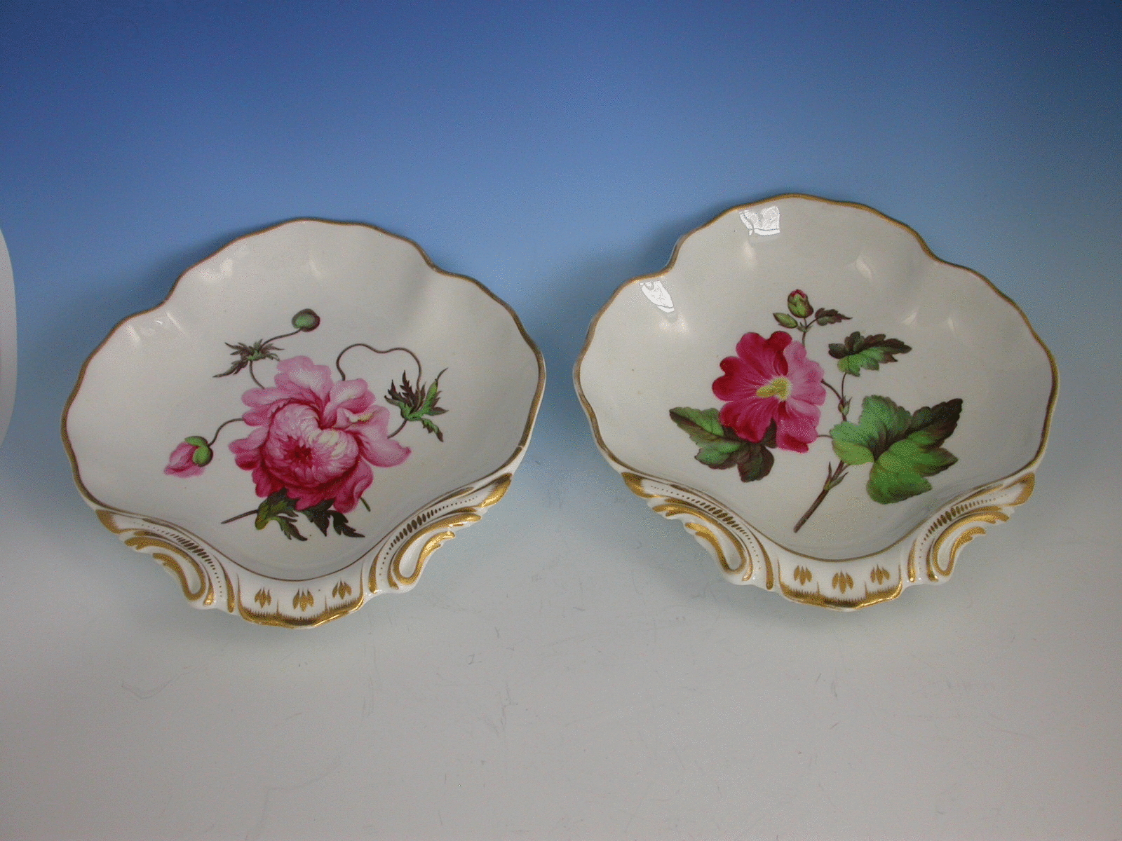A good pair of Derby shell shaped Dishes with gilt borders and highlights, one painted with Anemone the other with Althea Fintex.