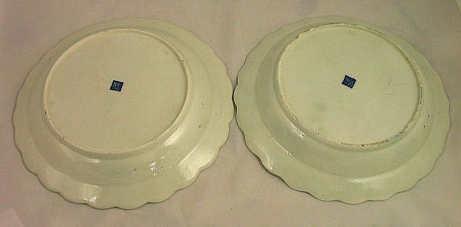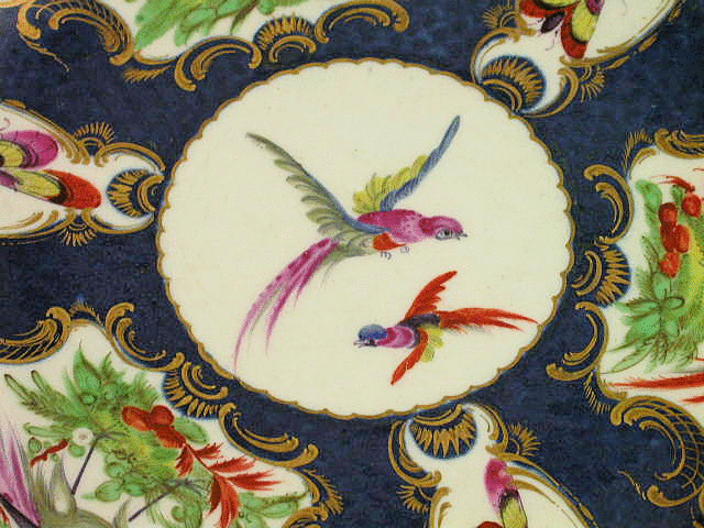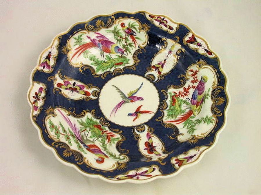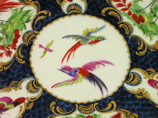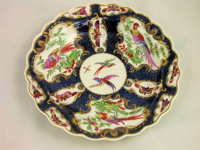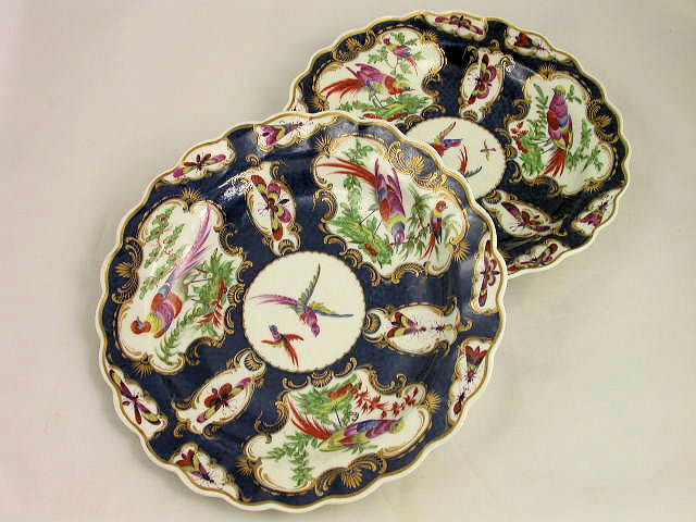 A very fine pair of Dr Wall Worcester ‘Scale Blue’ Dessert Plates of fluted form, painted in the vase and mirror shaped gilt enriched reserves with Exotic birds and insects.