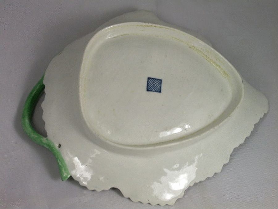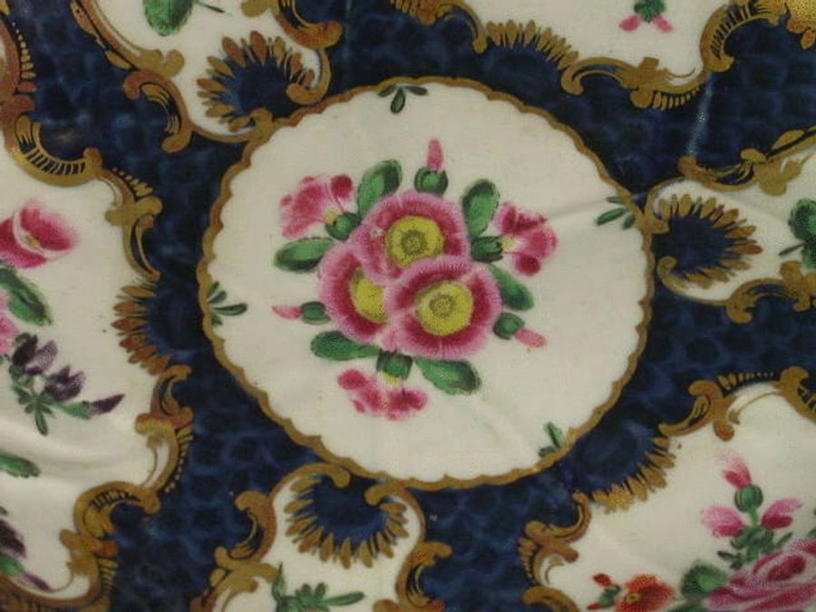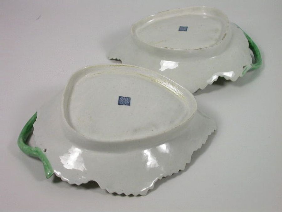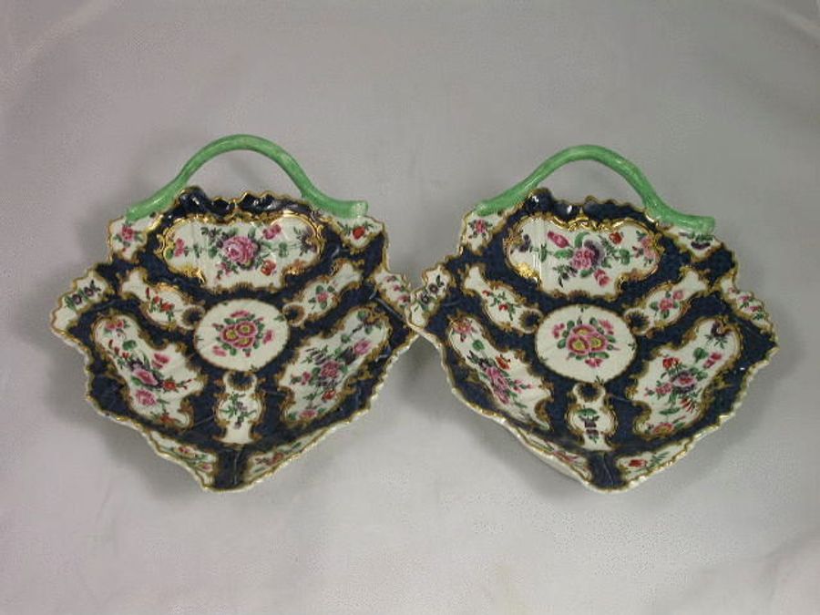 A fine pair of Dr Wall Worcester leaf shaped dishes with green twig handles, painted on a scale blue ground with gilt enriched vase and mirror shaped reserves with sprays and bouquets of European flowers .