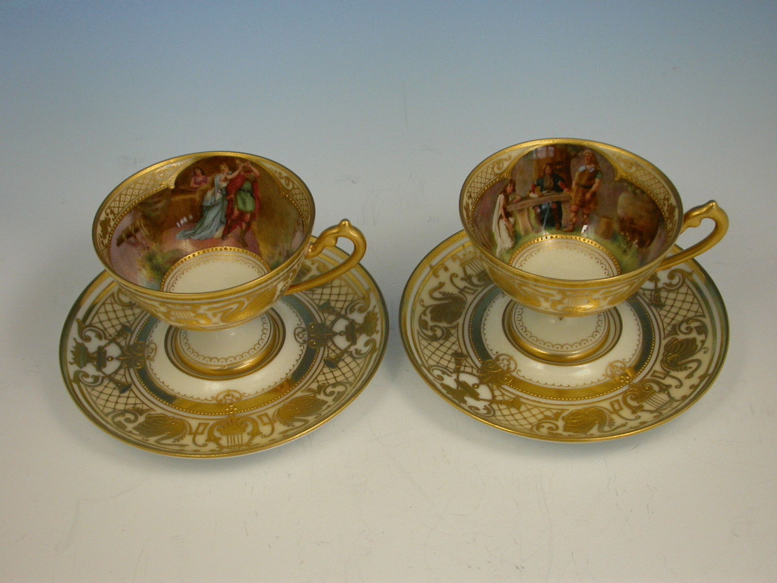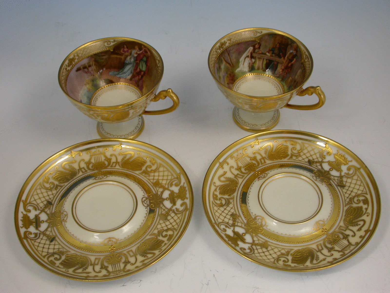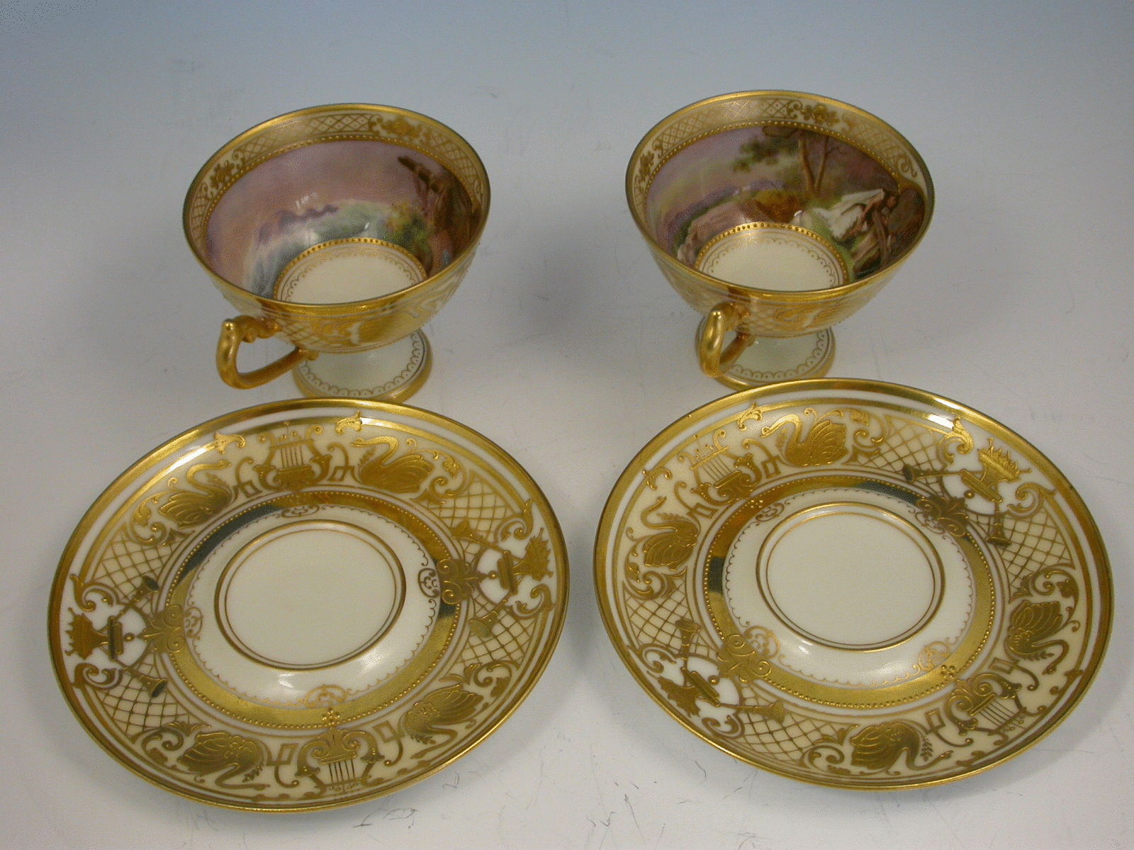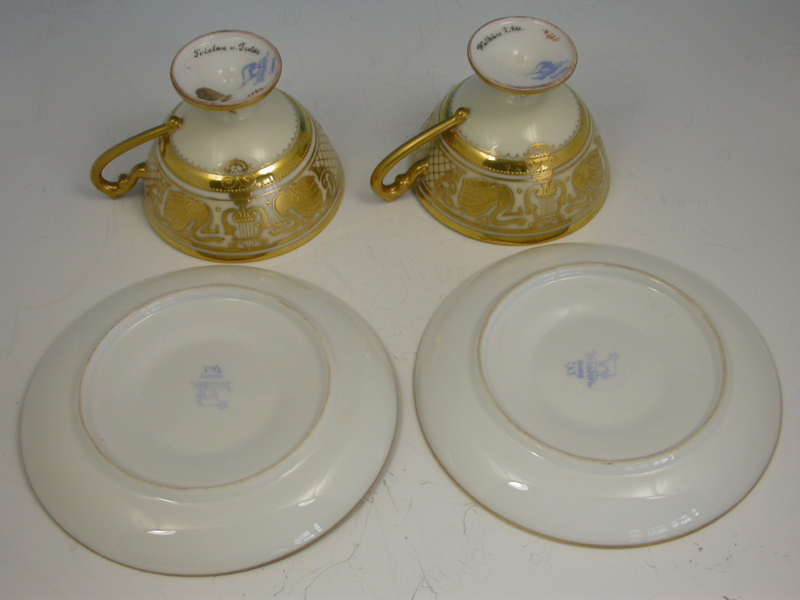 A fine pair of late Dresden Cabinet Cups and Saucers with scrolled loop handles, the interiors of the cups painted with European classical landscape scenes, one with Tristan and Isolde, the other with Die Walkure, within intricate gilt borders, the exterior with raised ciselle gilding depicting a lyre between two swans, on pedestal bases.