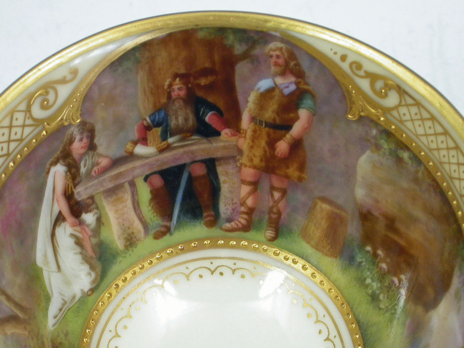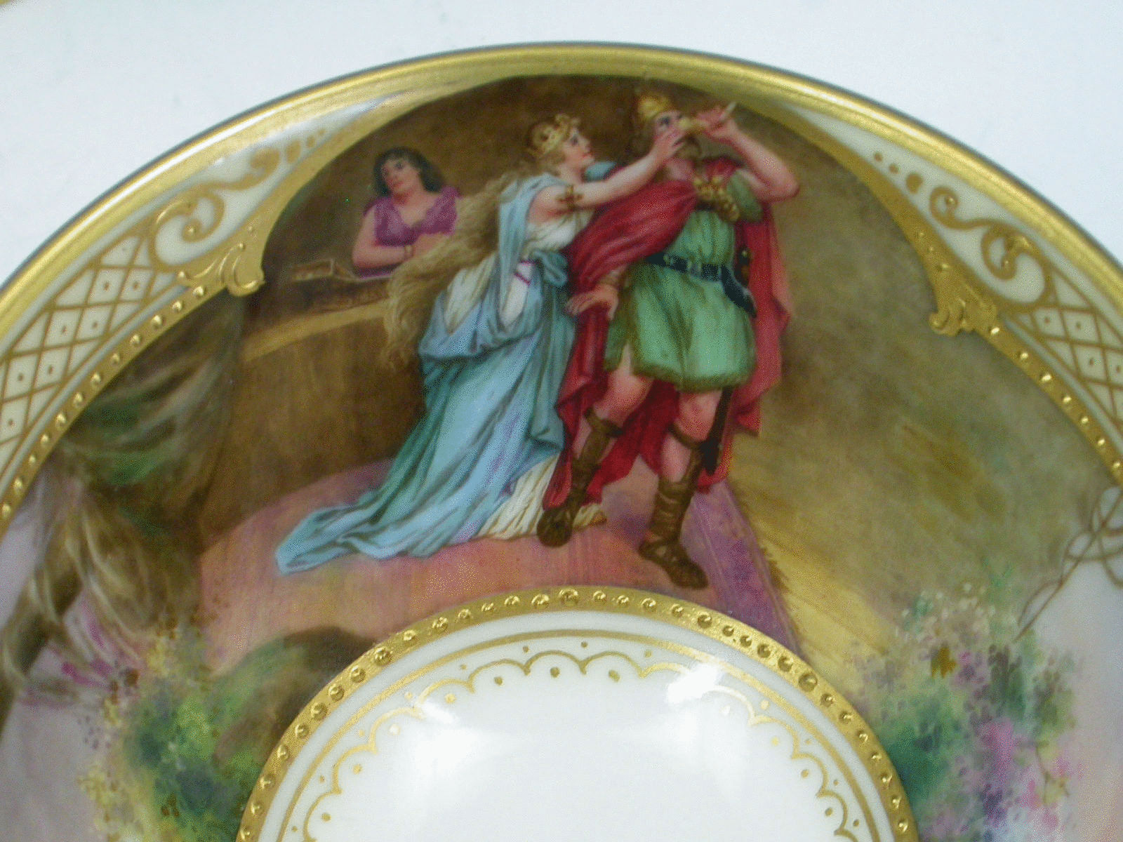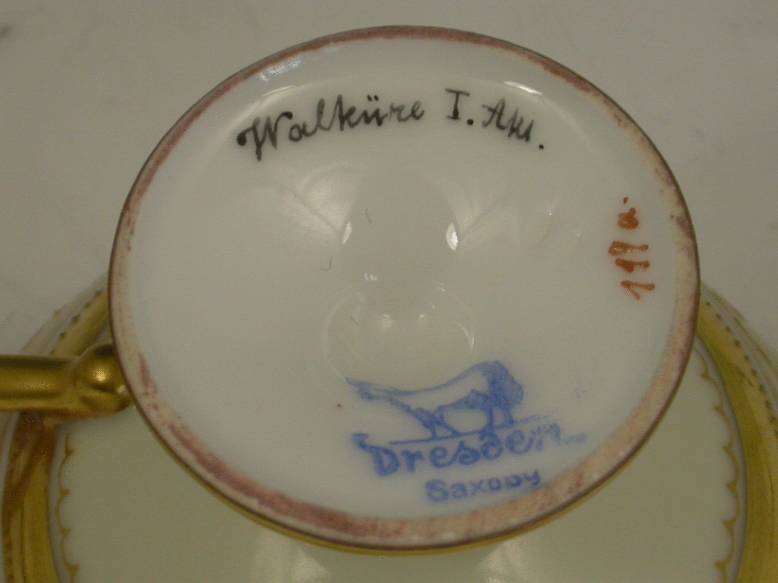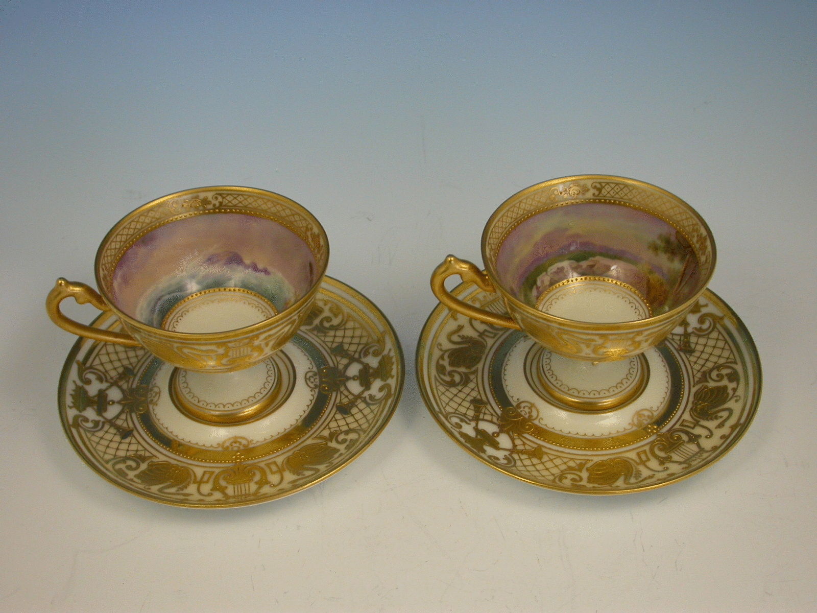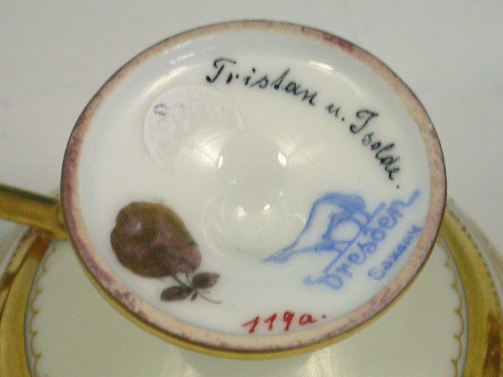 A fine pair of late Dresden Cabinet Cups and Saucers with scrolled loop handles, the interiors of the cups painted with European classical landscape scenes, one with Tristan and Isolde, the other with Die Walkure, within intricate gilt borders, the exterior with raised ciselle gilding depicting a lyre between two swans, on pedestal bases.