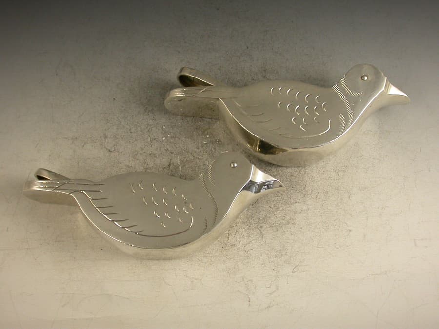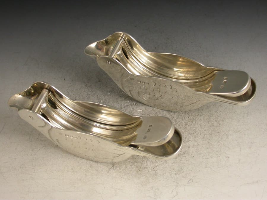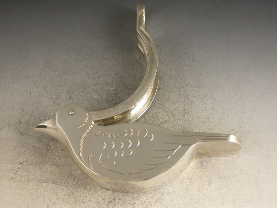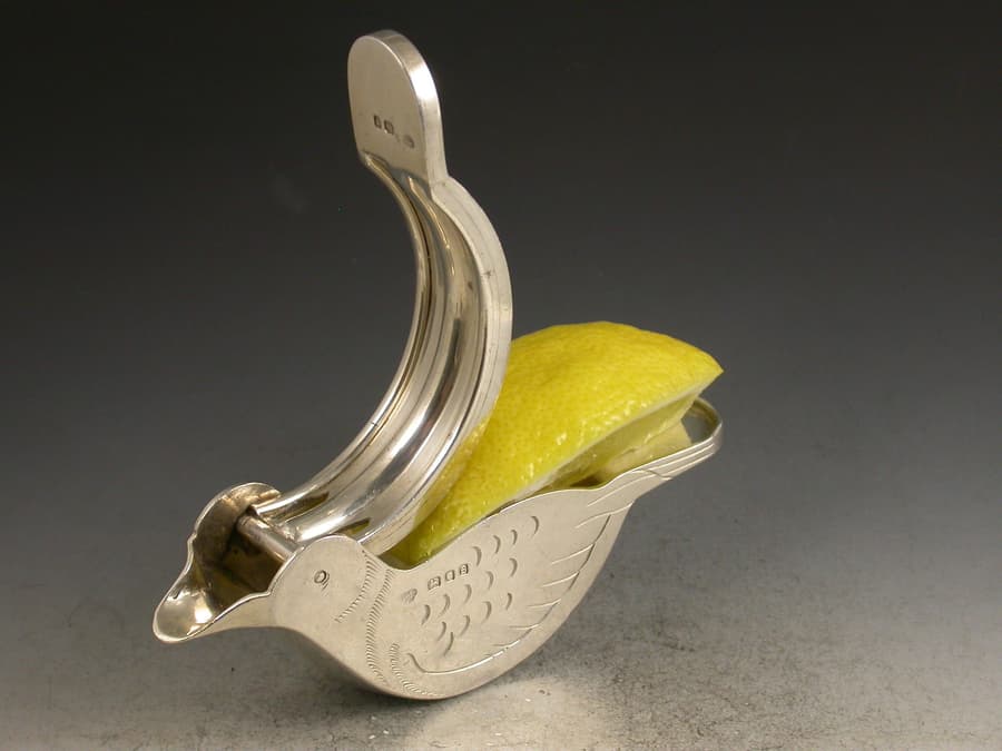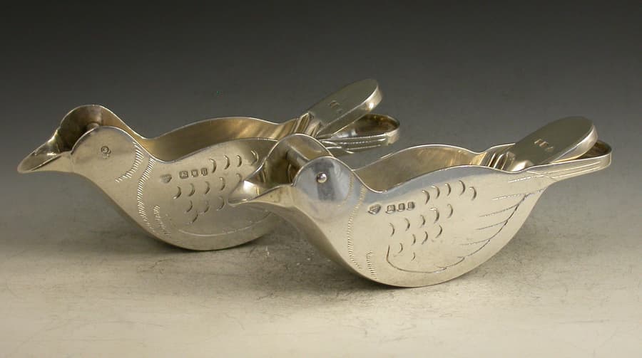 A rare and unusual pair of novelty silver Lemon Squeezers made in the form of Doves, a pin through the birds eyes forming a hinge which allows the squeezers to be operated. Realistically engraved with feathers.