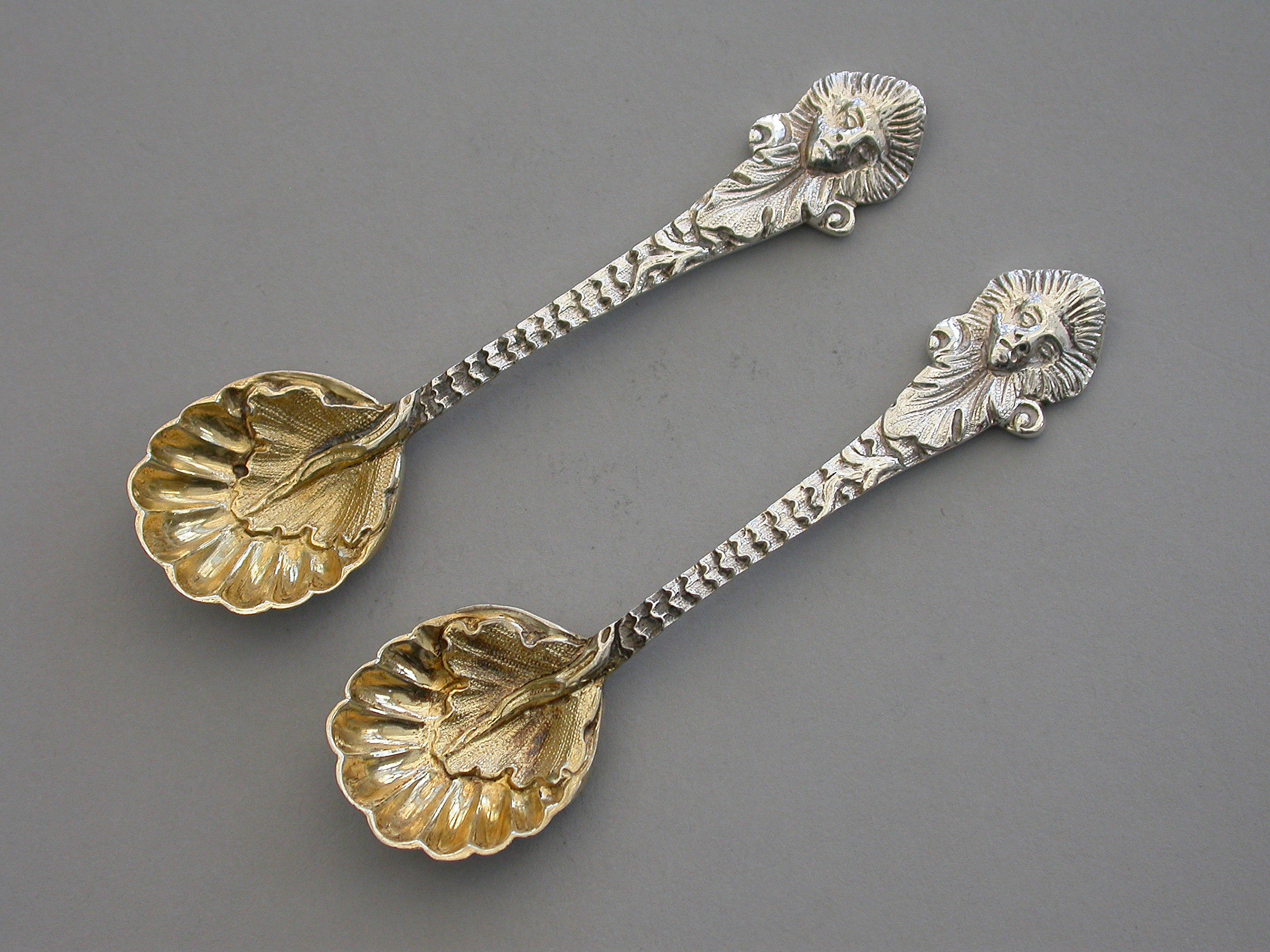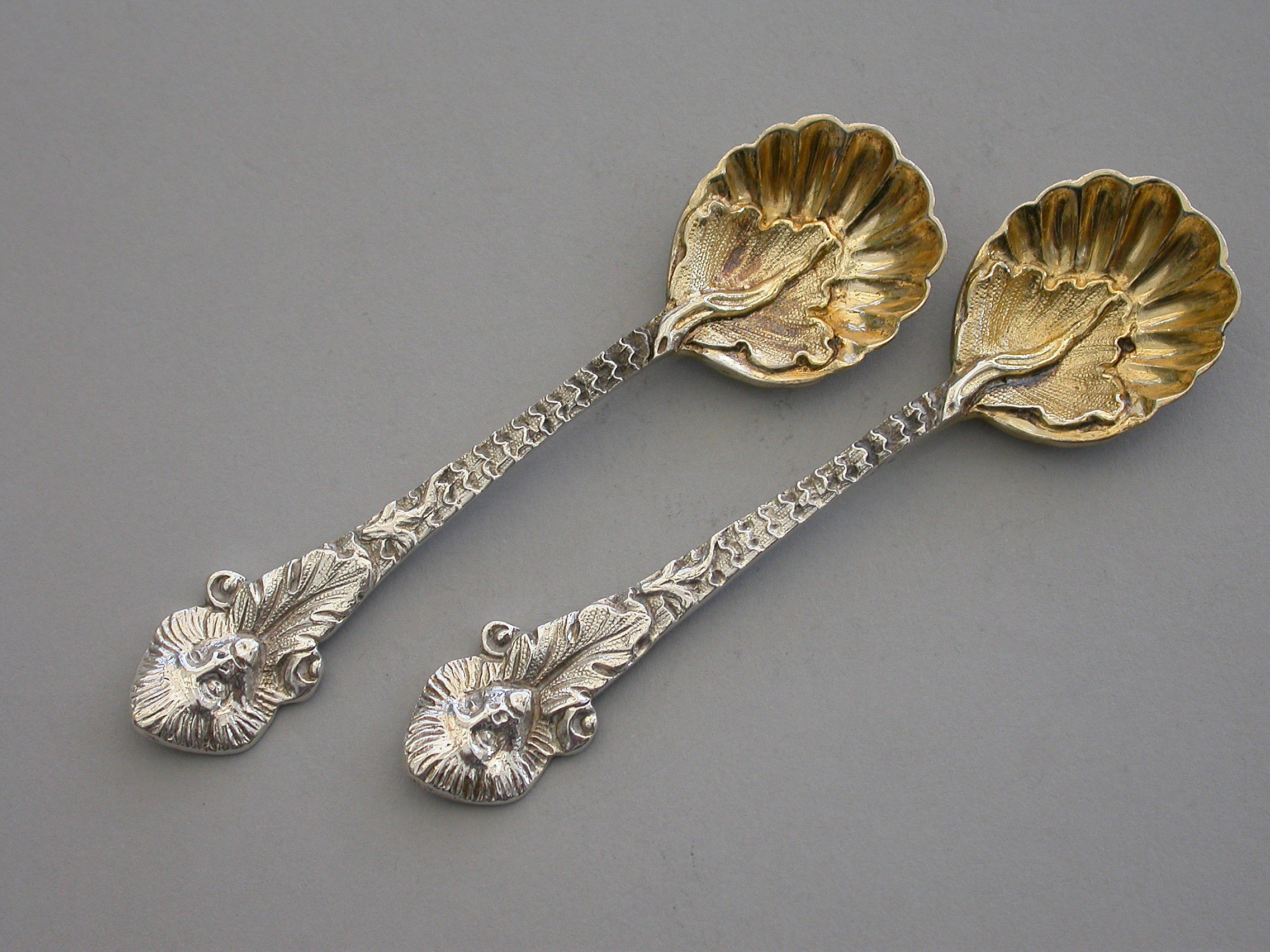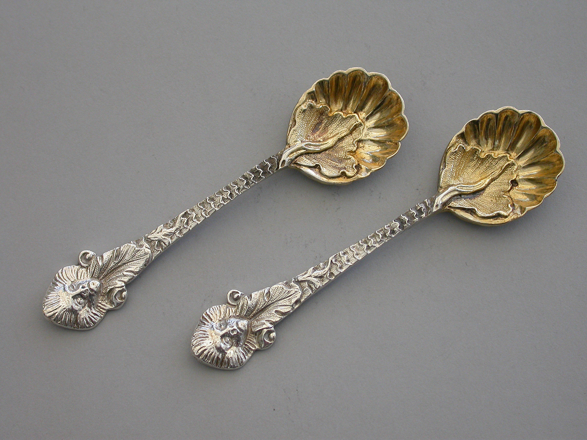 A pair of early 20th century cast silver parcel gilt Salt Spoons with leaf capped fluted shell shaped bowls, the quilted stems terminating in foliate mask heads.