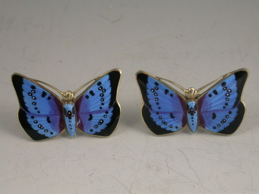A pair of early 20th century cased silver gilt and enamel Menu Holders made in the form of butterflies, with finely detailed blue, purple and black guilloche enamel decoration. Complete with original Harrods silk and velvet lined red leather case.