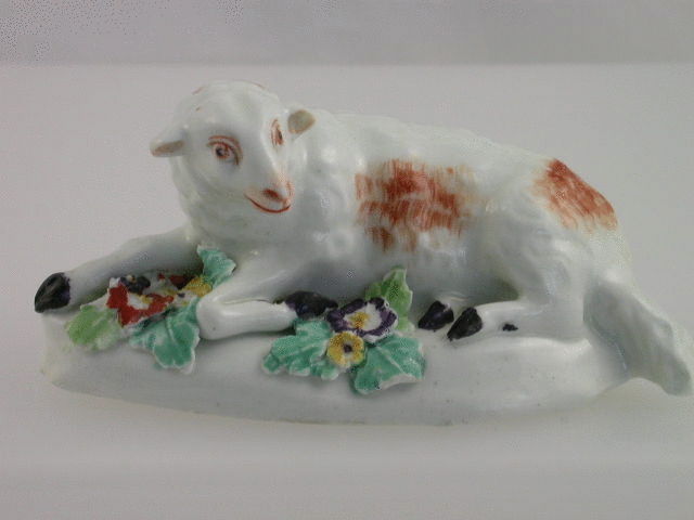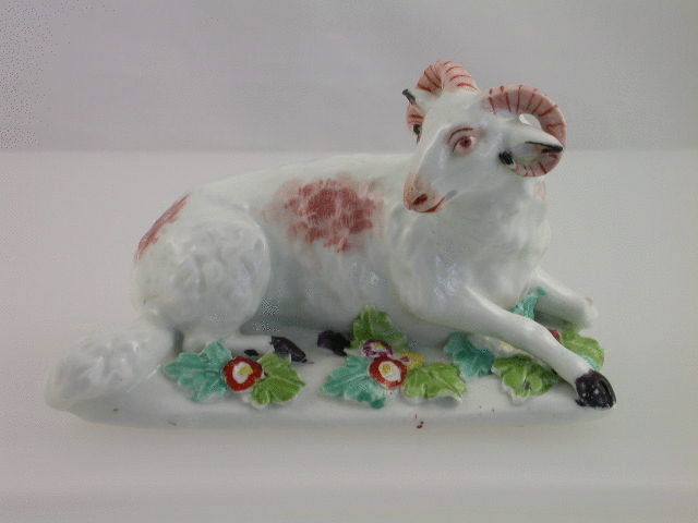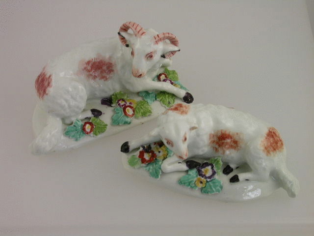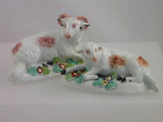 A very early and rare pair of Derby Figures depicting a recumbant Ewe and Ram, on scroll moulded bases, highlighted in polychrome enamels. c1756-57.
