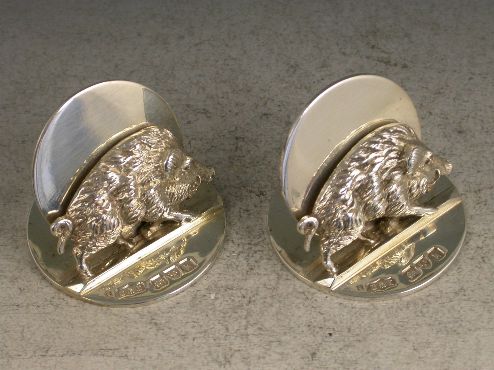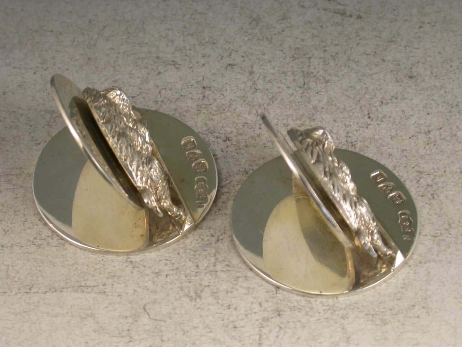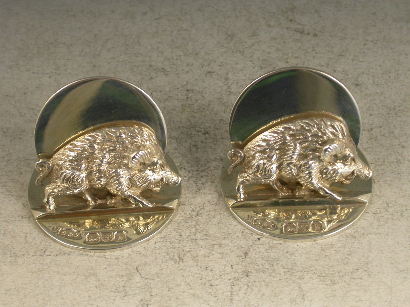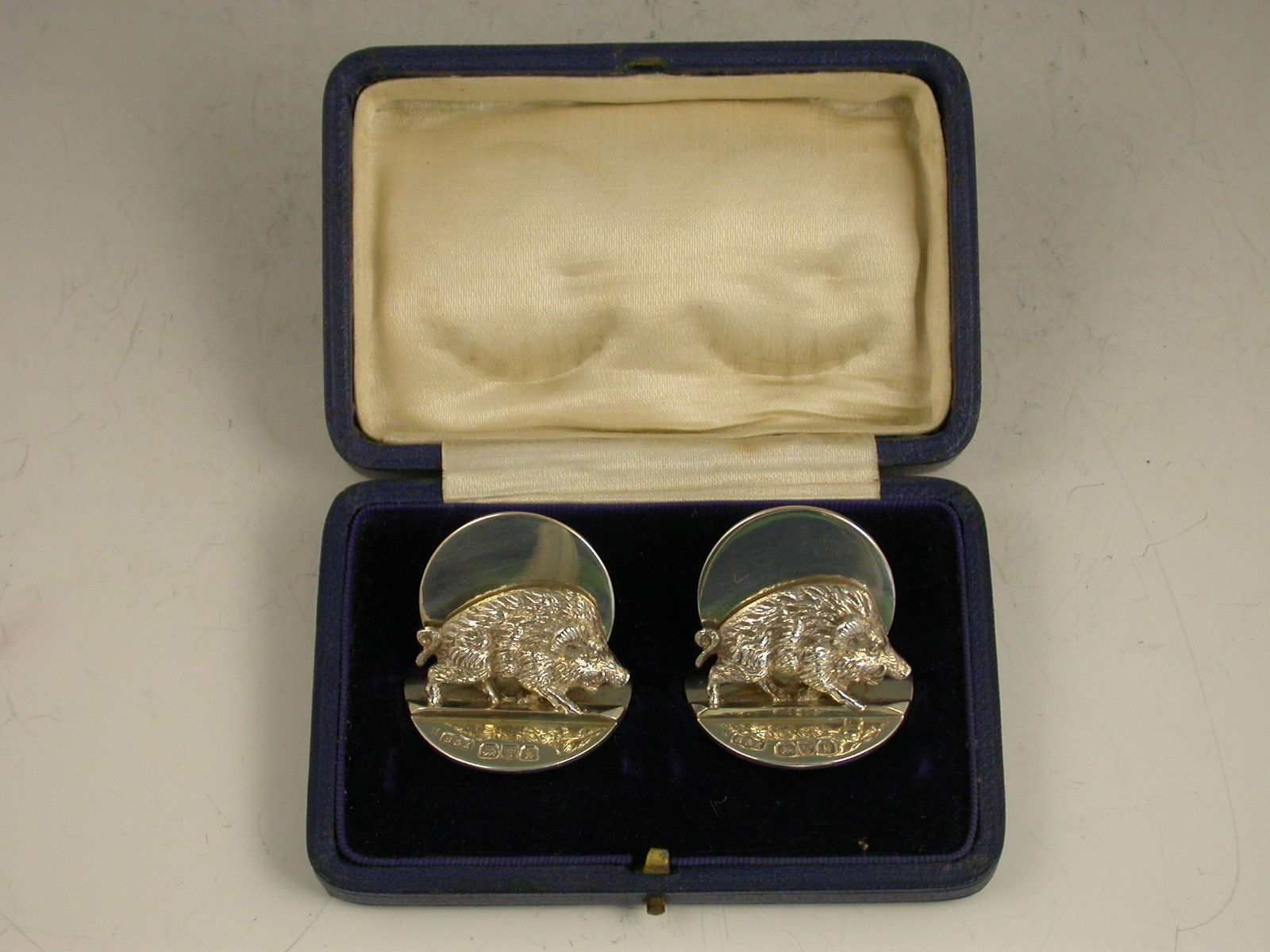 A fine quality pair of Edward VIII silver Menu Holders with applied cast silver figures depicting running Wild Boars, on flat circular bases with circular stands. Complete with silk and velvet lined leather case.