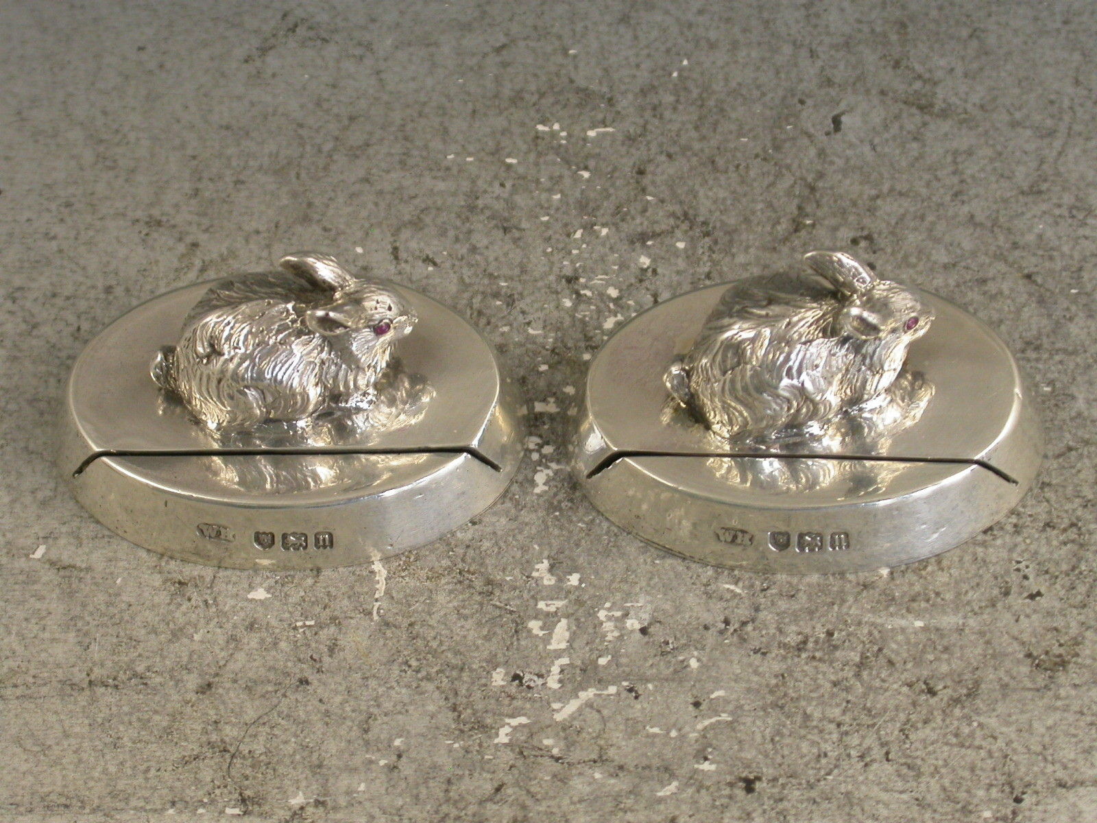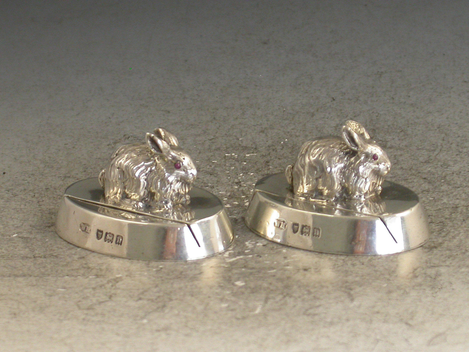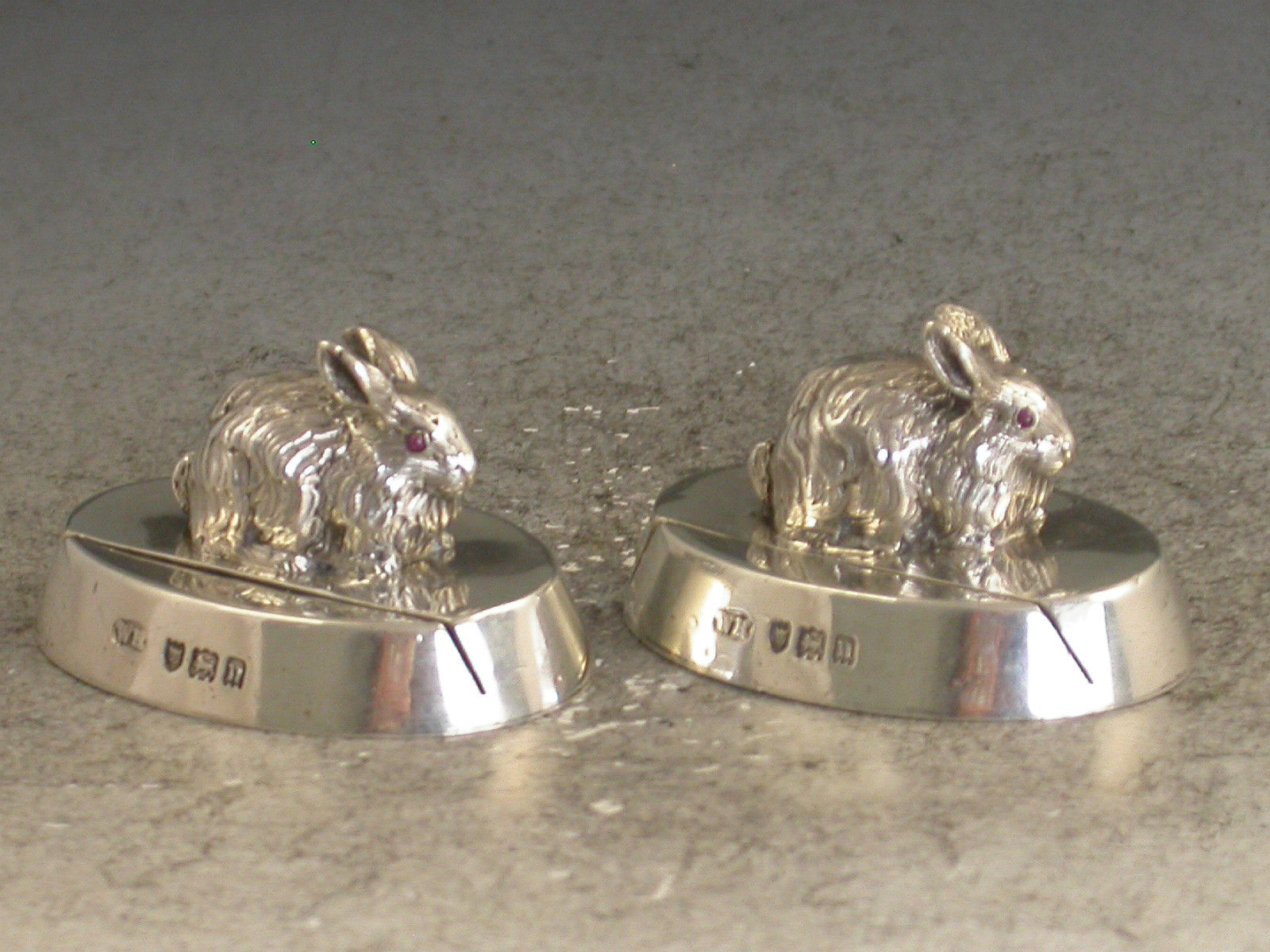 A fine quality pair of Edwardian cast silver Menu Holders formed as crouching rabbits, on slotted oval bases, complete with red glass eyes.